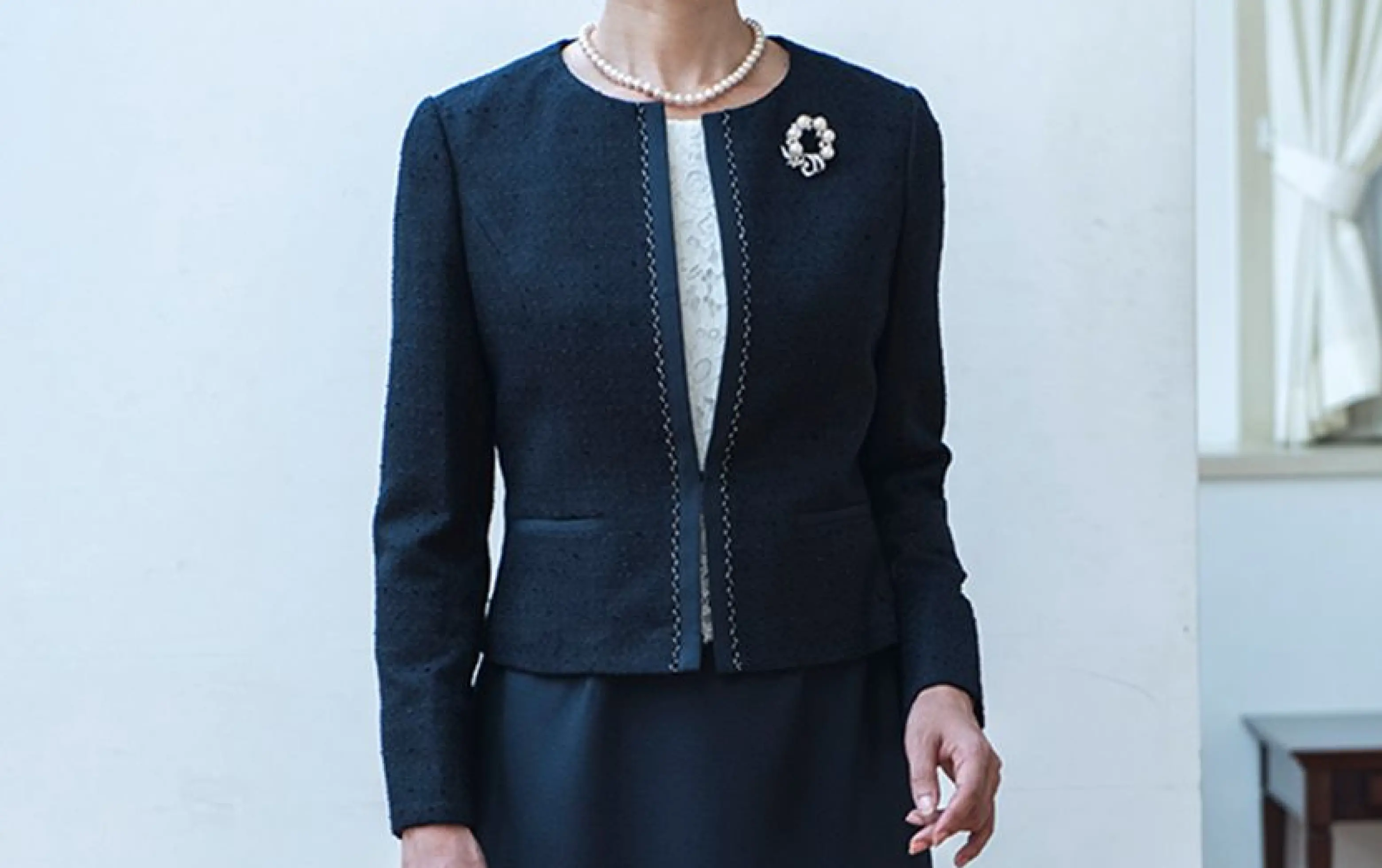 セレモニースーツのジャケットに迷ったときは、定番のツイード素材やノーカラーデザインを選ぶと間違いなし。