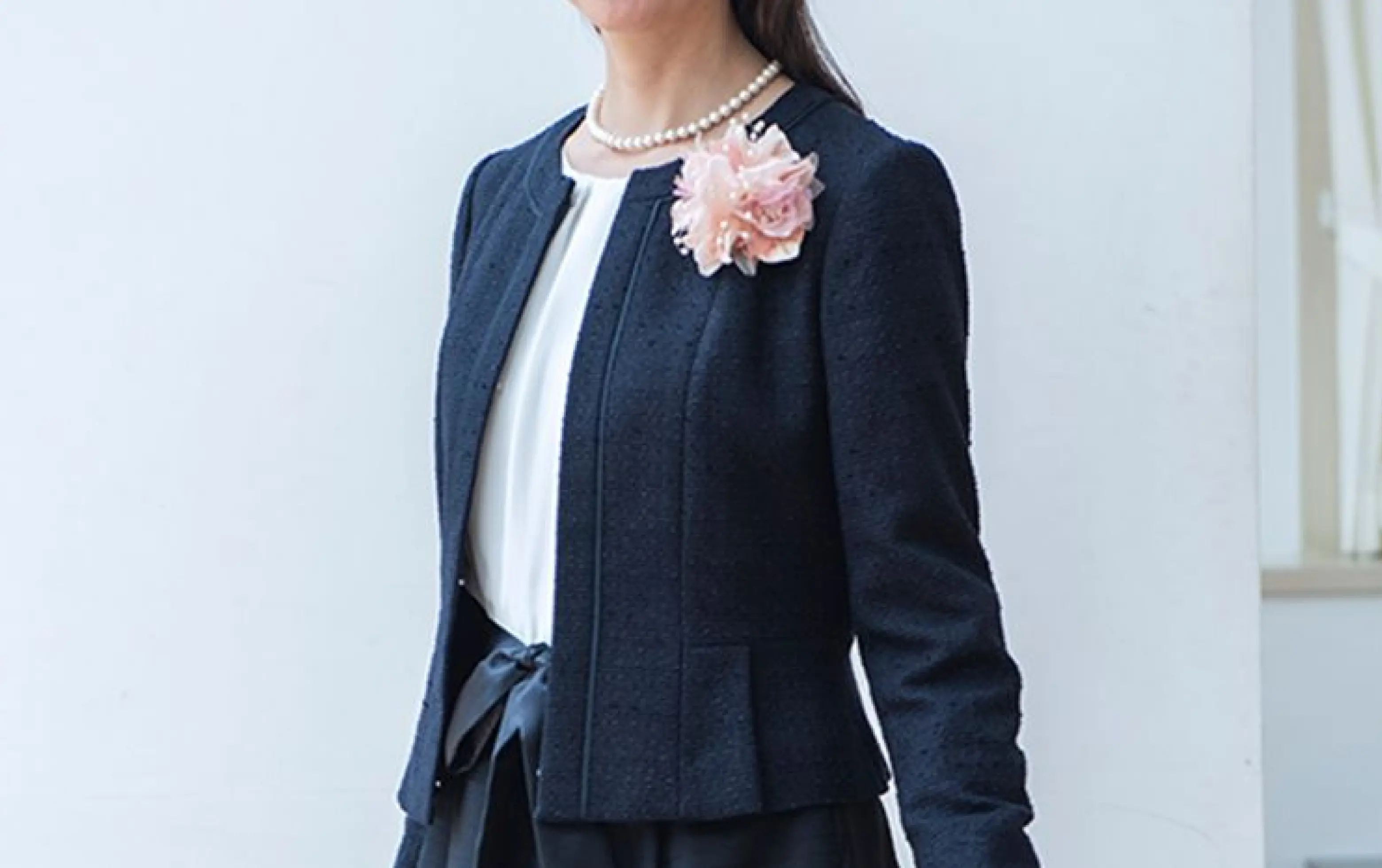 セレモニースーツが決まったら、コサージュやネックレス、ブローチを合わせてエレガントな着こなしを完成させましょう。