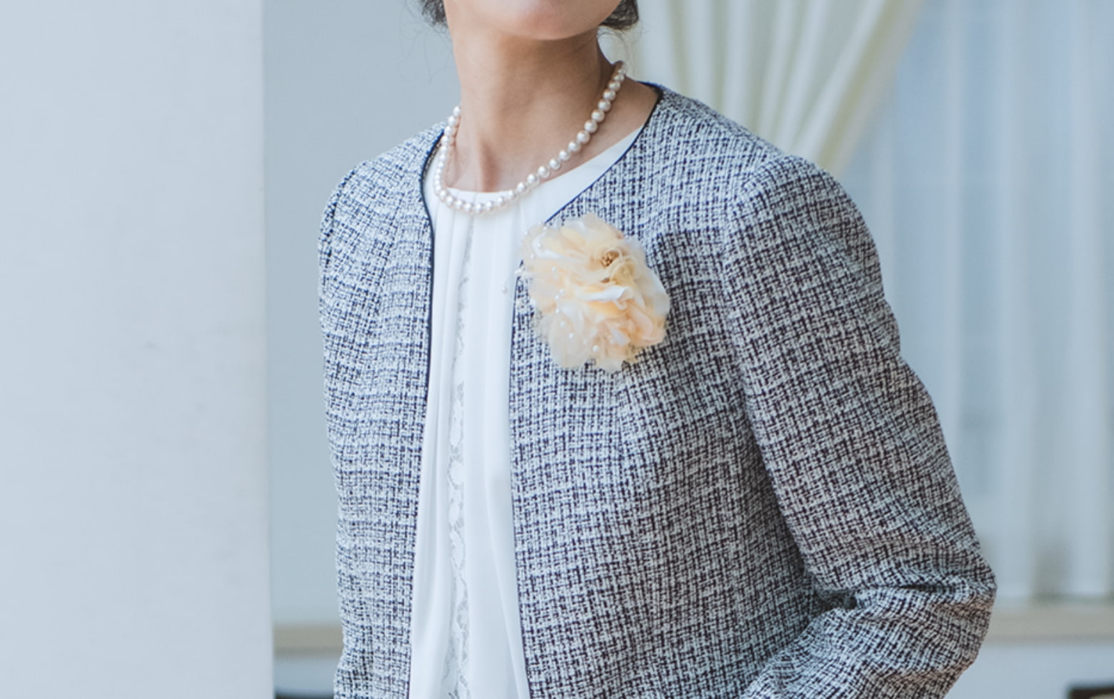 セレモニーシーンでのアクセサリーは上品なホワイトパールや、控えめな宝石などがおすすめ。弔事を思わせるブラックパール、輝きが強すぎるアクセサリーは控えるようにしましょう。胸元を華やかにするコサージュやブローチは、喜びの気持ちを表すアイテム。スーツに合わせて素敵にコーディネートを!