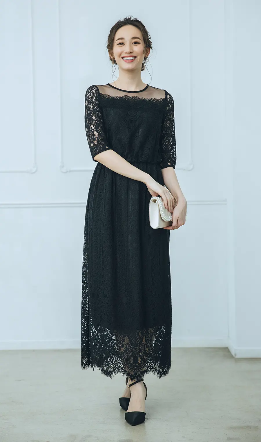 腕や脚の露出が少なく、気品あふれるデザインのロングドレスです。レース素材やシアー素材で華やかな印象を与えるから、黒一色でもお祝いの場にふさわしいコーディネートが簡単。ウエストゴム仕様だから長時間の着用でも苦しくなりにくく、腰の位置がわかるIラインシルエットがスタイルアップも叶えます。