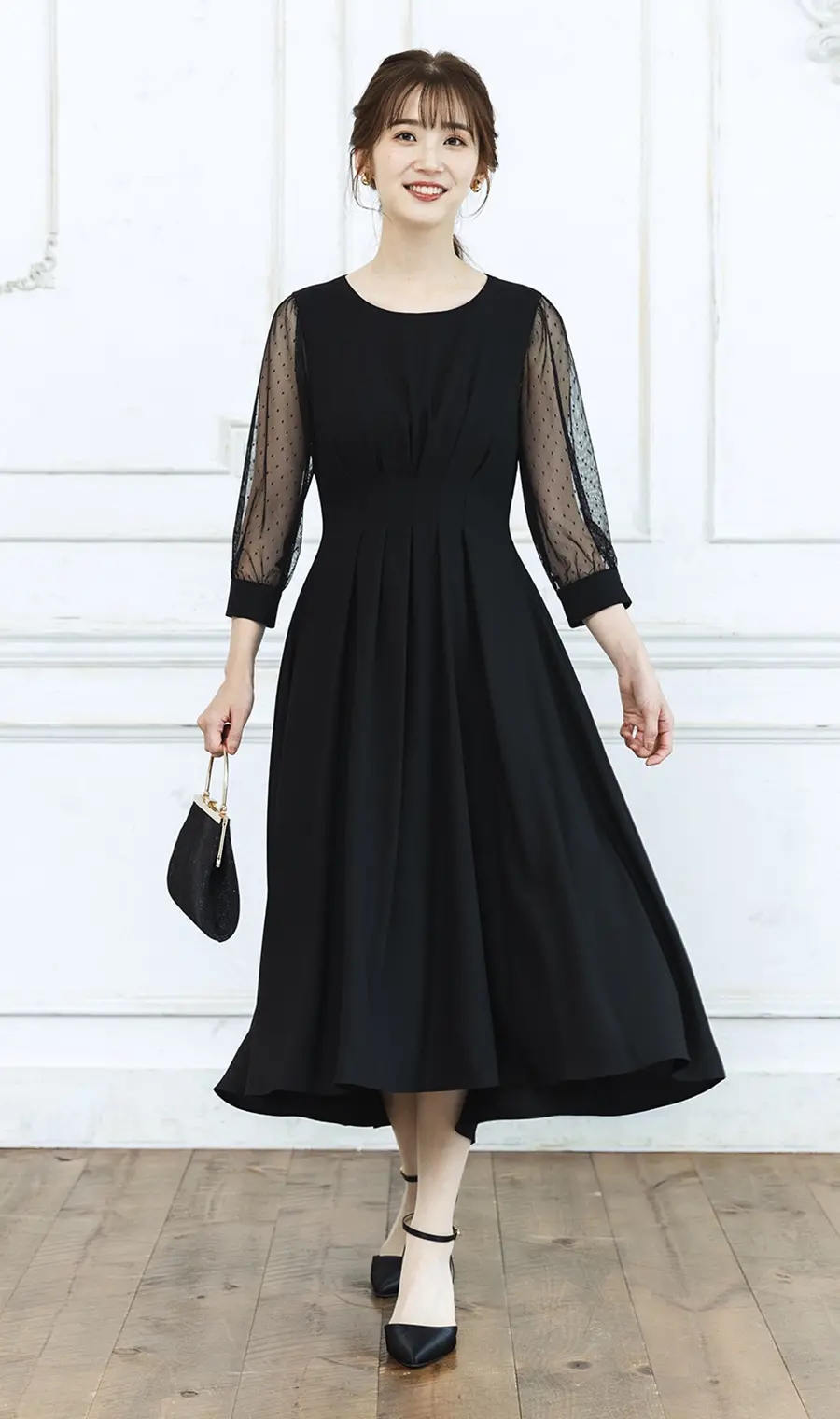 シックなブラック×愛らしいドットチュールが、レディライクな雰囲気を引き立てるセミアフタヌーンドレスです。動くたびにふわりと広がるスカートの裾は、後ろが長いこだわりライン。高め位置のウエストタックが叶えるフィット&フレアシルエットが、格式高い結婚式シーンで優雅に映えます。
