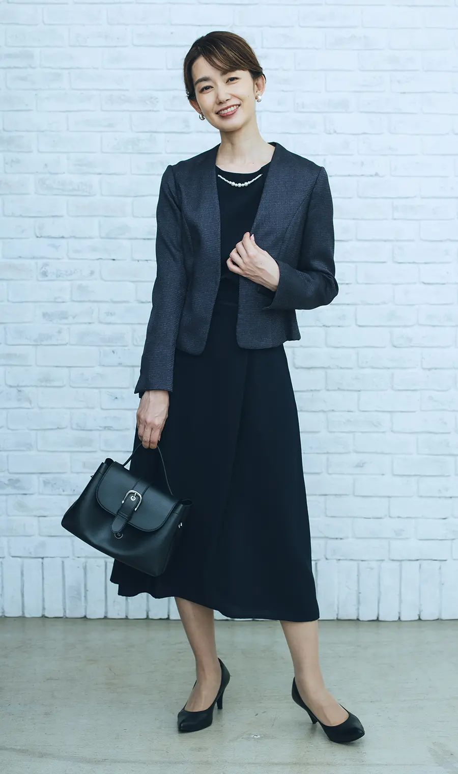 厳かな式典での服装は、色数は多いよりも少ない方が洗練された印象を与えます。いろんなカラーを組み合わせるとカジュアル度がアップするので、セミフォーマルでは小物も含めて2~3色に絞るのがおすすめ。