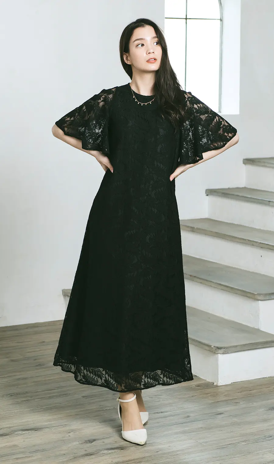 さりげない透け感で女性らしさ満開。リーフ柄の繊細レースをふんだんに使用した細身シルエットのAラインワンピースです。パッと遠目にはシンプルなブラックワンピースに見え、「きちんとしたドレスを選びたいけど、会社の式典で華やかすぎるのは気後れする」という方でも選びやすいデザイン。フレアスリーブが気になる二の腕をカバーします。
