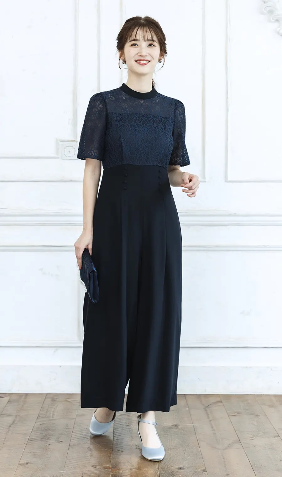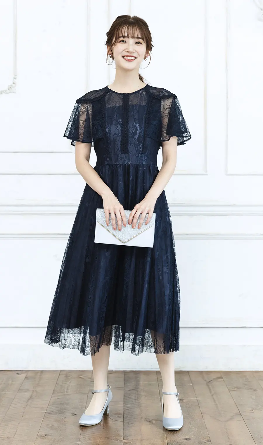 重なるレース素材が、露出を抑えながらも軽やかさを演出し、暖かな季節のフォーマルシーンに映えるひざ下丈のドレスです。厳かな式典ではダークカラーを選びがちですが、ネイビーカラーなら黒ほど重くならず上品にまとまるのでおすすめ。下半身は肉薄レースの下にプリーツスカートを仕込んだ仕様で、繊細な重なりがリッチな表情を生み出します。