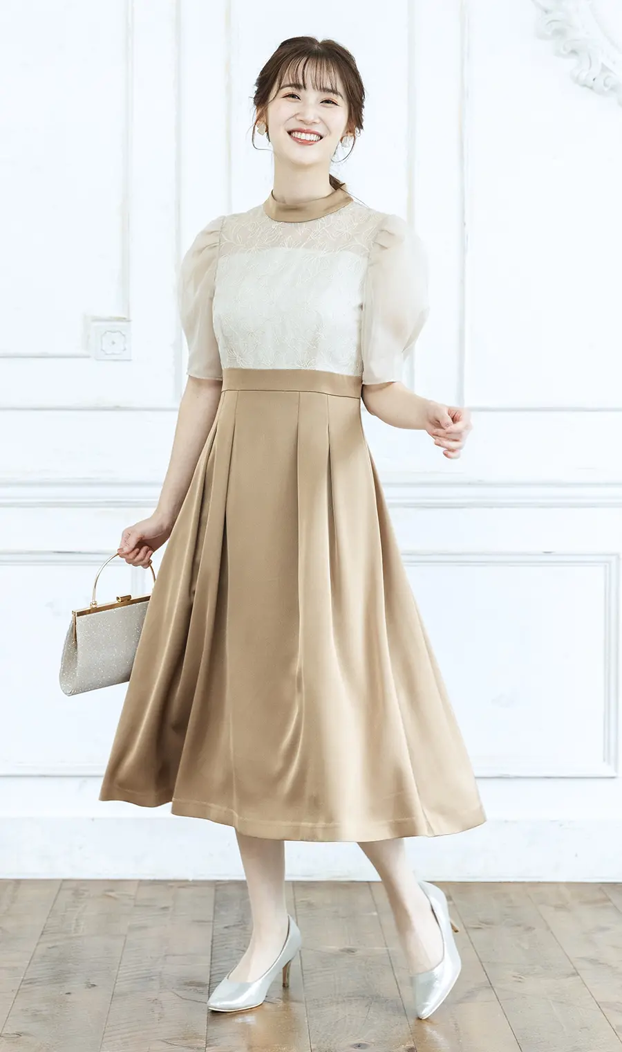 上半身にはラメ刺繍をほどこしたオーガンジー素材を使用。さりげなく光沢あるサテン素材のスカートとの組み合わせが上品なドレスです。デザインのポイントは、顔映りの良いやわらかなベージュカラー、襟元と袖の適度に透けるあしらい。絶妙にキュートな袖パフとフレアな裾が、昼の時間帯の式典にふさわしい清楚さを演出します。