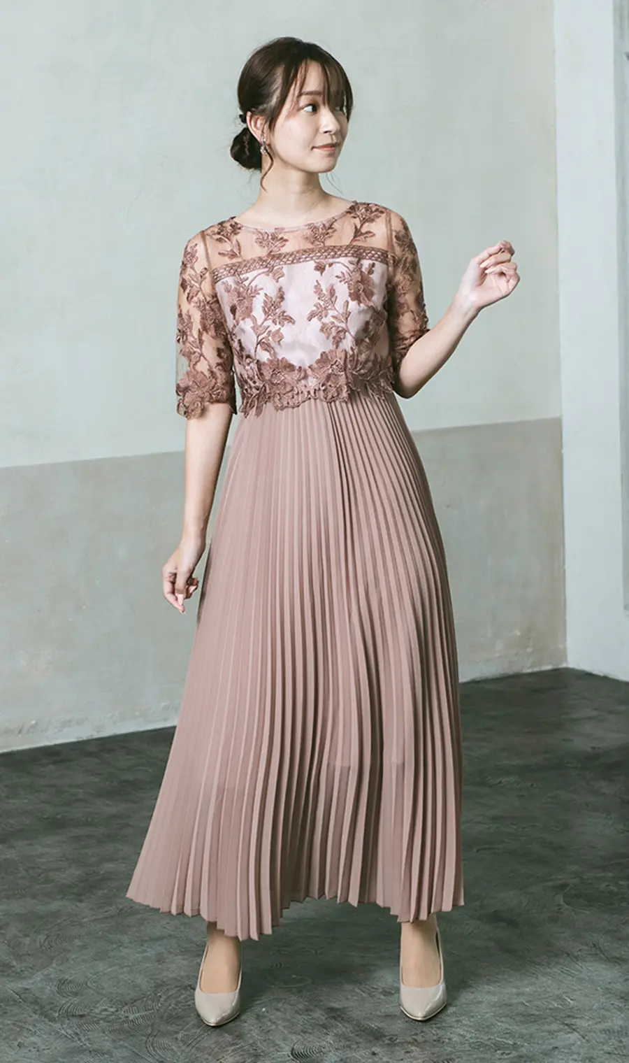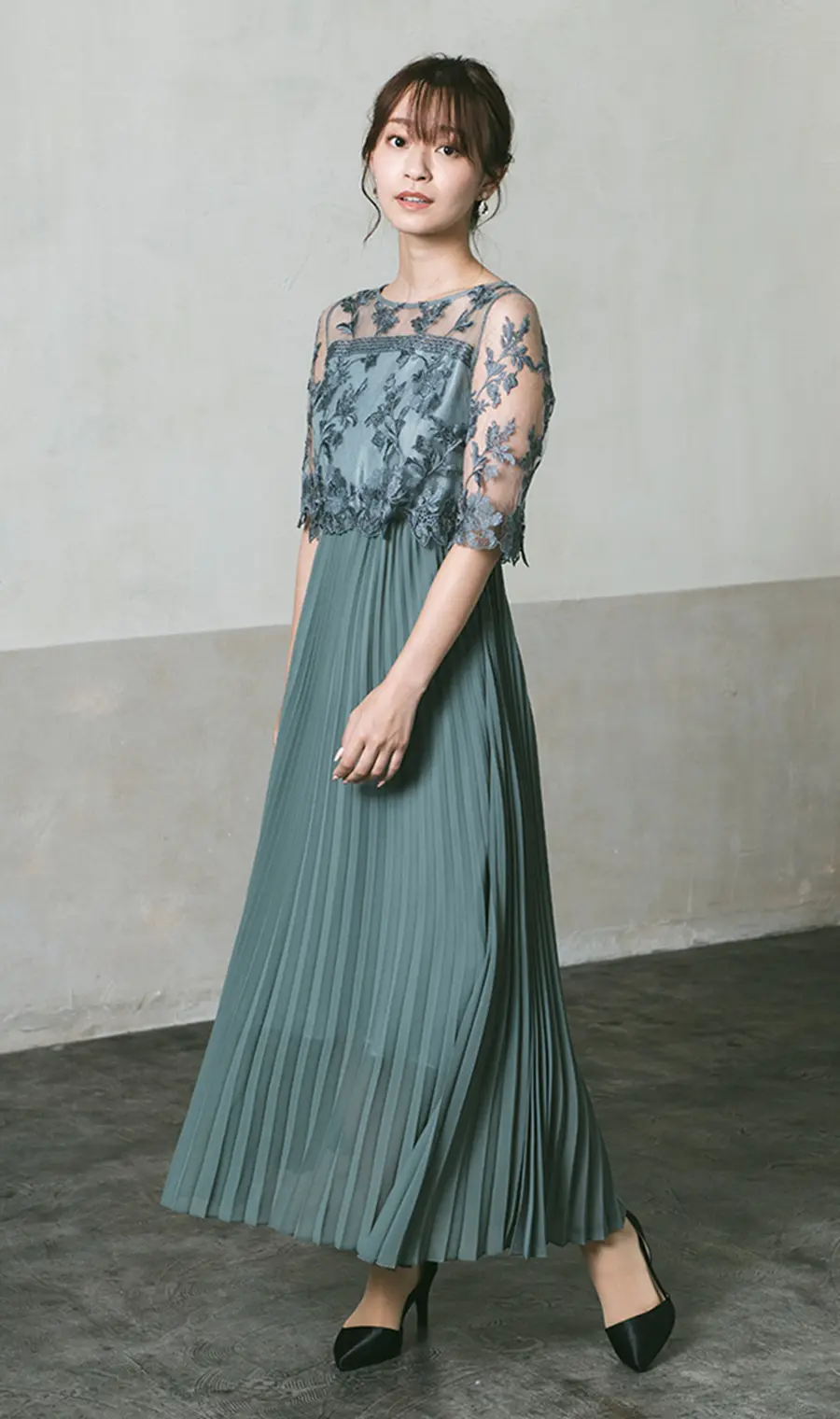 繊細な刺繍レースと細かなプリーツのロングドレス