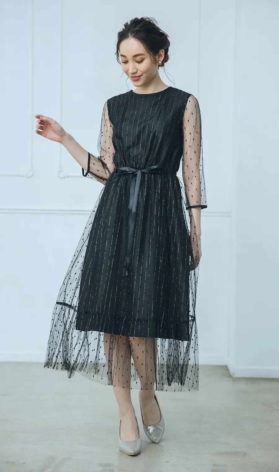 華やかな場にふさわしいドレッシーな存在感が魅力。シックなブラックドレスを二重仕立てで軽やかにデザインしたセミフォーマルドレスです。シアーなチュールにウエストリボン、そしてキラキラ光る金糸刺繍とこだわりのあしらいを散りばめました。アクセサリーがなくても、これ1着で夜のフォーマルシーンにぴったりの華やかさをまとえます。