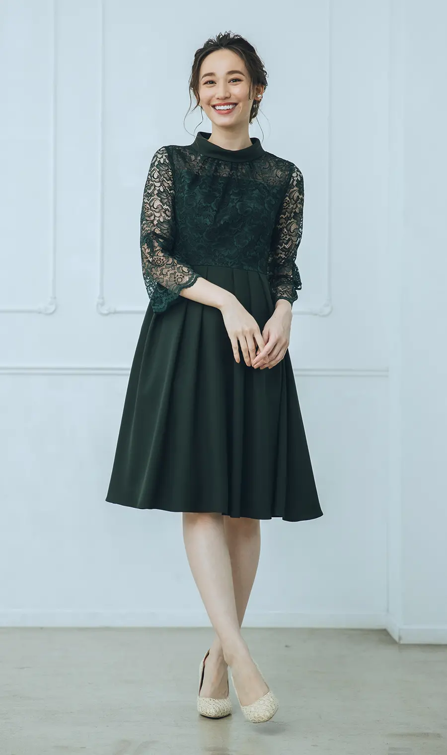 濃色のグリーンカラーが、秋が深まる頃やクリスマスが近づく冬のパーティーや会食にぴったり。可愛らしさとエレガントさを兼ね備えたセミフォーマルドレスです。クラシカルなロールネックがデコルテを隠し、繊細レースの七分袖が腕を覆うので寒々しさがありません。また、上身頃のラッセルレースは、ロールネック下にギャザーが施され、胸元が透けすぎないようになっています。