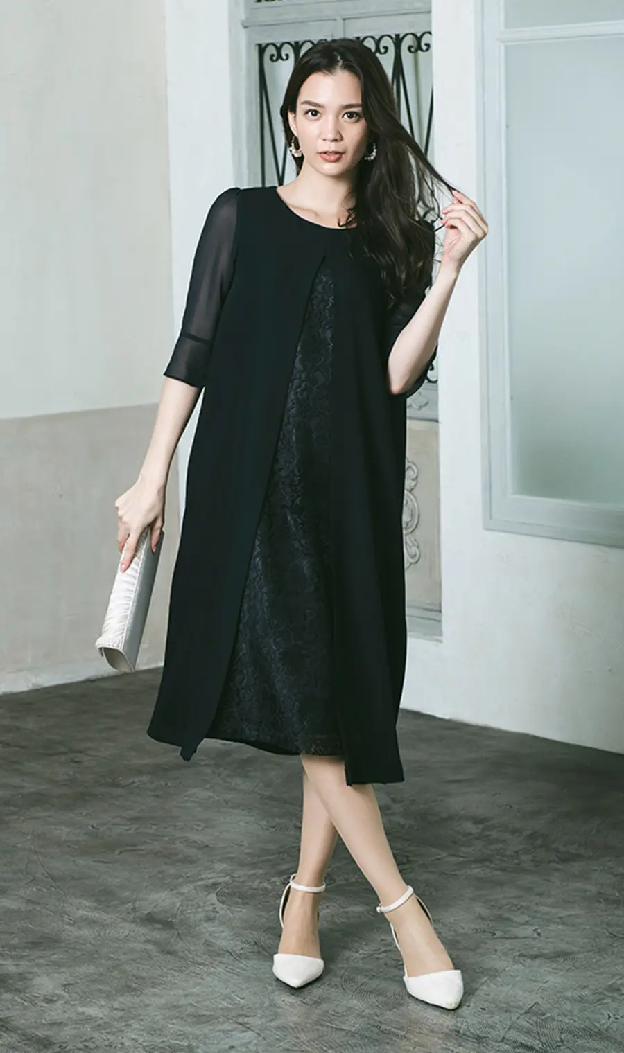繊細なレース生地×きれいめツイル生地の組み合わせが上品なたたずまいのドレスです。まるで重ね着をしているようなレイヤード風デザインがポイント。動きに合わせて中のレースがみえることで、奥行きのあるコーディネートが薄着感を回避し、あたたかみを感じさせます。全体のシルエットはシンプルながら、品格のあるドレッシーな印象に着こなせます。