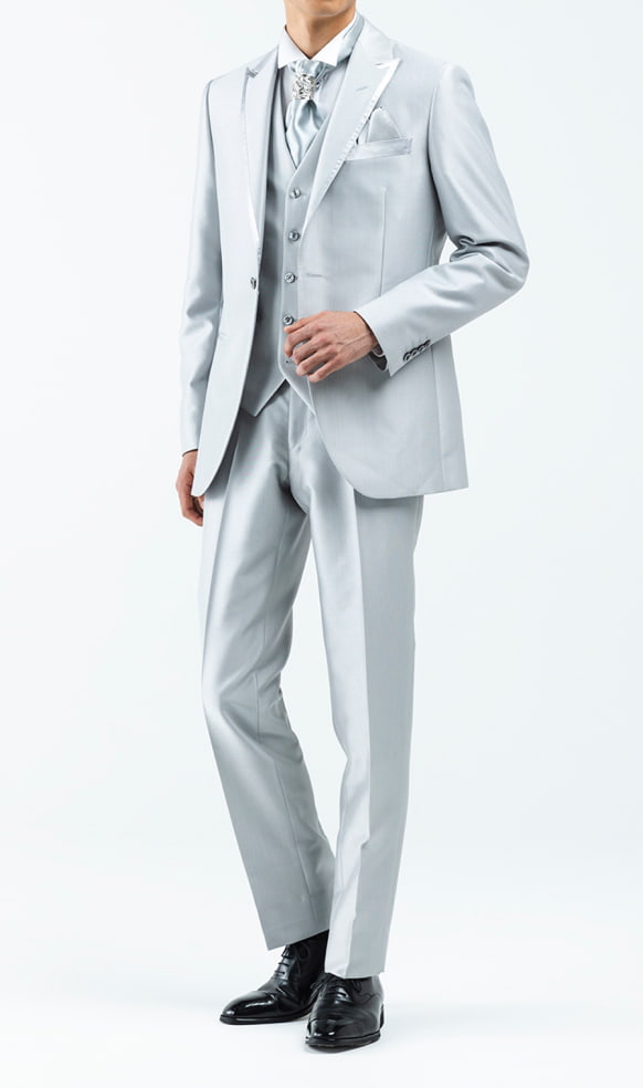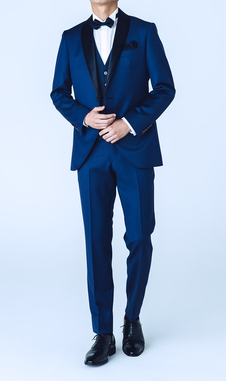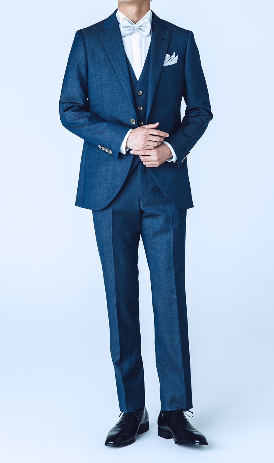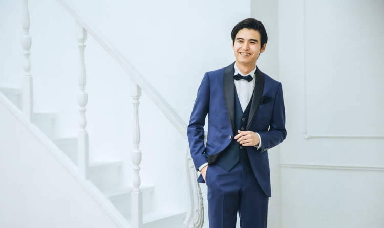 - 1.5次会は一般的に披露宴に近い形式と認知されていますので、タキシードがおすすめです。中でも「ネイビー」や「グレー」といった色を選ぶと、程よくドレスダウンできて好印象です。