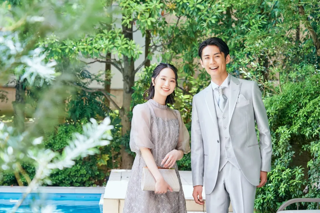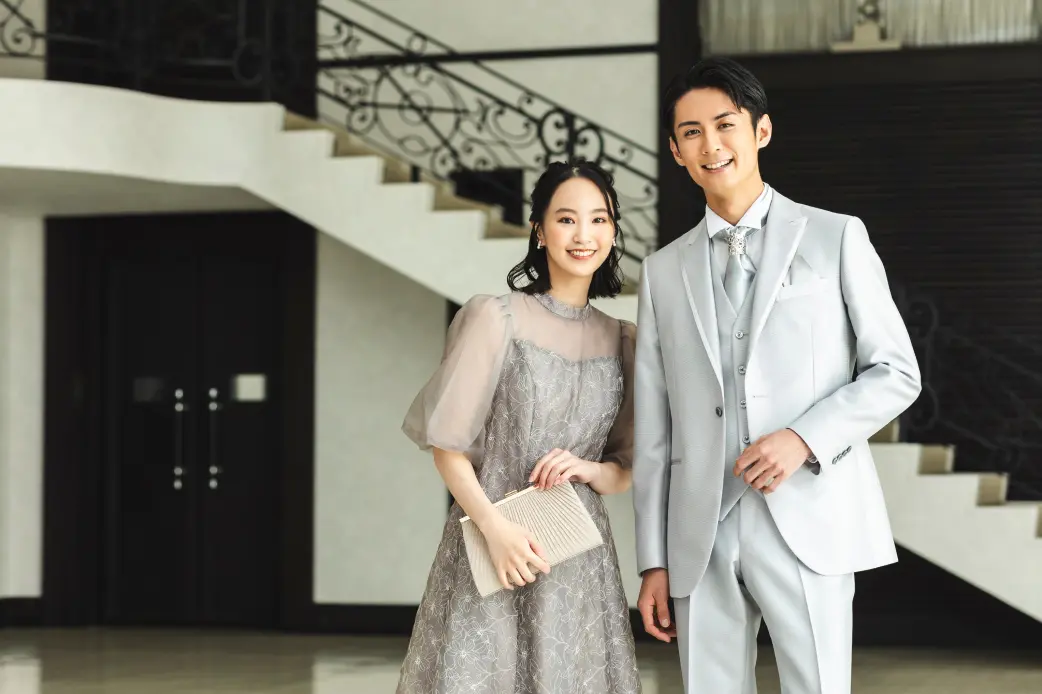 ホテルや式場など格式高めの会場で開催されるなら、ドレスアップが必須。華やかな中にもフォーマル感のある服装を選びましょう。