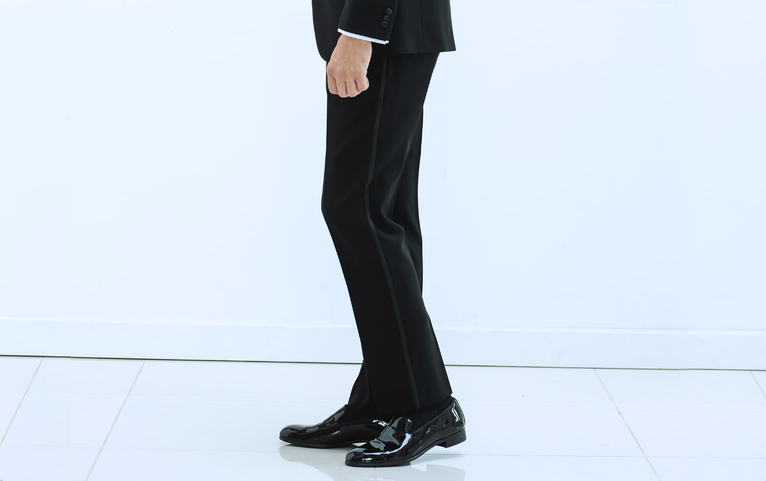 タキシードのパンツに欠かせないのが、両サイドにそれぞれ一本ずつあしらわれたライン飾り「側章(がわしょう、そくしょう)」。裾は、折り返しのないシングルが基本です。また、カマーバンド着用時にはベルトは付ける必要はありません。足元はオペラパンプスで、フォーマル度を高めましょう!