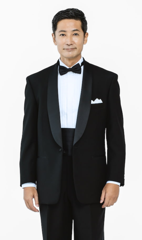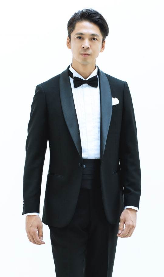 タキシードの王道であるブラックを採用。生地はシルクを使用し、上品な光沢に。