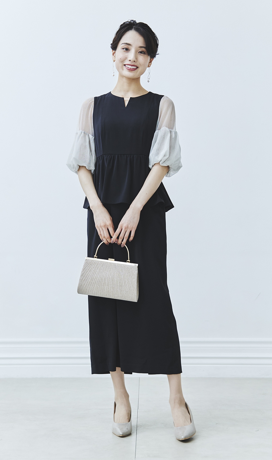 【ラメチュールバックサテンドレス】Pu混のバックサテン素材を使用したドレスです。袖部分にはラメ混のチュールを使用しています。昨今のトレンドディテールである袖ボリュームを程良く取り入れ、ウエスト部分のペプラムデザインとの相性もばっちりです。※モデルが着用しているアクセサリーは、レンタルには含まれません。【主な着用シーン】結婚式・二次会・パーティー・食事会・同窓会【モデルサイズ】身長:167cm バスト:81cm ウエスト:58cm ヒップ:85cm【着用商品サイズ】M【サイズスペック】[M]着丈:121.0cm 肩幅:33cm バスト:90.0cm ウエスト:76.0cm ※モニター・パソコン環境により色味に誤差が生じる場合がございます。※生地やデザインにより、実際のサイズと異なる場合がございます。