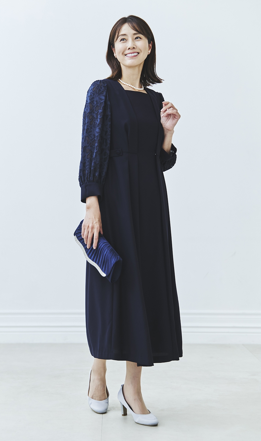 身頃にはバックサテンジョーゼットを使用し、上品な光沢と落ち感のある仕上がりに。