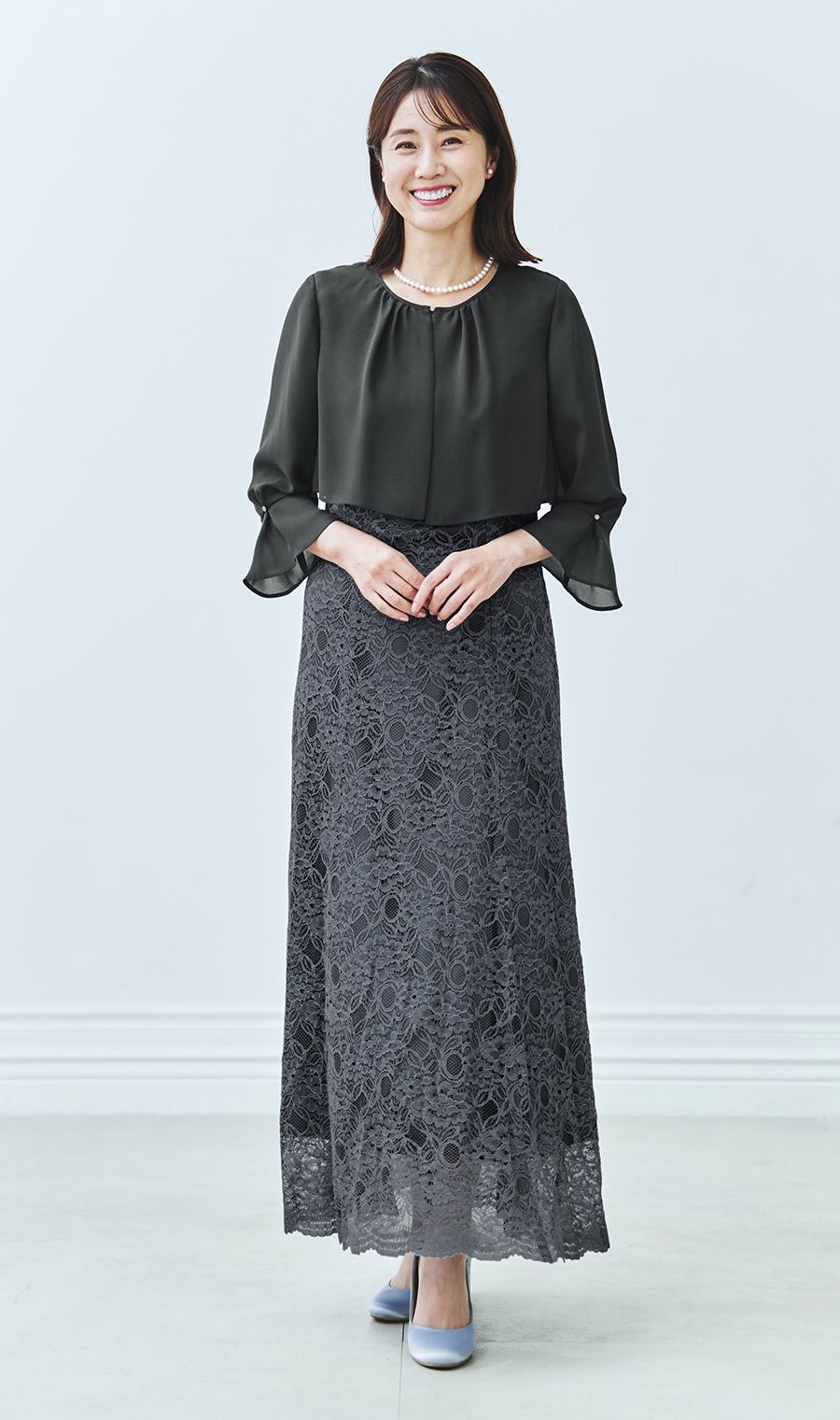スカラップレース×シフォンブラウス風マーメイドドレス上質なコードラッセルレースと軽やかなシフォンジョーゼットを組み合わせた、華やかなセットアップ風ドレス。気になる腕まわりやウエストをさりげなくカバーしつつ、美しいIラインを描くマーメイドシルエットで、エレガントな印象を演出します。ブラウスを羽織っているように見えるドッキングデザインで、前開き仕様のため着脱もスムーズ。レースは裾をスカラップカットに仕上げ、裏地にサテンを重ねることで上品な輝きを放ちます。腰回りはほどよくフィットし、裾にかけて広がるラインが大人の女性らしさを引き立てます。ブラウス部分にはシフォンジョーゼットを使用し、胸元のギャザーが美しい揺れ感をプラス。透け感のある袖の切り替えや、胸元のラインストーンホック、袖口のクリスタルボタンがさりげなく光り、フォーマルシーンにふさわしい華やぎを添えます。※モデルが着用しているアクセサリーは、レンタルには含まれません。【主な着用シーン】結婚式・パーティー・食事会・クルージング・演奏会【モデルサイズ】身長:168cm バスト:80cm ウエスト:63cm ヒップ:87cm 【着用商品サイズ】9号【サイズスペック】[ 7]着丈:125.0cm 肩幅:37.5cm バスト:92.0cm 袖丈:46.5cm [ 9]着丈:125.0cm 肩幅:38.0cm バスト:95.0cm 袖丈:47.0cm[11]着丈:125.0cm 肩幅:38.5cm バスト:98.0cm 袖丈:47.5cm[13]着丈:125.5cm 肩幅:39.0cm バスト:101.0cm 袖丈:48.0cm [15]着丈:125.5cm 肩幅:48.5cm バスト:105.0cm 袖丈:48.5cm[17]着丈:125.5cm 肩幅:40.0cm バスト:109.0cm 袖丈:49.0cm ※モニター・パソコン環境により色味に誤差が生じる場合がございます。※生地やデザインにより、実際のサイズと異なる場合がございます。