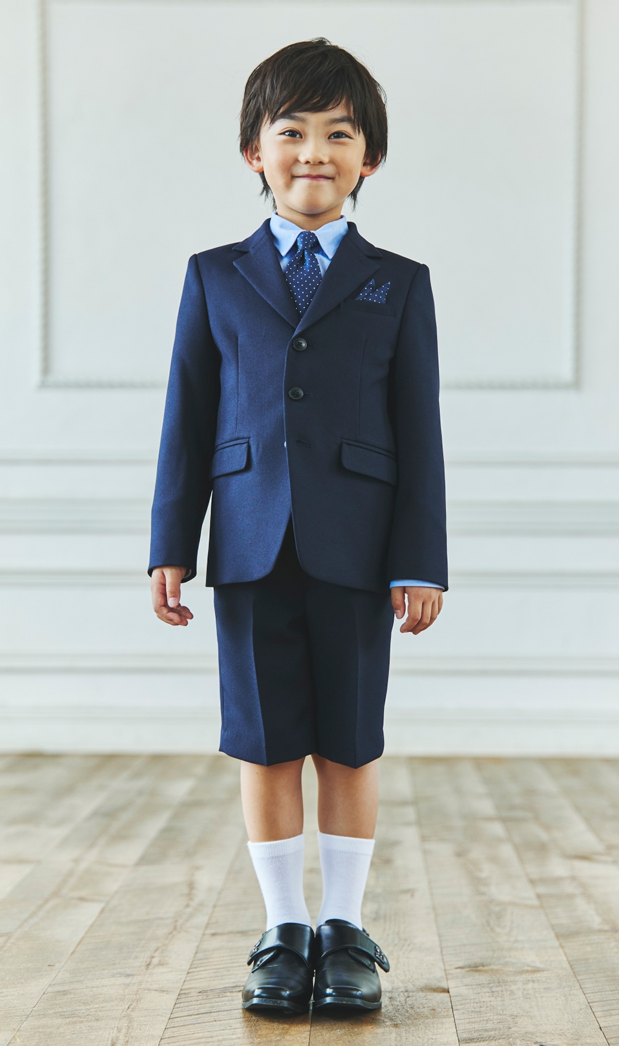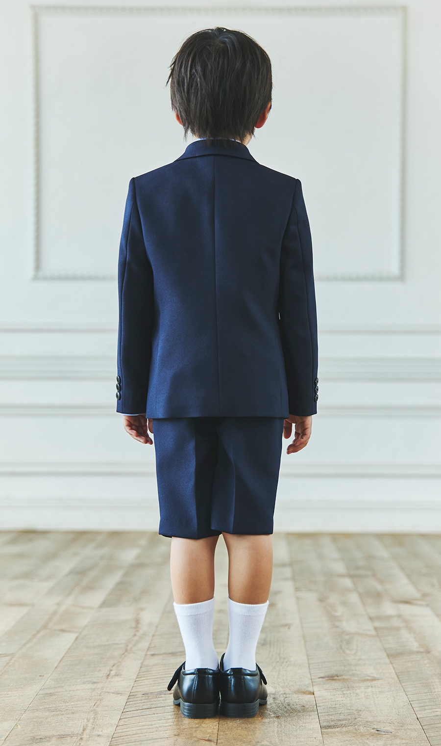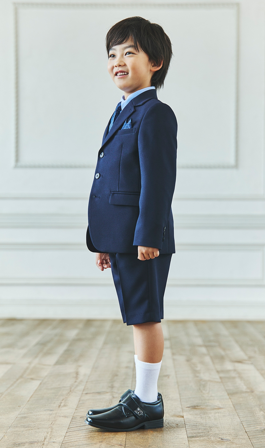 【晴れやかな表情をひときわ彩る特別な装い】表面感のあるヘリンボーン素材のベーシックなシルエット3つボタンスーツ。ブルーシャツにドット柄のネクタイで子供らしいコーディネート。【主な着用シーン】入学式、卒業式、七五三、結婚式、発表会などで着用します。【モデルサイズ】身長:123㎝【着用商品サイズ】120㎝【サイズスペック】[110]ジャケット 着丈:44㎝ 胸囲:73.1㎝ 肩幅:30.0㎝ 袖丈:39㎝ シャツ 着丈:46㎝ 胸囲:71.0㎝ 肩幅:31.5㎝ 袖丈:37㎝ パンツ ウエスト:52㎝ ヒップ:67.6㎝ 股下:18.2㎝[120]ジャケット 着丈:48㎝ 胸囲:77.0㎝ 肩幅:31.5㎝ 袖丈:43㎝ シャツ 着丈:50㎝ 胸囲:76.0㎝ 肩幅:33.5㎝ 袖丈:41㎝ パンツ ウエスト:56㎝ ヒップ:72.0㎝ 股下:20.2㎝[130]ジャケット 着丈:52㎝ 胸囲:80.9㎝ 肩幅:33.0㎝ 袖丈:47㎝ シャツ 着丈:54㎝ 胸囲:80.0㎝ 肩幅:35.5㎝ 袖丈:45㎝ パンツ ウエスト:60㎝ ヒップ:76.4㎝ 股下:22.2㎝【セット内容】1.ツーピーススーツ(ジャケット・ハーフパンツ)※パンツはウエスト伸縮ゴム仕様2.シャツ・ワンタッチネクタイ ※チーフはポケット縫い付けとなっております シューズ・ソックスは付属しておりません。※モニター・パソコン環境により色味に誤差が生じる場合がございます。「この商品をレンタルする」ボタンを押して頂き、オプションを選択して下さい。※オプション品の在庫がない場合は表示されません。