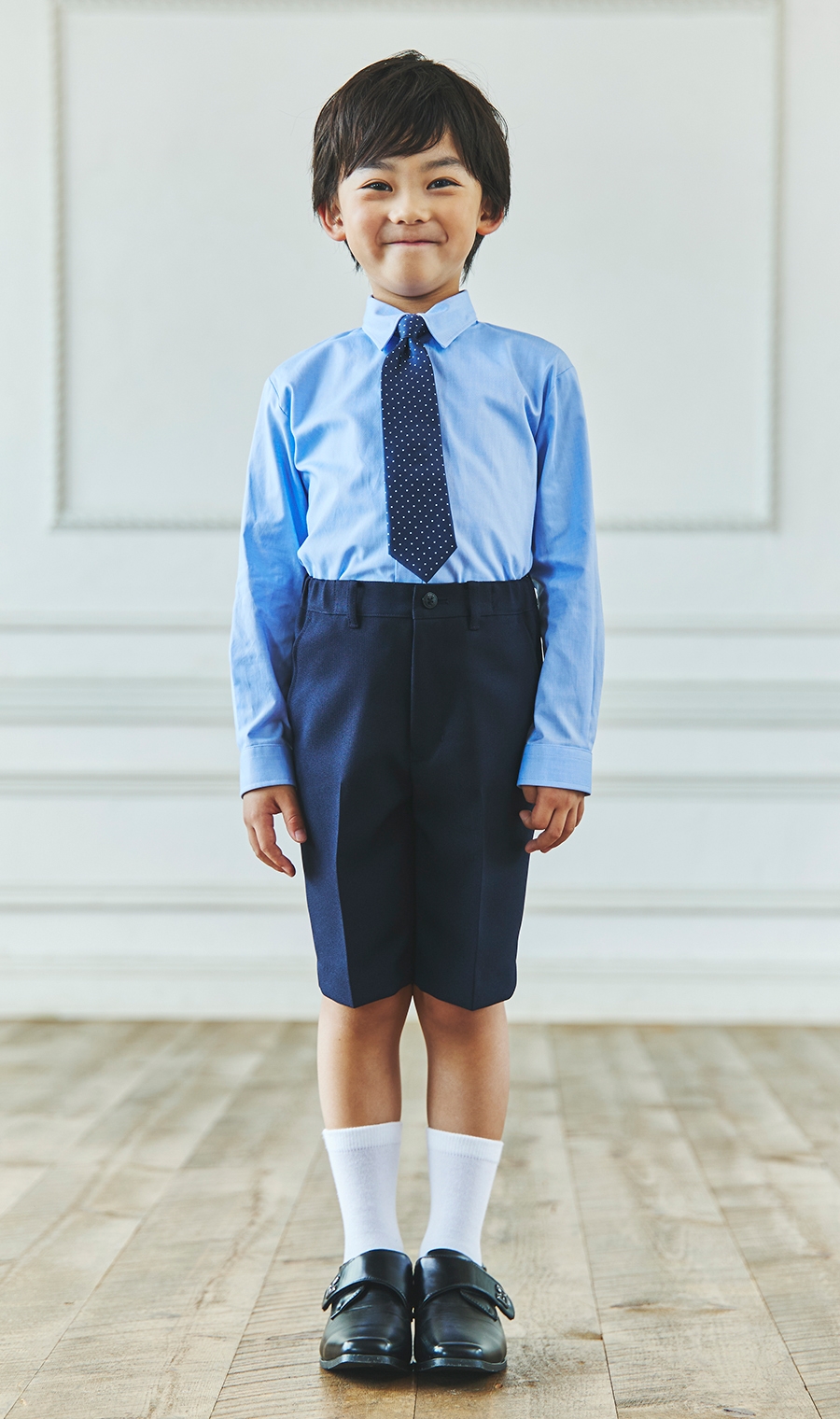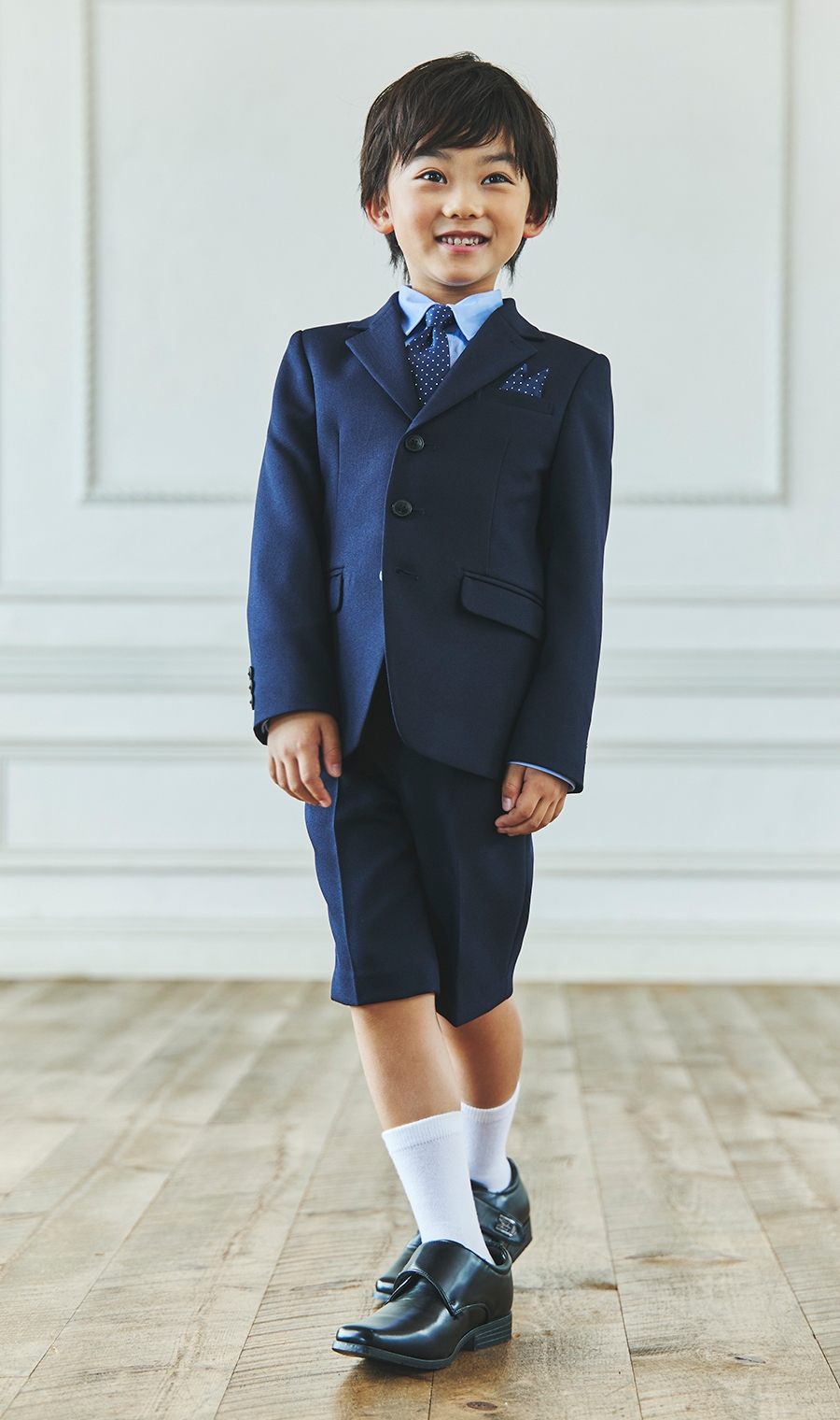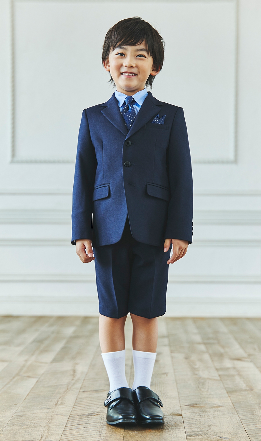【晴れやかな表情をひときわ彩る特別な装い】表面感のあるヘリンボーン素材のベーシックなシルエット3つボタンスーツ。ブルーシャツにドット柄のネクタイで子供らしいコーディネート。【主な着用シーン】入学式、卒業式、七五三、結婚式、発表会などで着用します。【モデルサイズ】身長:123㎝【着用商品サイズ】120㎝【サイズスペック】[110]ジャケット 着丈:44㎝ 胸囲:73.1㎝ 肩幅:30.0㎝ 袖丈:39㎝ シャツ 着丈:46㎝ 胸囲:71.0㎝ 肩幅:31.5㎝ 袖丈:37㎝ パンツ ウエスト:52㎝ ヒップ:67.6㎝ 股下:18.2㎝[120]ジャケット 着丈:48㎝ 胸囲:77.0㎝ 肩幅:31.5㎝ 袖丈:43㎝ シャツ 着丈:50㎝ 胸囲:76.0㎝ 肩幅:33.5㎝ 袖丈:41㎝ パンツ ウエスト:56㎝ ヒップ:72.0㎝ 股下:20.2㎝[130]ジャケット 着丈:52㎝ 胸囲:80.9㎝ 肩幅:33.0㎝ 袖丈:47㎝ シャツ 着丈:54㎝ 胸囲:80.0㎝ 肩幅:35.5㎝ 袖丈:45㎝ パンツ ウエスト:60㎝ ヒップ:76.4㎝ 股下:22.2㎝【セット内容】1.ツーピーススーツ(ジャケット・ハーフパンツ)※パンツはウエスト伸縮ゴム仕様2.シャツ・ワンタッチネクタイ ※チーフはポケット縫い付けとなっております シューズ・ソックスは付属しておりません。※モニター・パソコン環境により色味に誤差が生じる場合がございます。「この商品をレンタルする」ボタンを押して頂き、オプションを選択して下さい。※オプション品の在庫がない場合は表示されません。