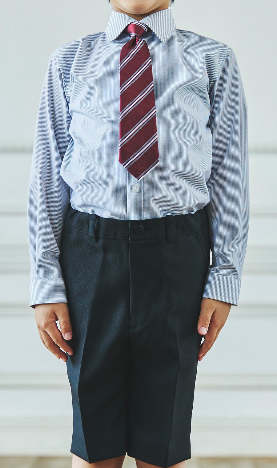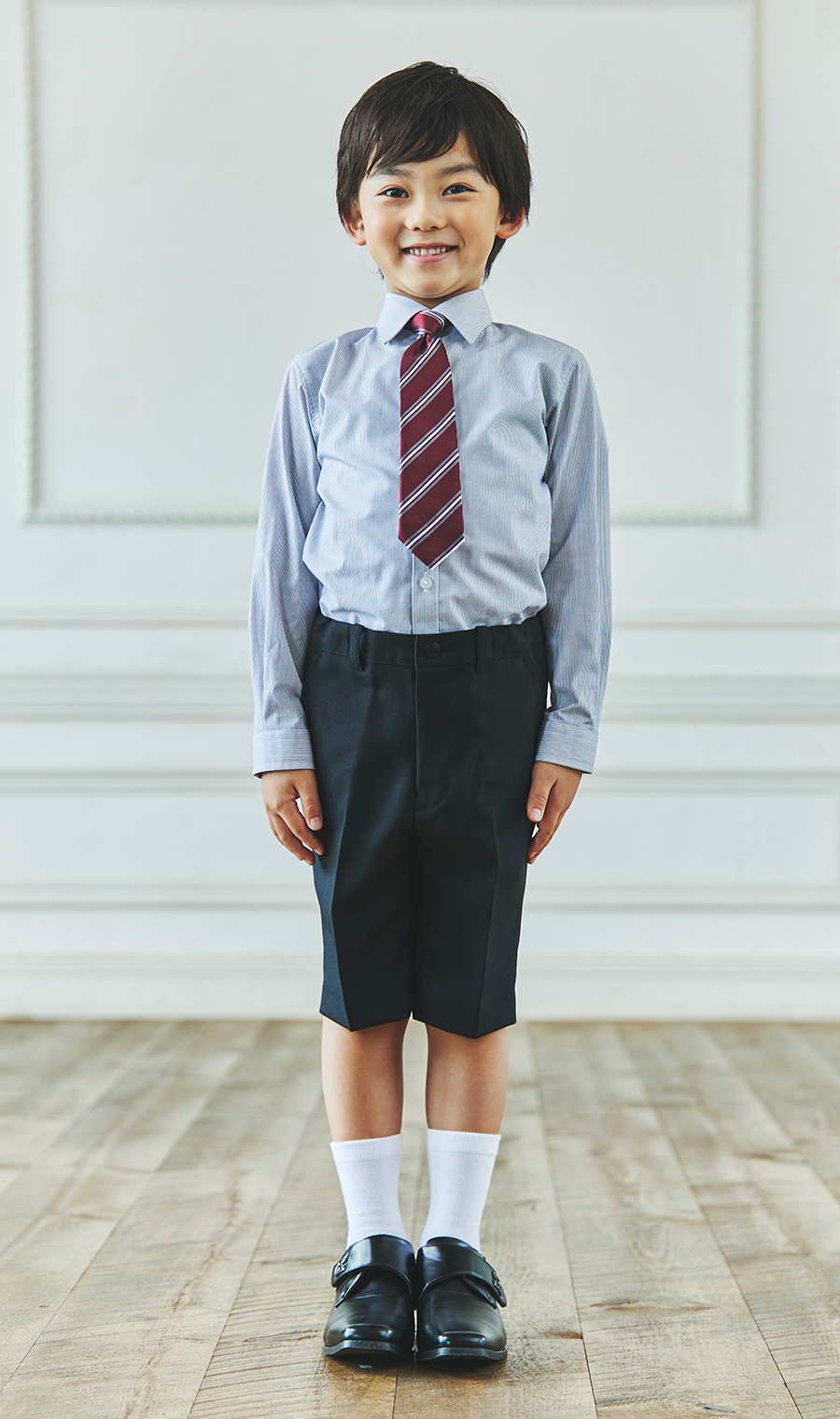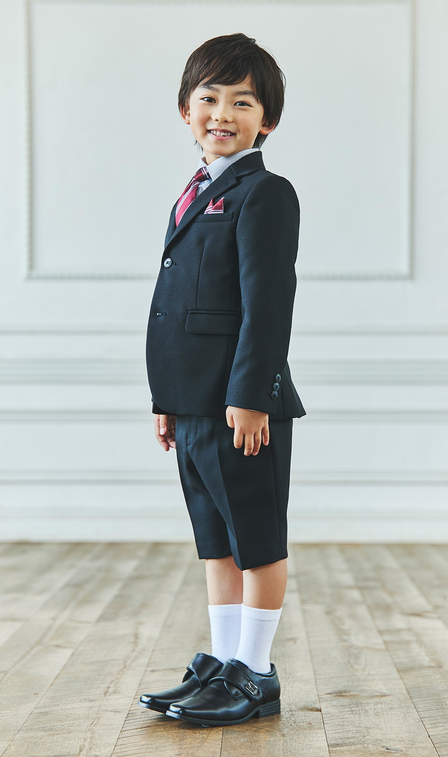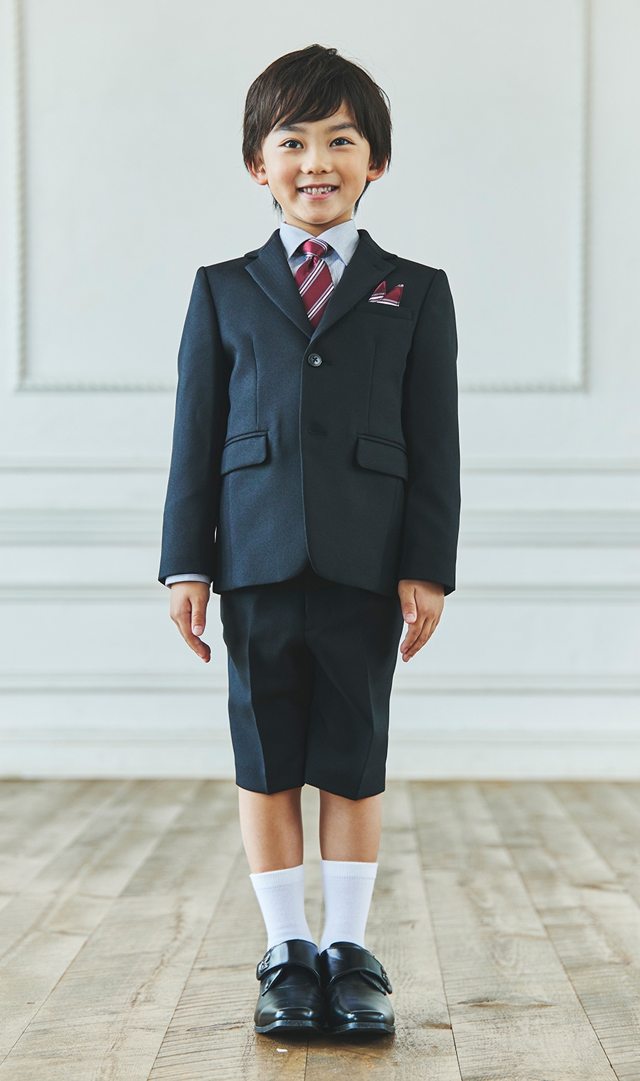 【晴れやかな表情をひときわ彩る特別な装い】重厚感のあるヘリンボーン生地はやや光沢があり、黒や紺などのダークな色味が上品に仕上がります。ネクタイはスタンダードなレジメンタル柄でかっこいい雰囲気も演出します。細身のラインがシャープなシルエットを強調します。【主な着用シーン】入学式、卒業式、七五三、結婚式、発表会などで着用します。【モデルサイズ】身長:123cm【着用商品サイズ】120cm【サイズスペック】[100]ジャケット 着丈:39.5cm 胸囲:67cm 肩幅:29.5cm 袖丈:34cm シャツ 着丈:42.0cm 胸囲:68cm 肩幅:29.5cm 袖丈:33cm パンツ ウエスト:58cm ヒップ:63.5cm 股下:16.7cm[110]ジャケット 着丈:43.5cm 胸囲:71cm 肩幅:31cm 袖丈:38cm シャツ 着丈:46.0㎝ 胸囲:73.0cm 肩幅:31.5cm 袖丈:37cm パンツ ウエスト:62cm ヒップ:67.6㎝ 股下:18.2cm[120]ジャケット 着丈:47.5cm 胸囲:74.9㎝ 肩幅:32.5cm 袖丈:42cm シャツ 着丈:50.0㎝ 胸囲:76cm 肩幅:33.5cm 袖丈:41cm パンツ ウエスト:66cm ヒップ:72㎝ 股下:20.2cm[130]ジャケット 着丈:51.5cm 胸囲:78.9㎝ 肩幅:34cm 袖丈:46.1cm シャツ 着丈:54.0㎝ 胸囲:80cm 肩幅:33.5cm 袖丈:45㎝ パンツ ウエスト:70cm ヒップ:76.5㎝ 股下:22.2cm【セット内容】1.ツーピーススーツ(ジャケット・ハーフパンツ)※パンツのウエストは伸縮ゴム仕様2.シャツ・ワンタッチネクタイ ※チーフはポケット縫い付けとなっております シューズ・ソックスは付属しておりません。※モニター・パソコン環境により色味に誤差が生じる場合がございます。「この商品をレンタルする」ボタンを押して頂き、オプションを選択して下さい。※オプション品の在庫がない場合は表示されません。
