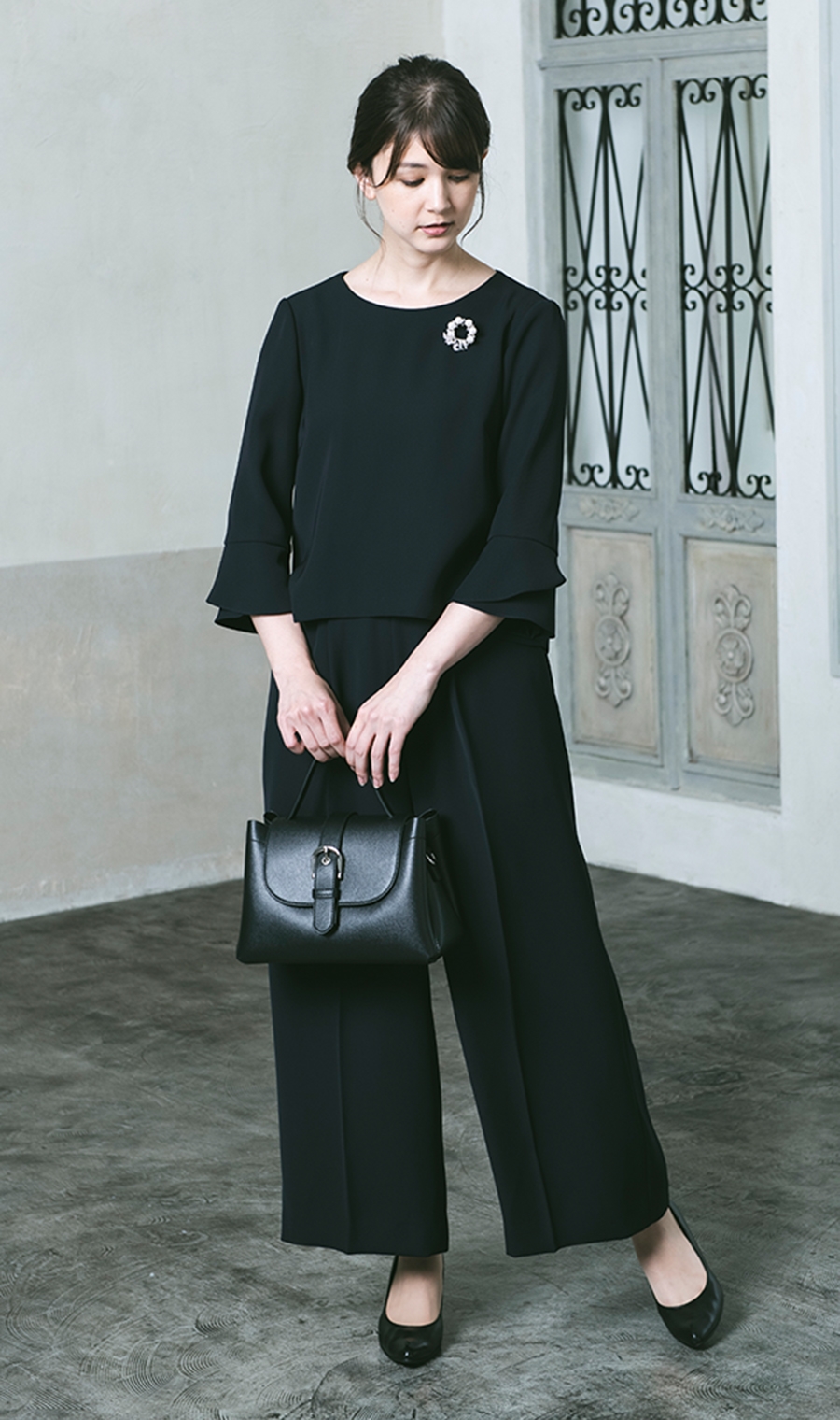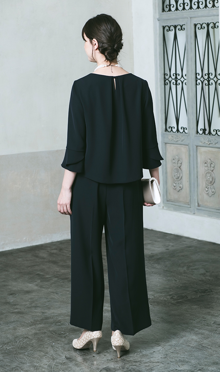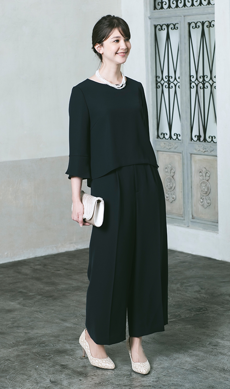 パンツは脚をすらりと見せるセンタープレス入りのワイドシルエット。