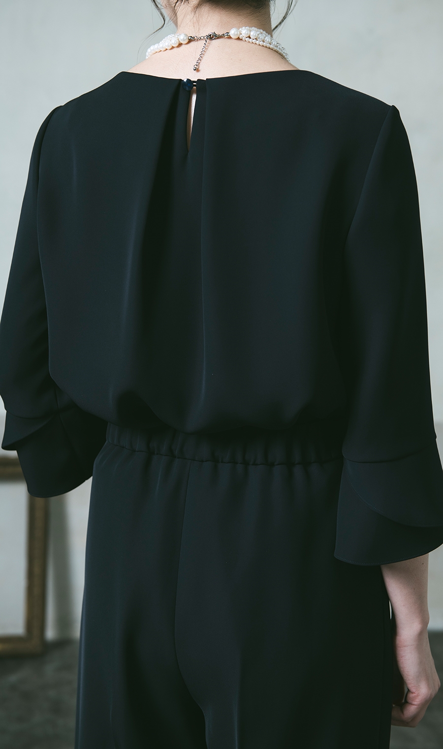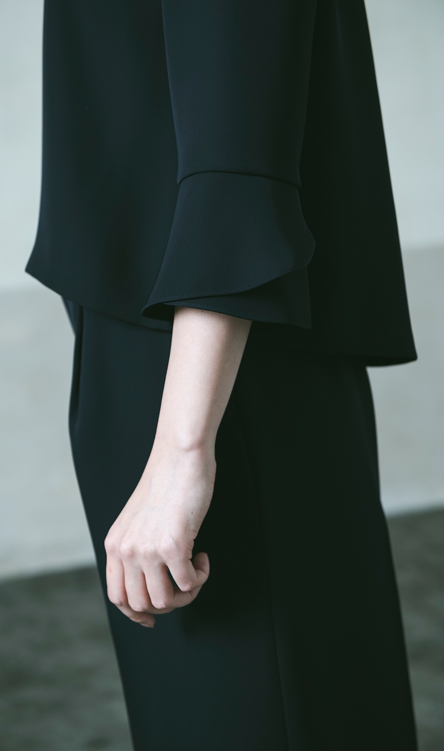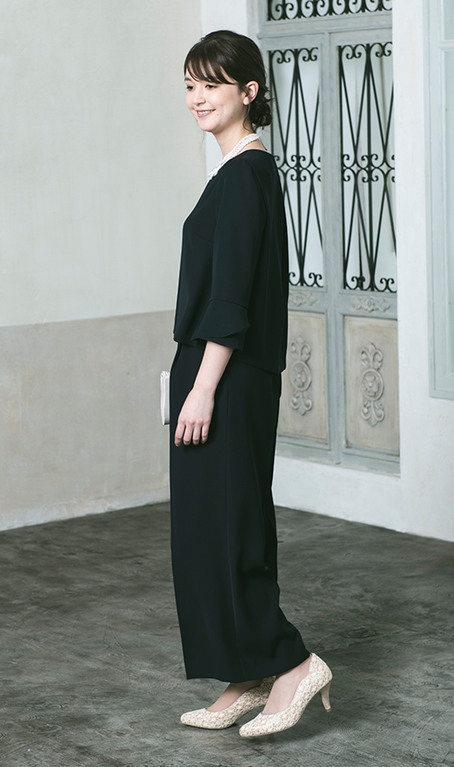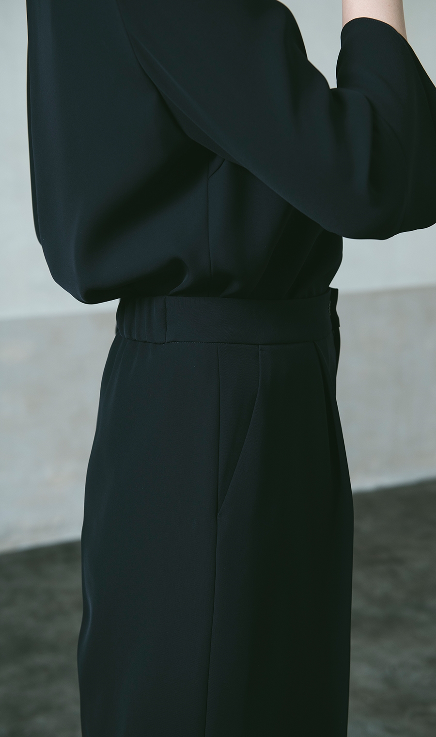 少しゆったり目のサイズ感。シンプルなセットアップなので小物類で華やかさを足さないとビジネスっぽい印象を受けるかも。