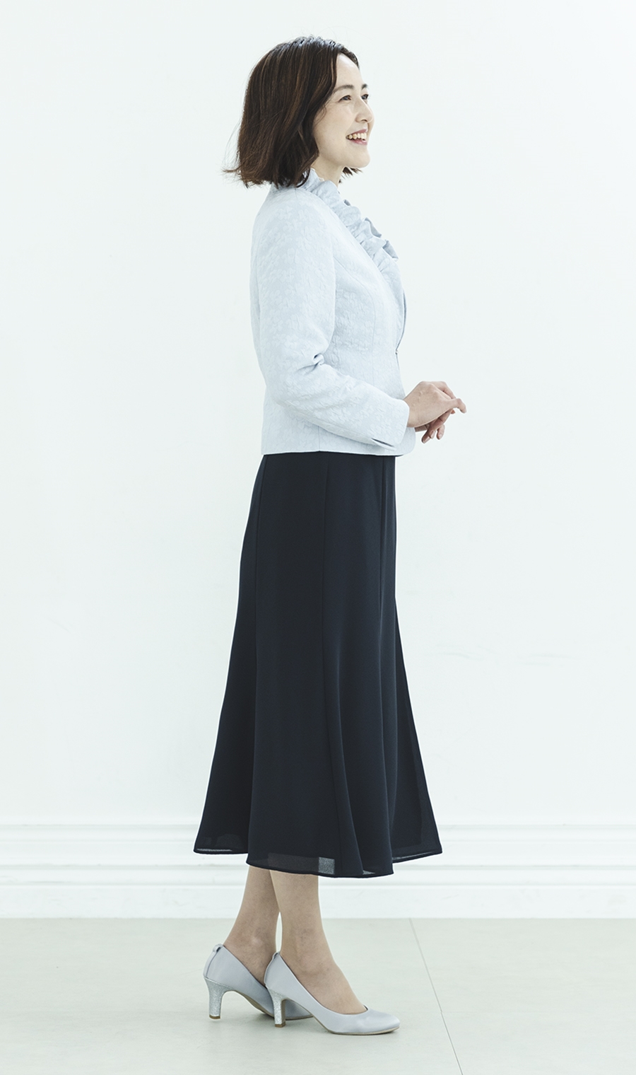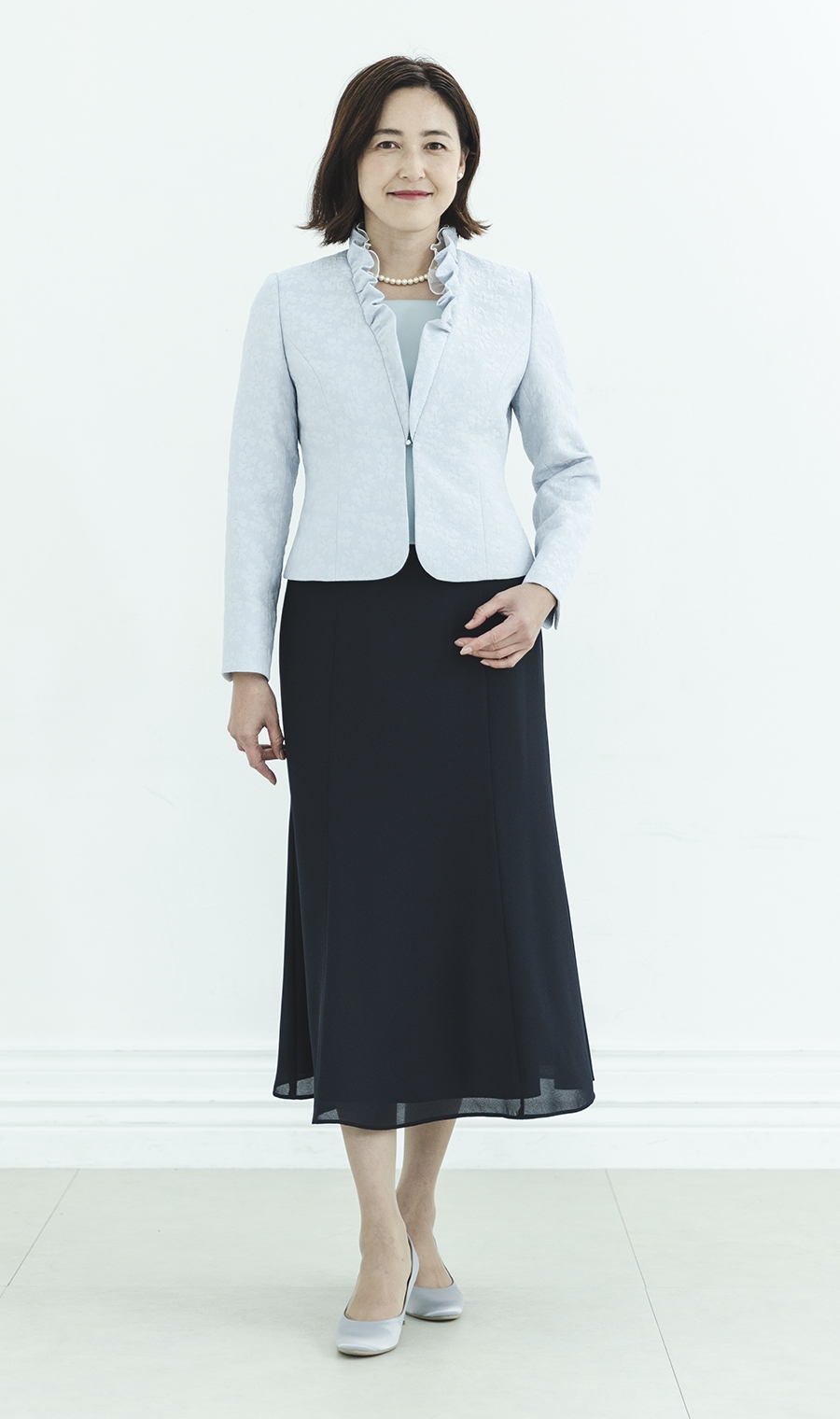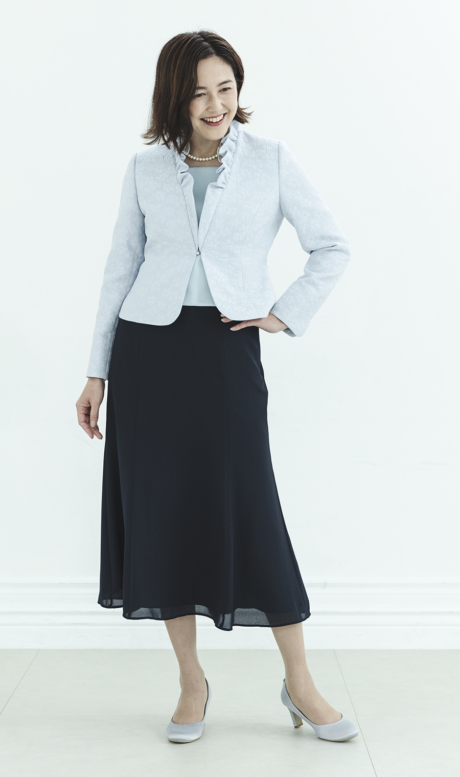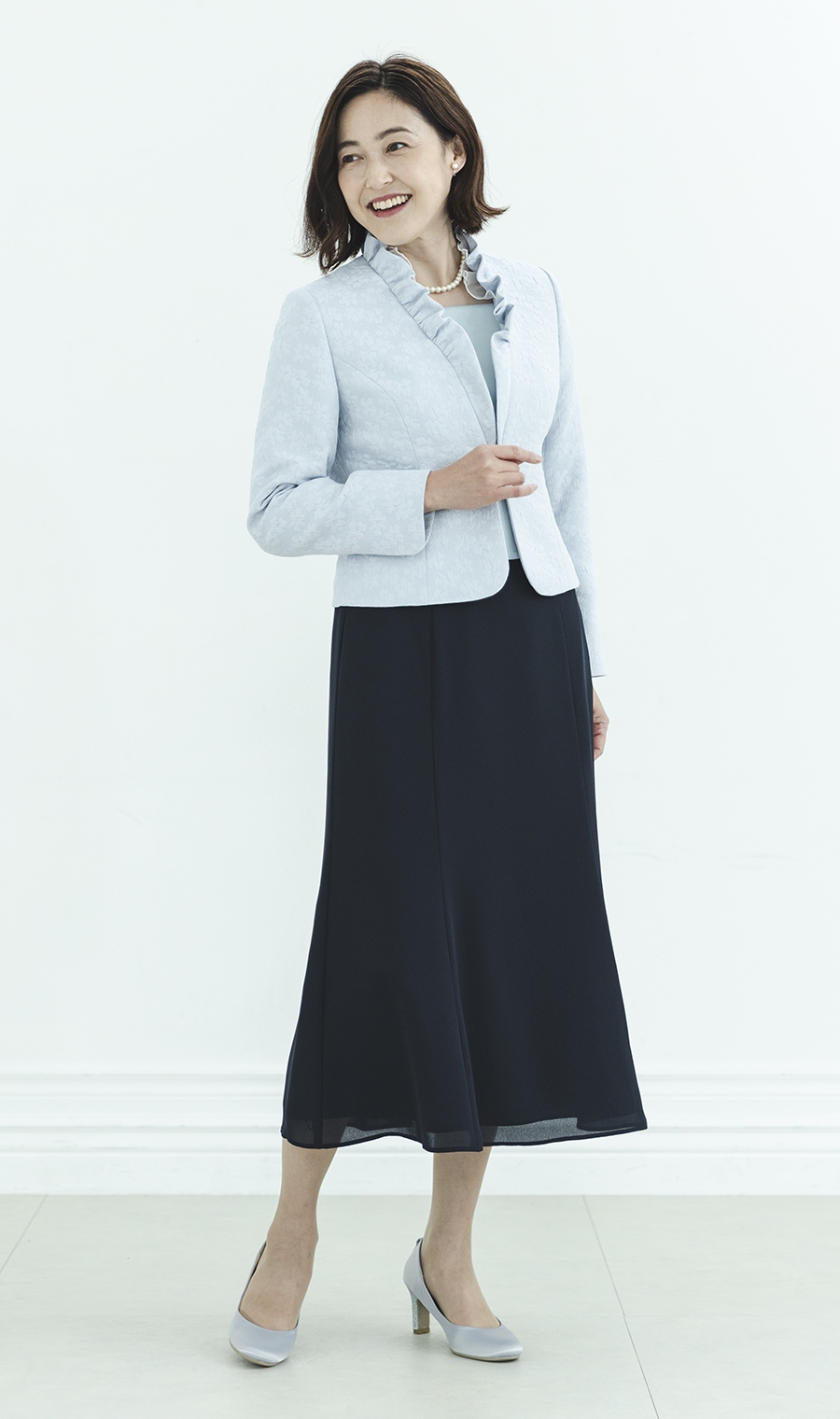 ジャケットとのバランスを引き立てエレガントな装いに