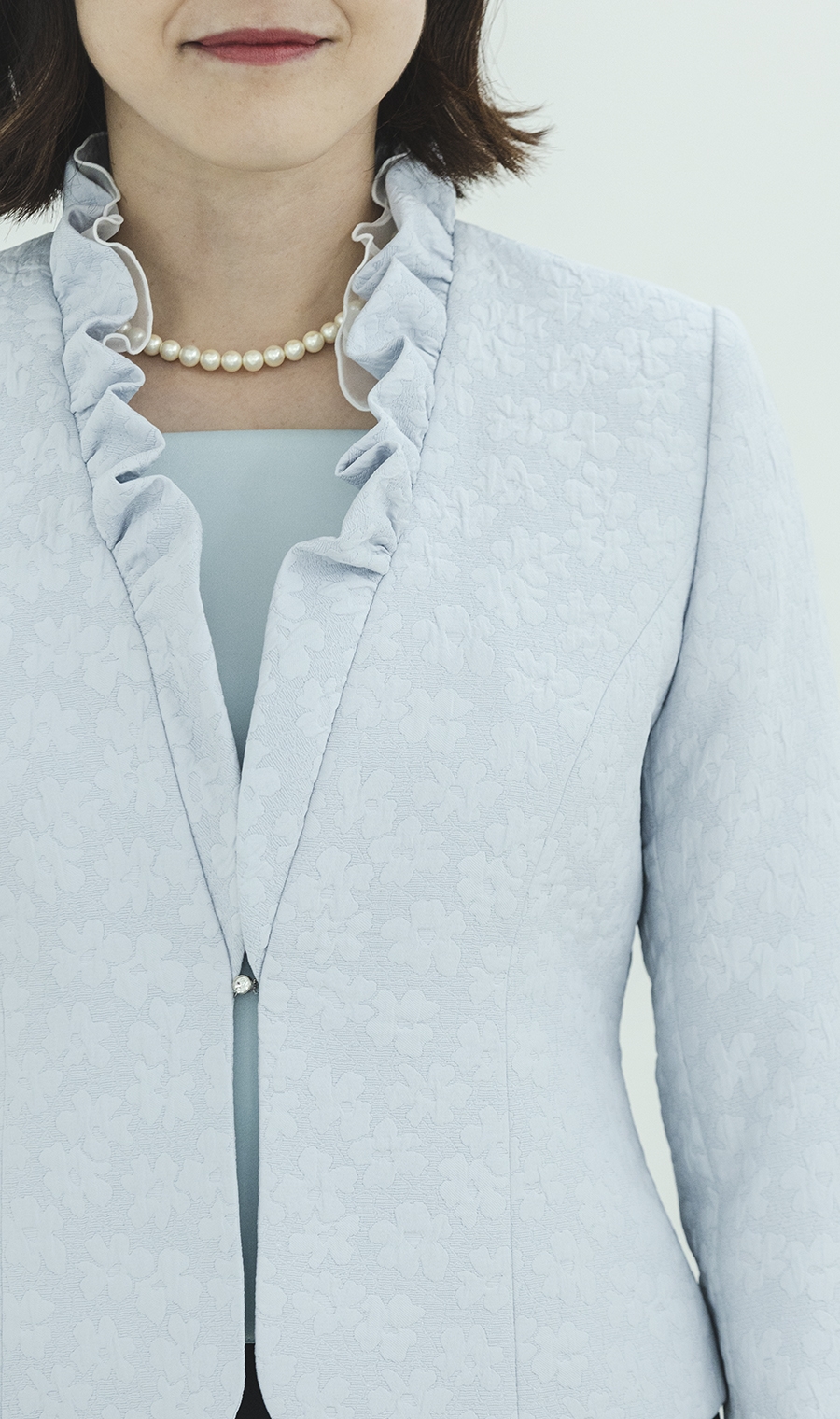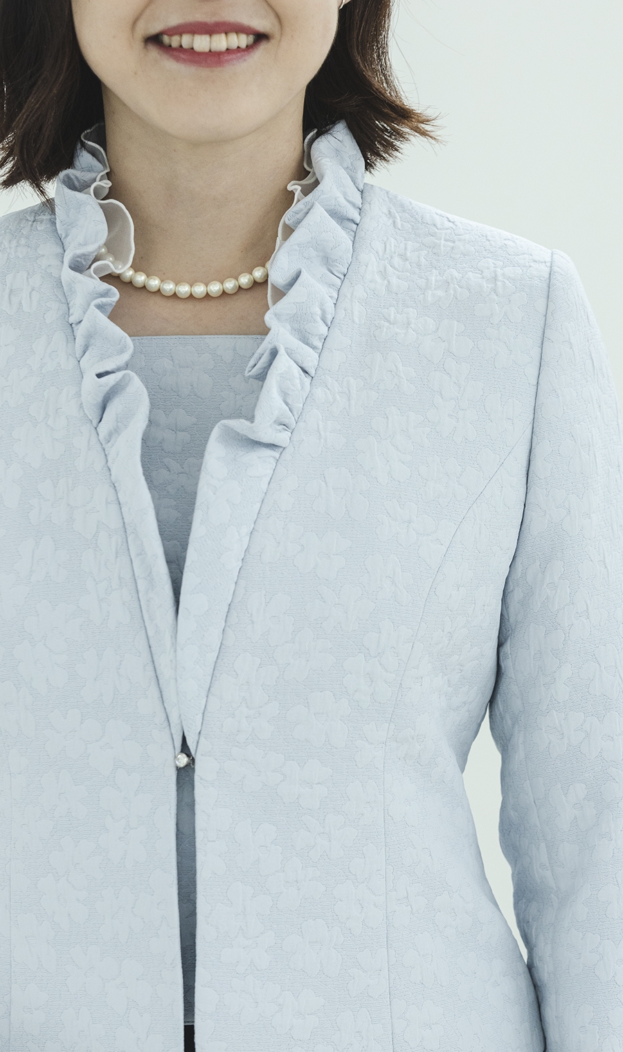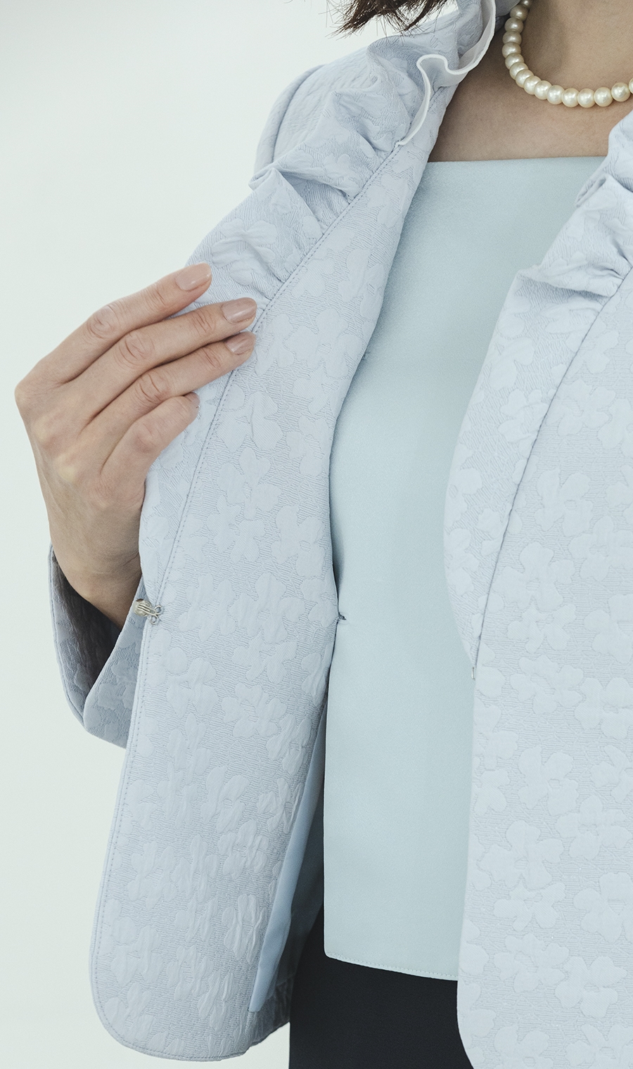 襟元のフリルは首元を隠しながら、オーガンジーとの2枚重ねで