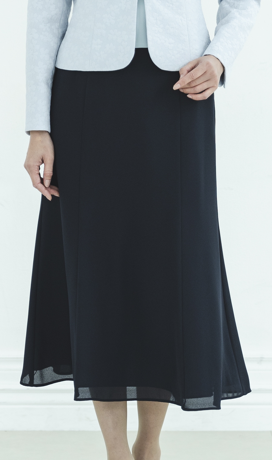 スカートは腰回りはすっきりと、裾に向かって広がるマーメイドシルエットで、