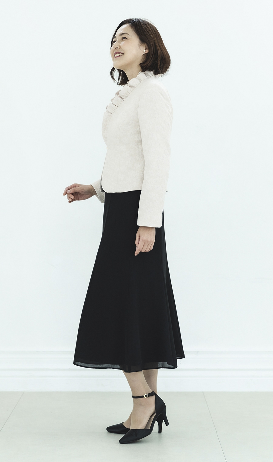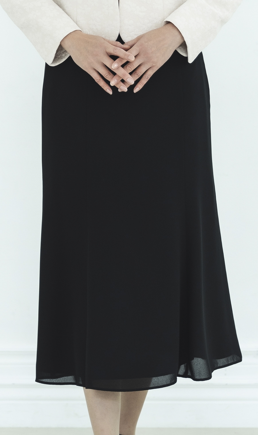 スカートは腰回りはすっきりと、裾に向かって広がるマーメイドシルエットで、