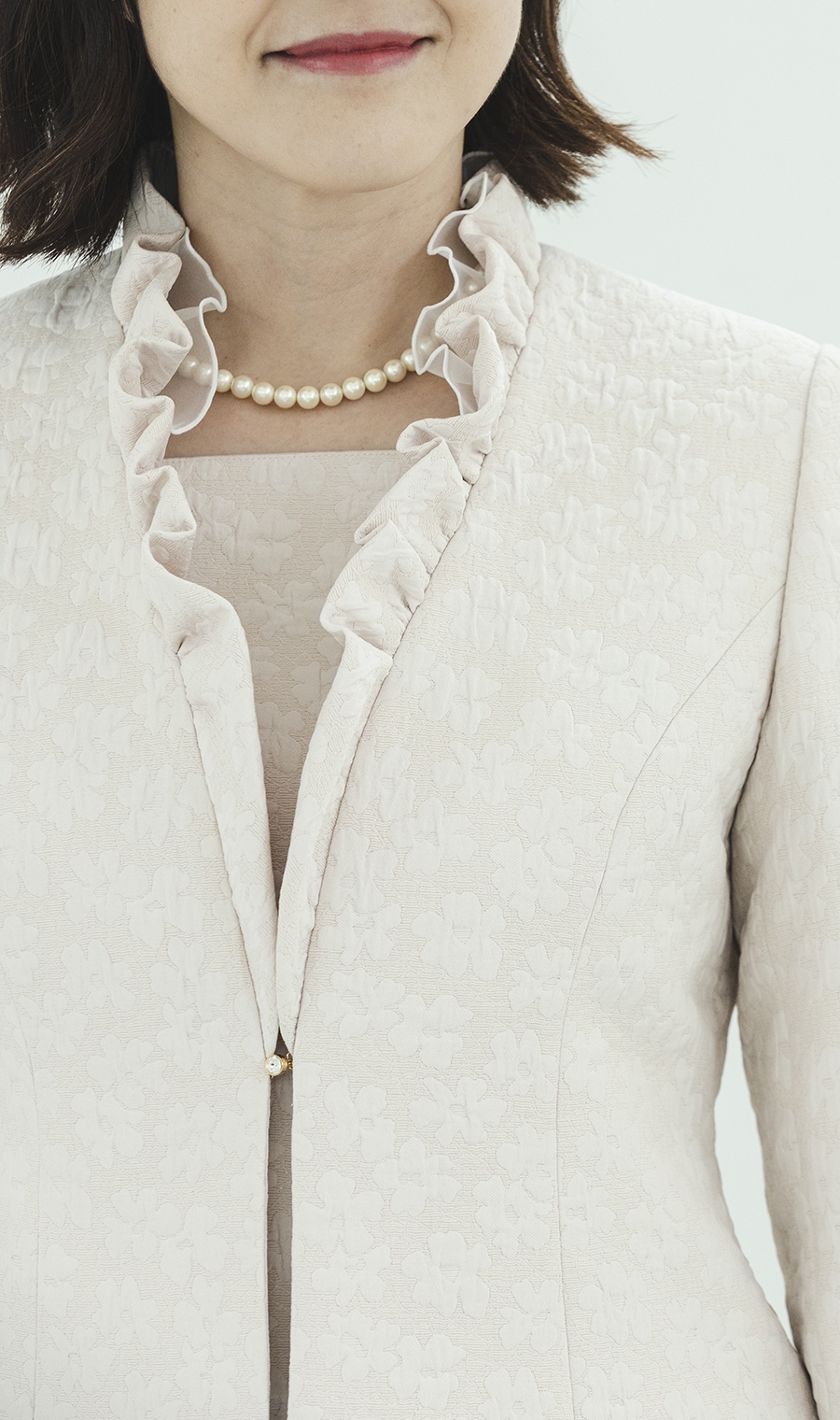 襟元のフリルは首元を隠しながら、オーガンジーとの2枚重ねで