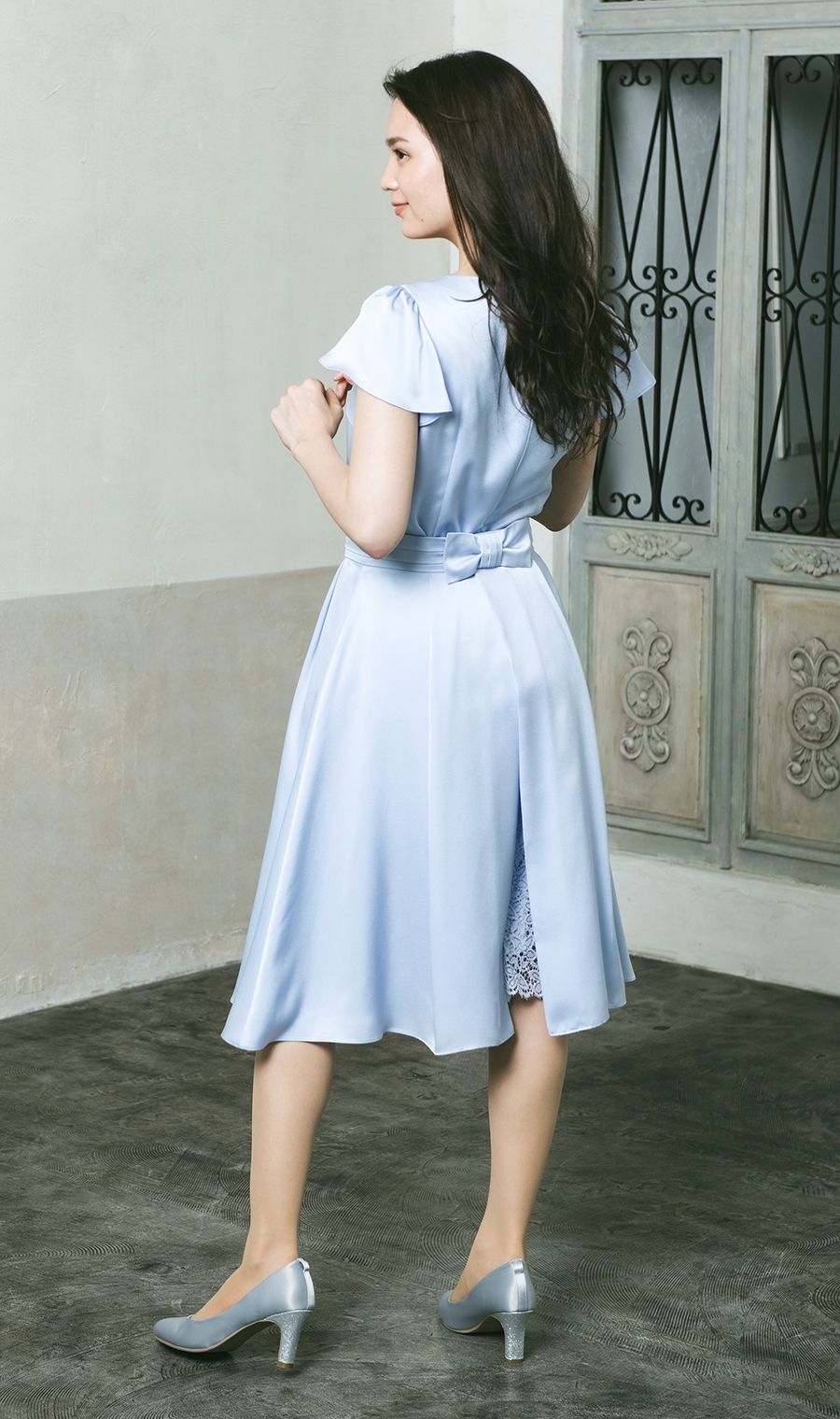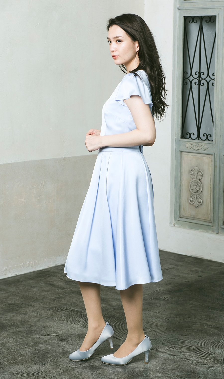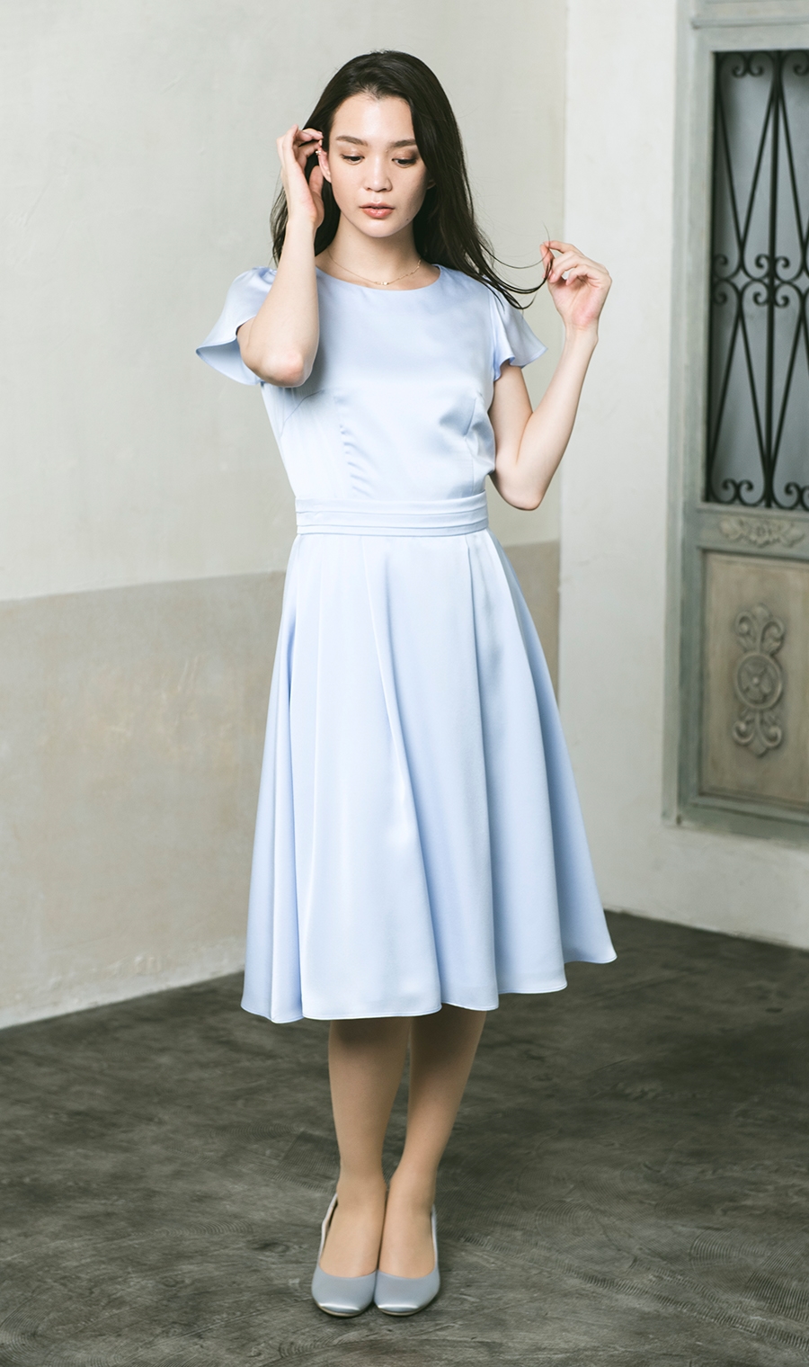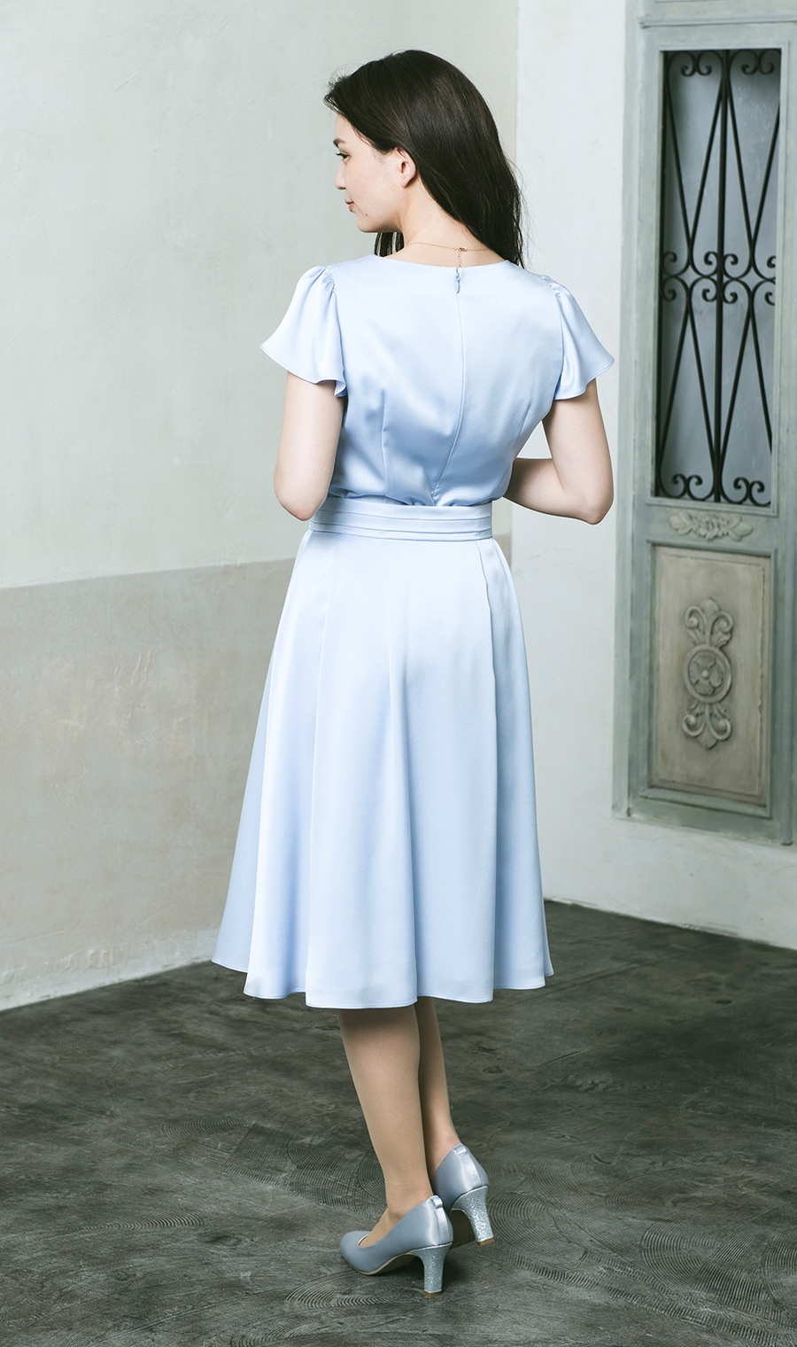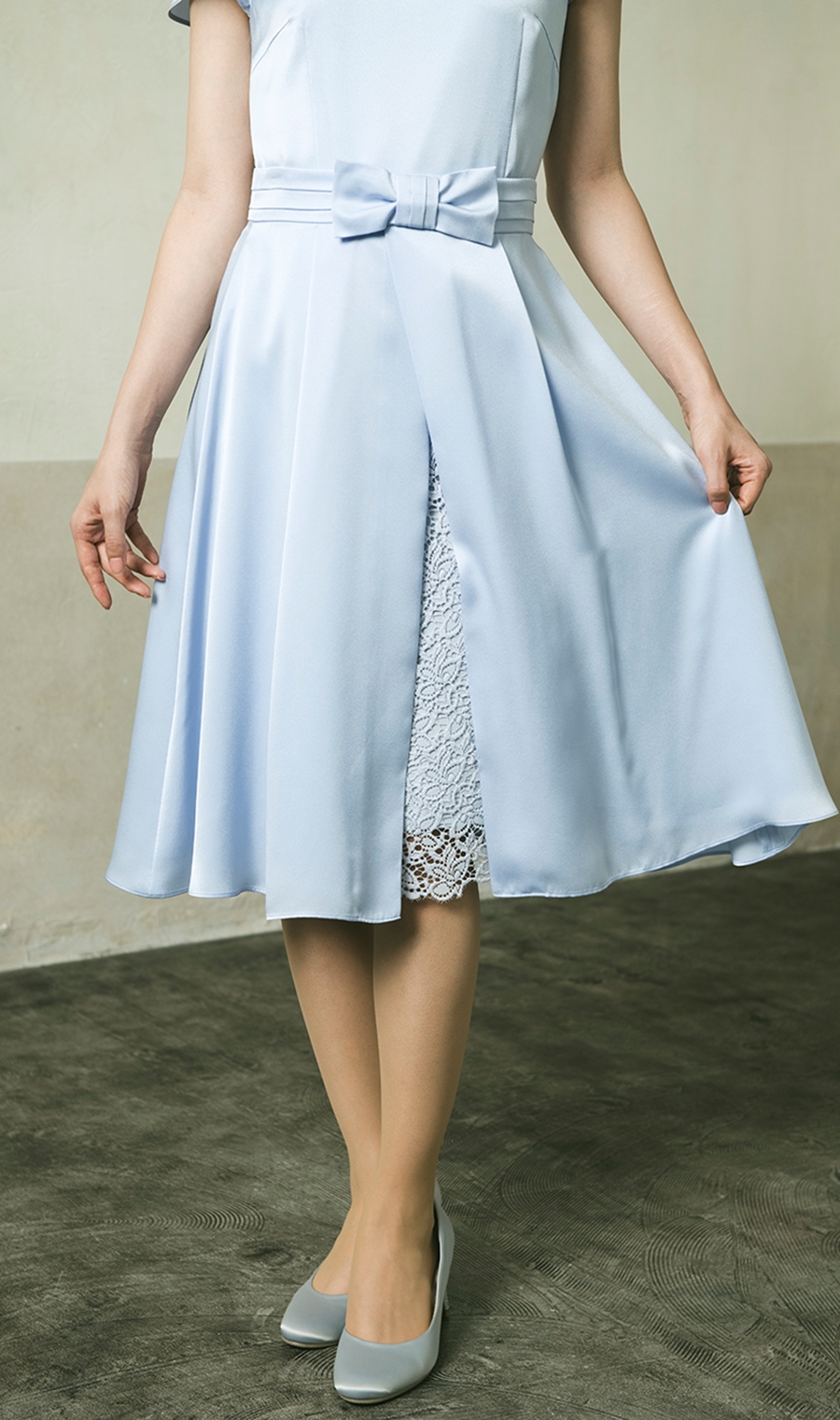 着丈はぎりぎりひざが隠れるくらい。光沢感のある生地がフォーマル感を高めてくれる。