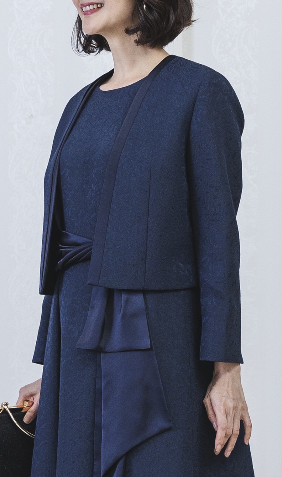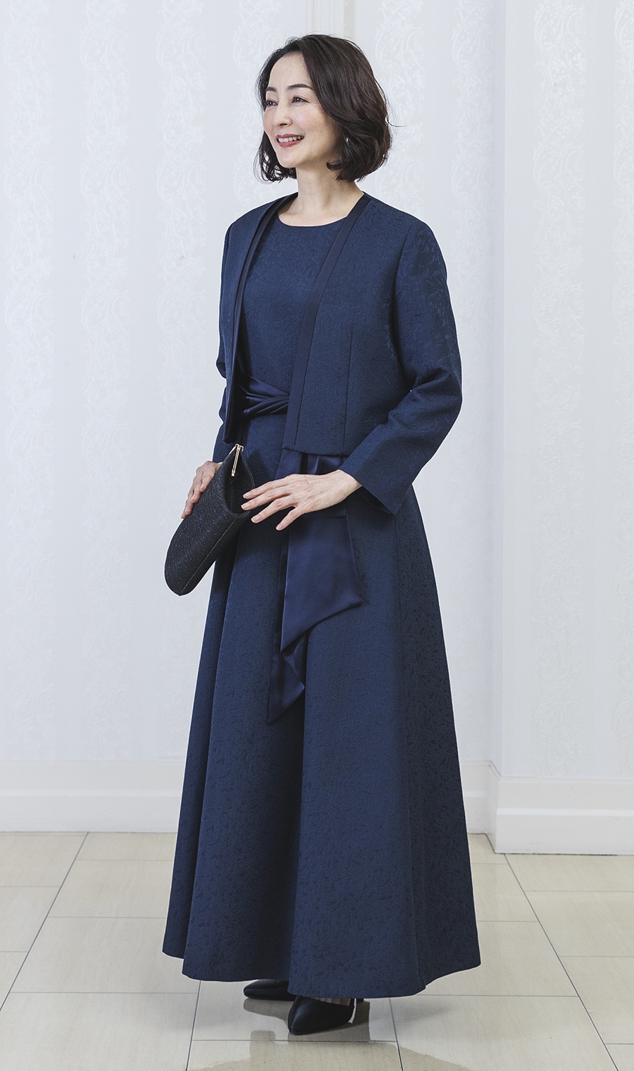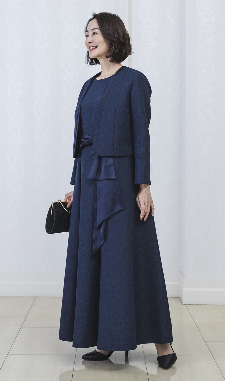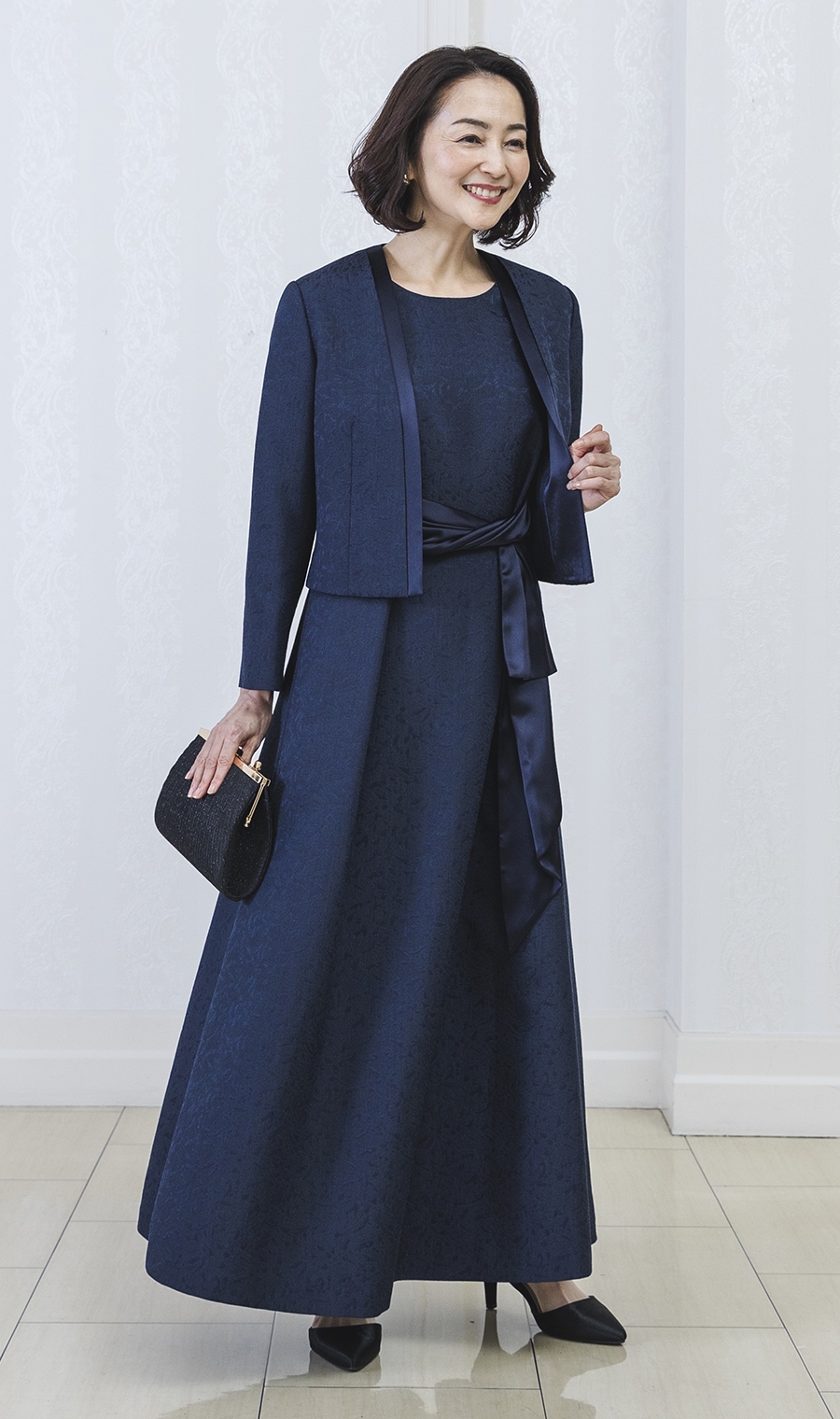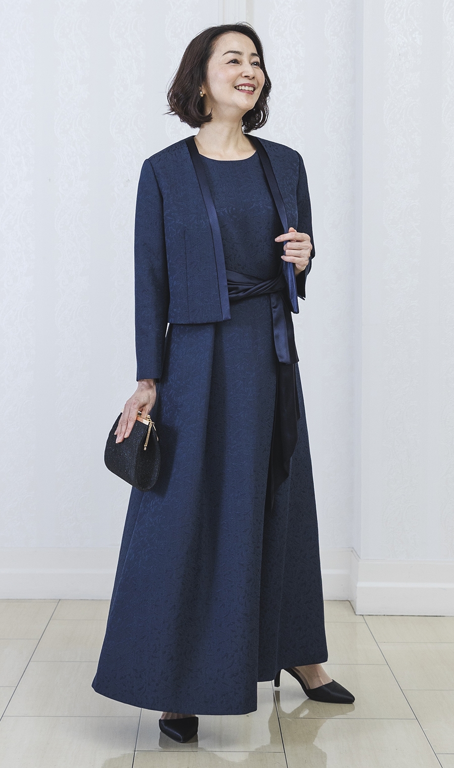 ショート丈ジャガードジャケット+ウエストリボンフルレングスドレス