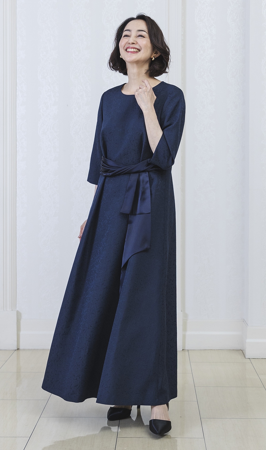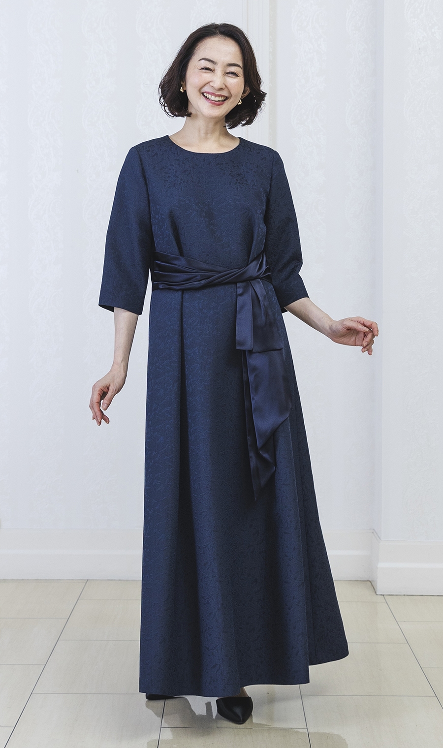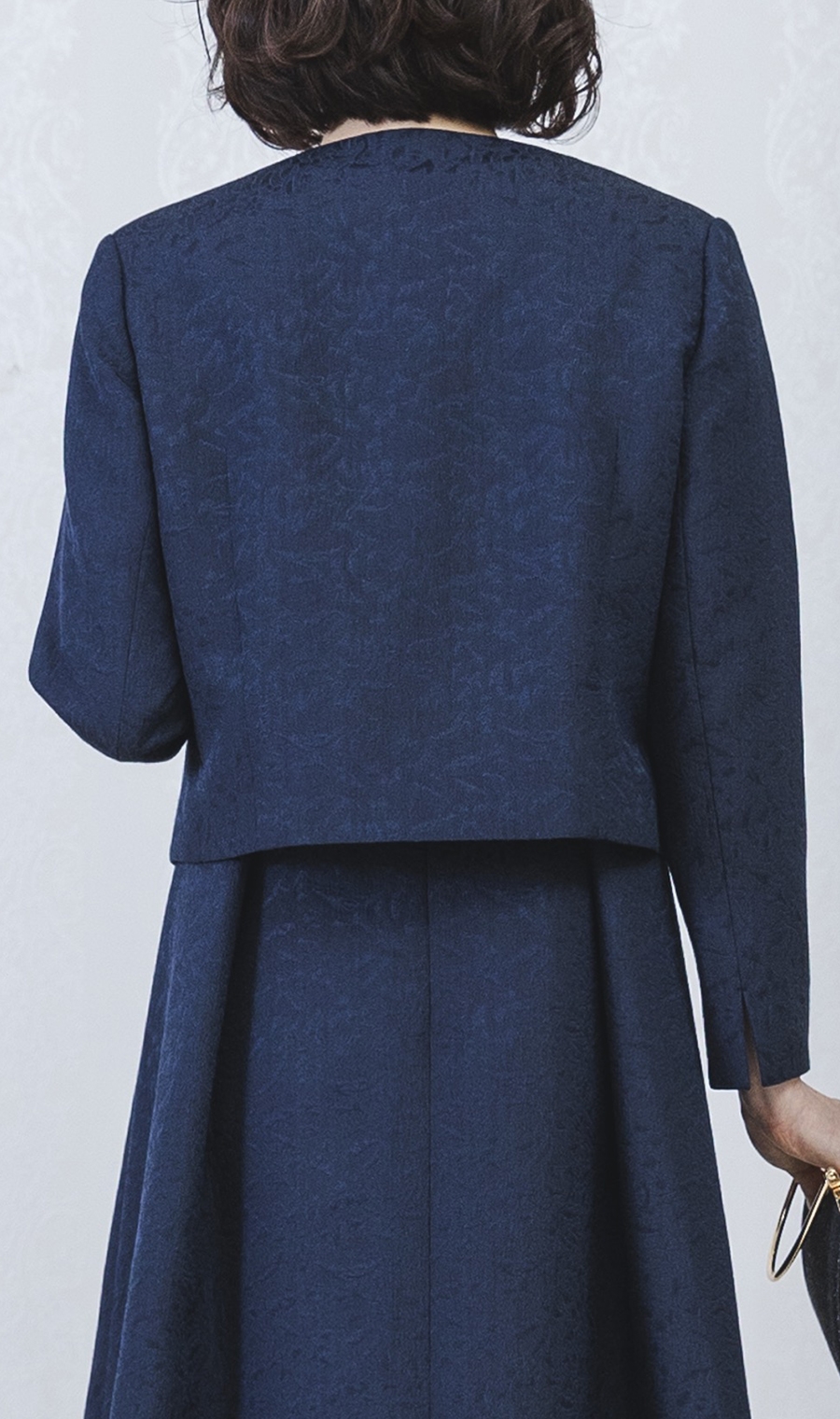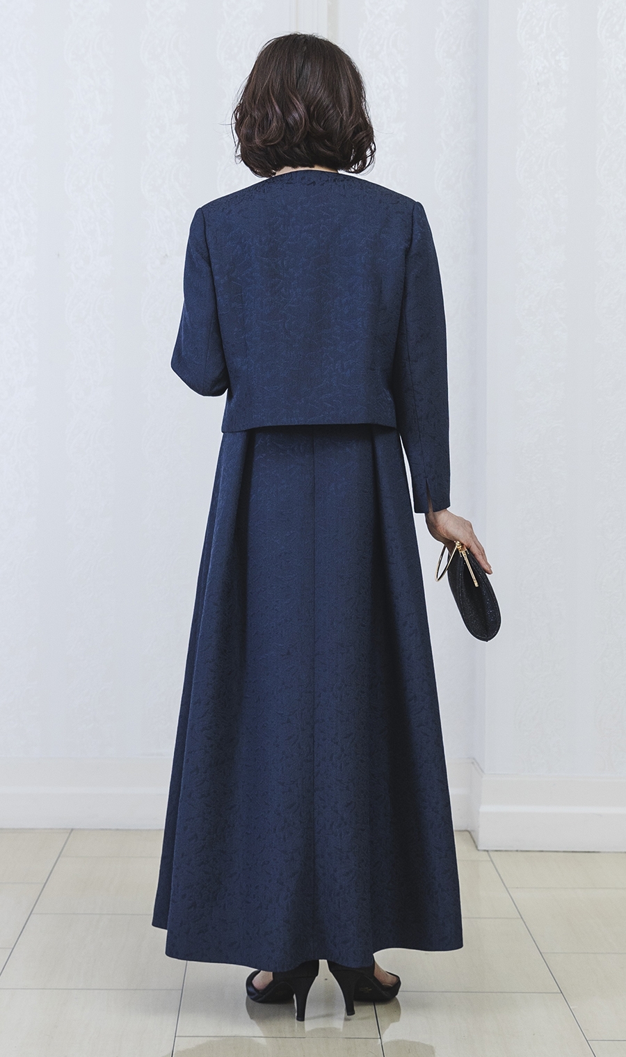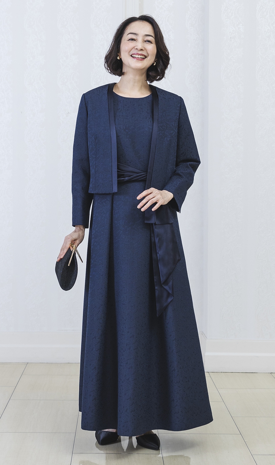 ショート丈ジャガードジャケット+ウエストリボンフルレングスドレス