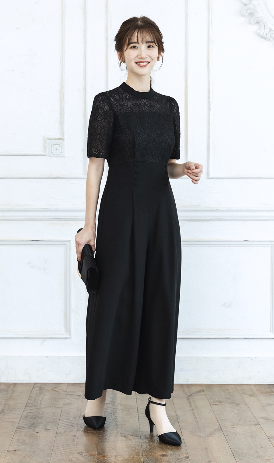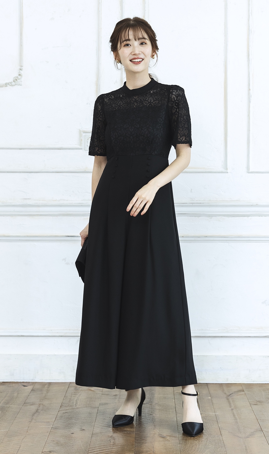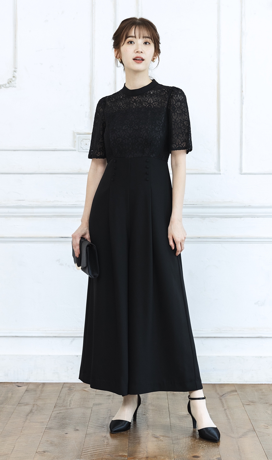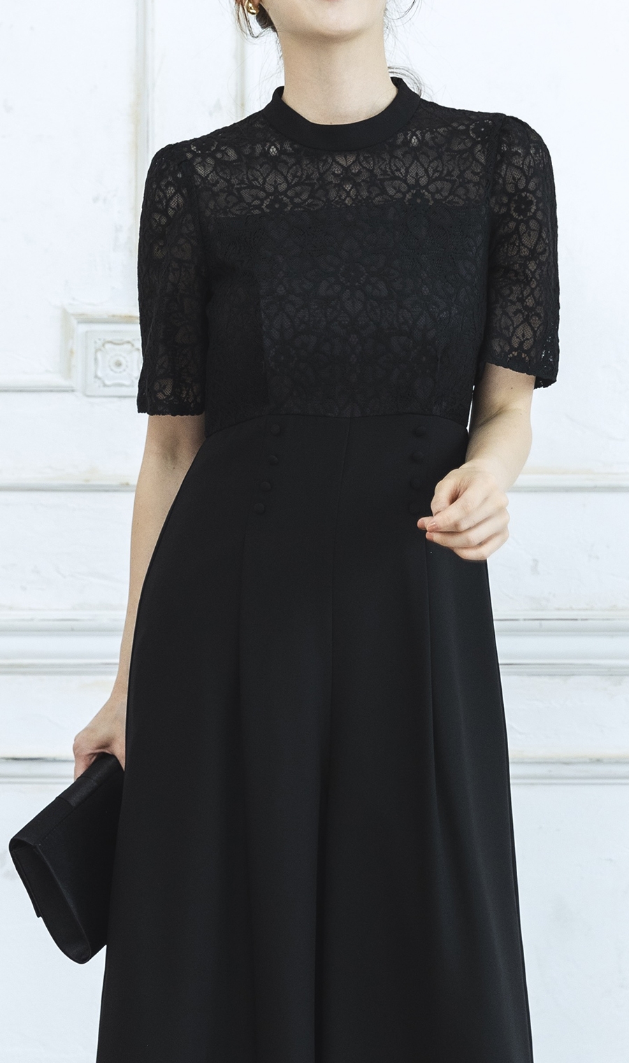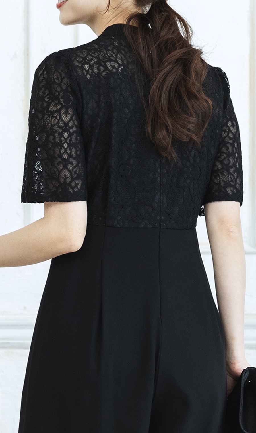上半身に日本製のタイルモチーフレースをあしらった、スタイリッシュなコンビネゾンドレス。