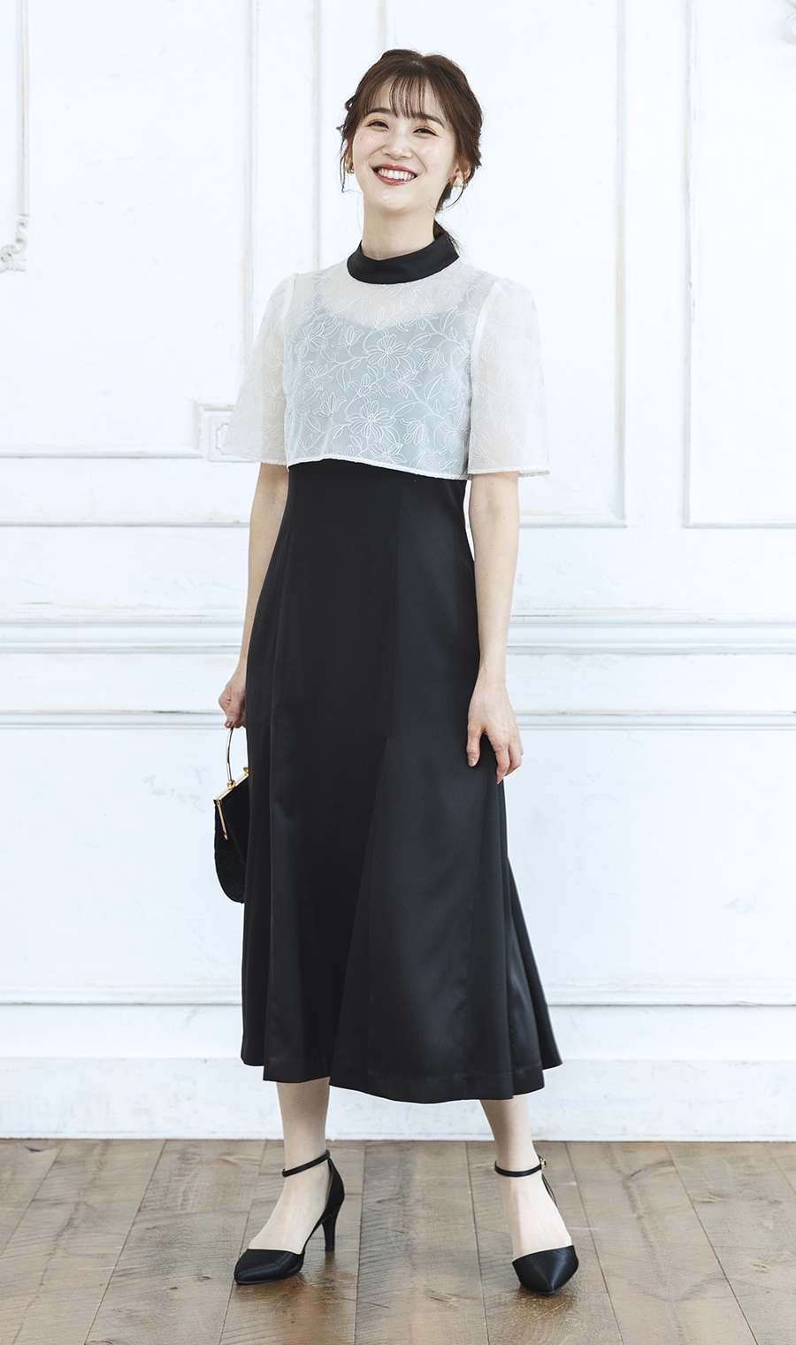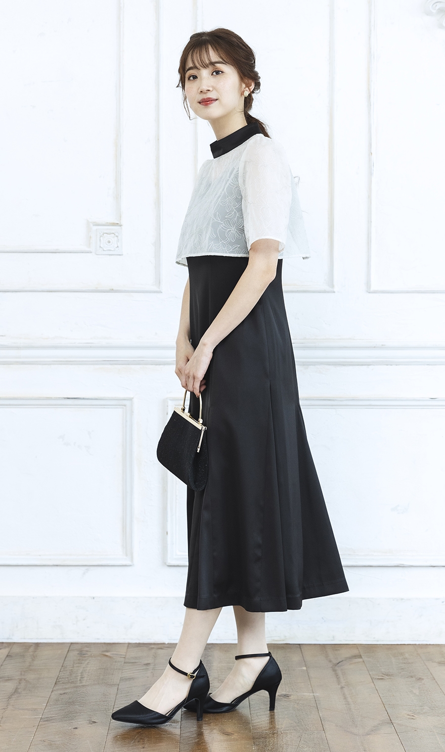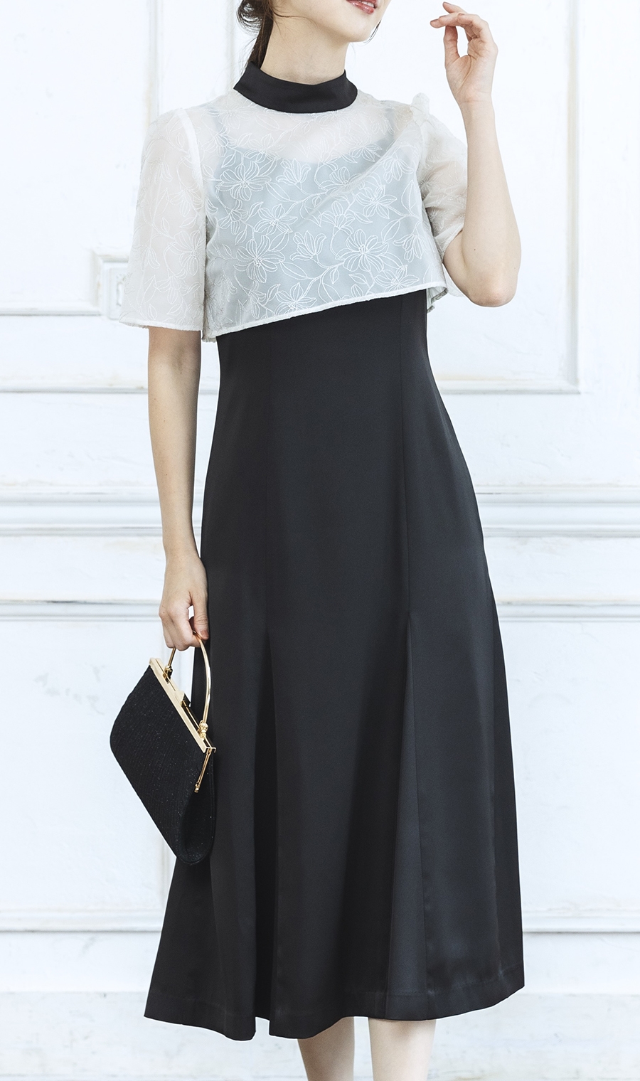 トップ部分の花柄レースが華やかで印象的なハイネックワンピースドレス。
