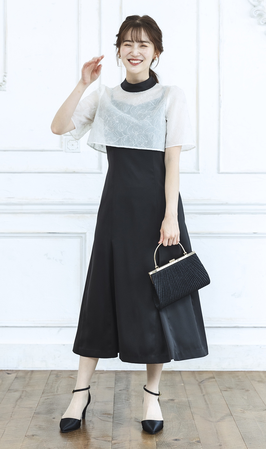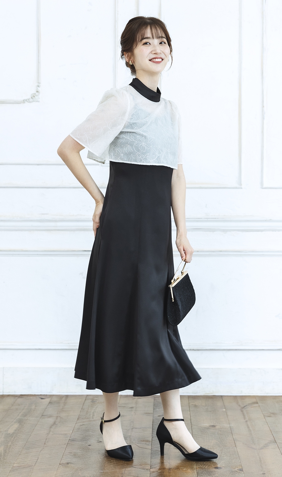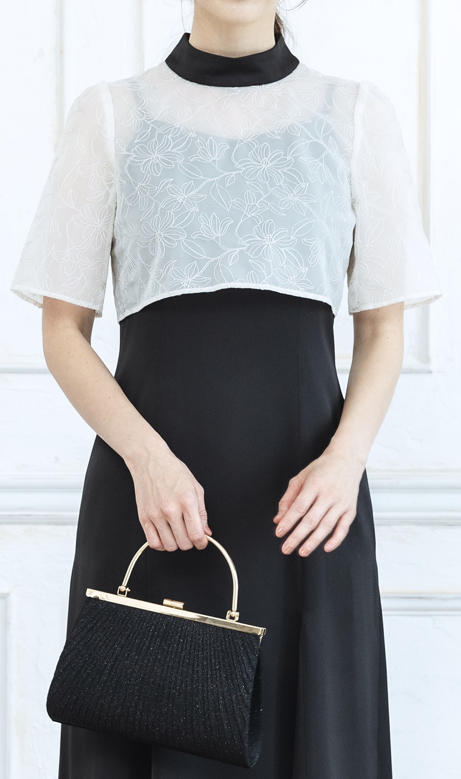 トップ部分の花柄レースが華やかで印象的なハイネックワンピースドレス。