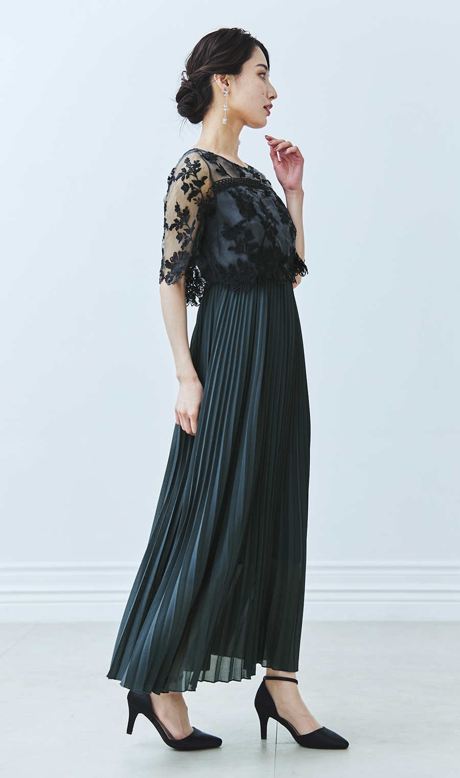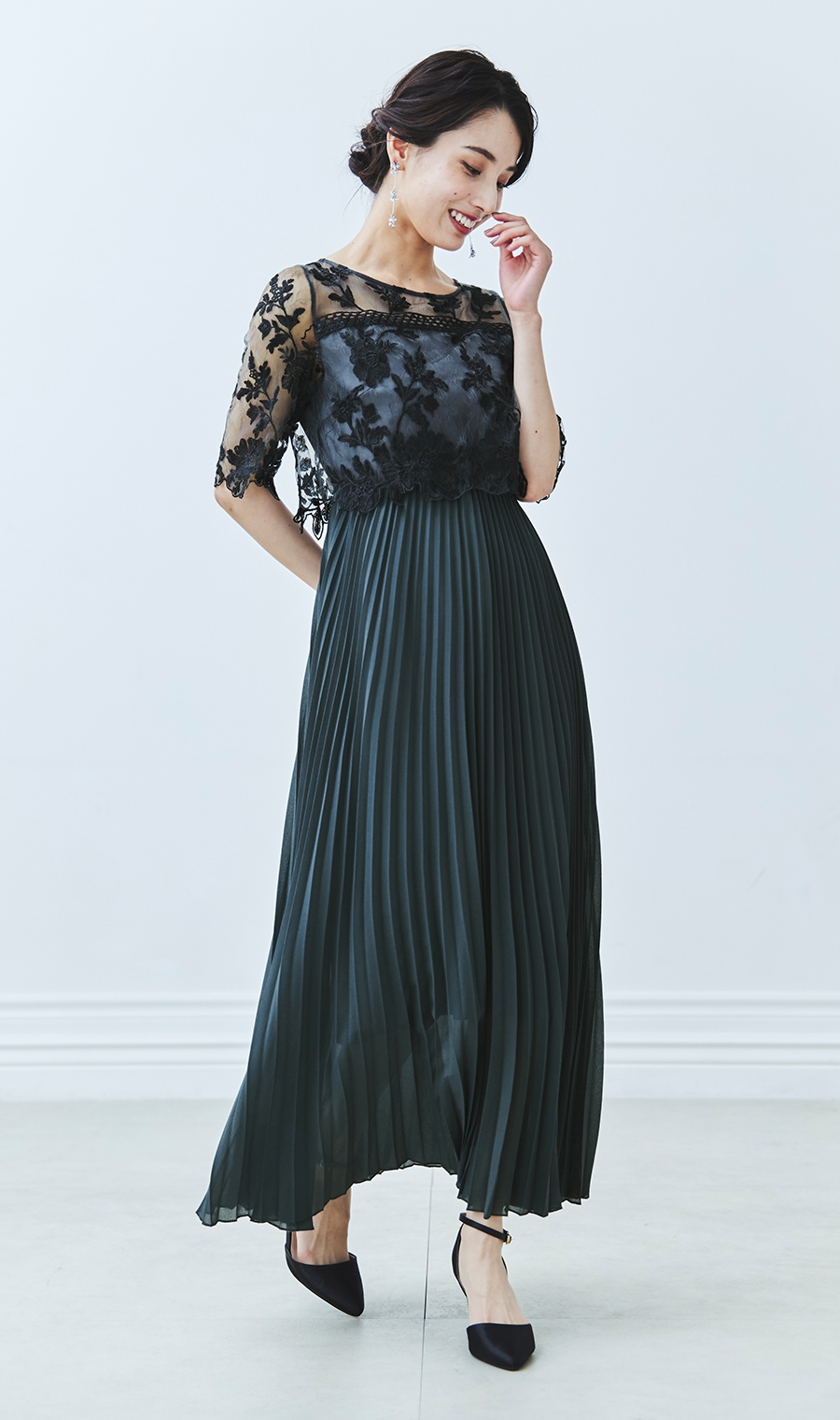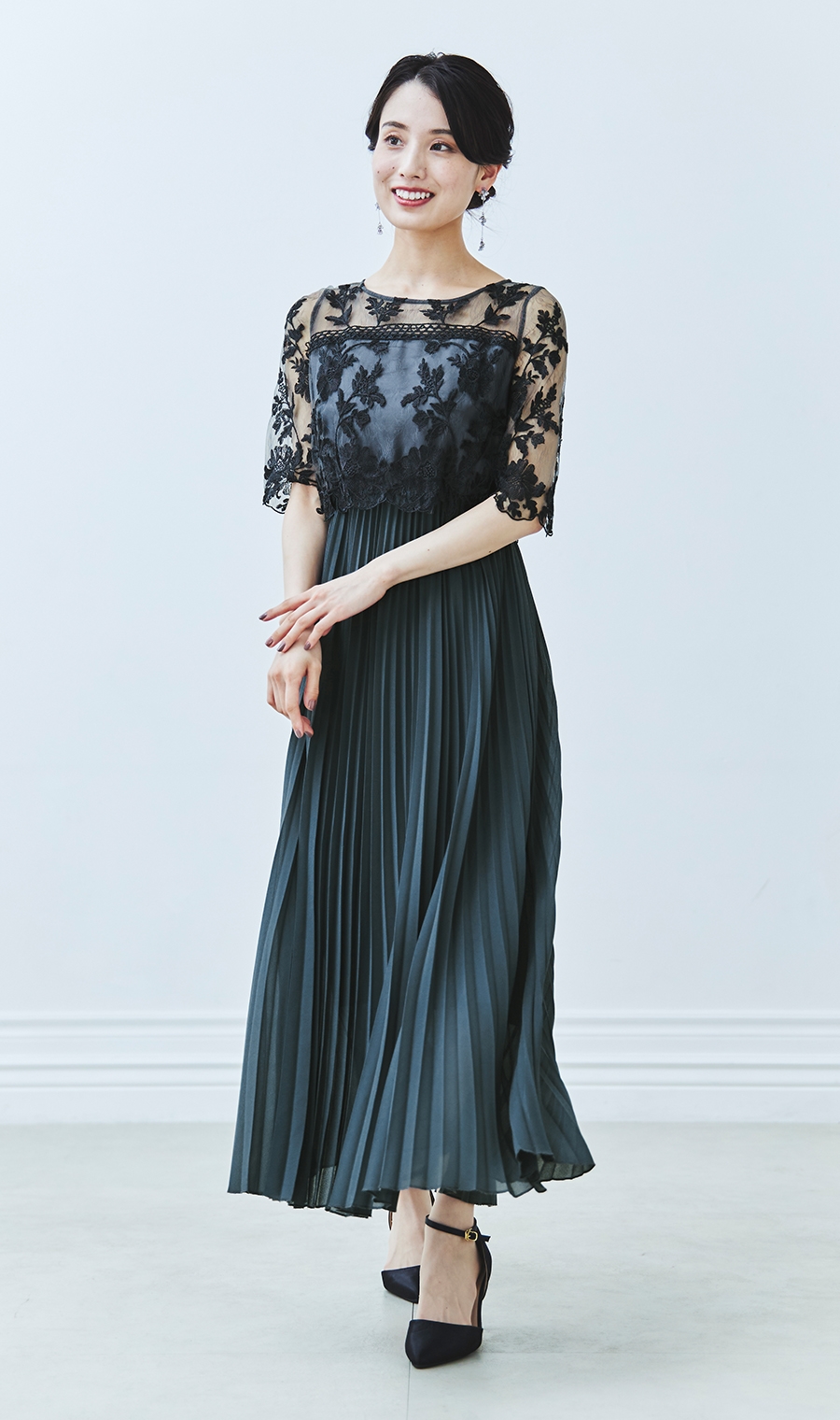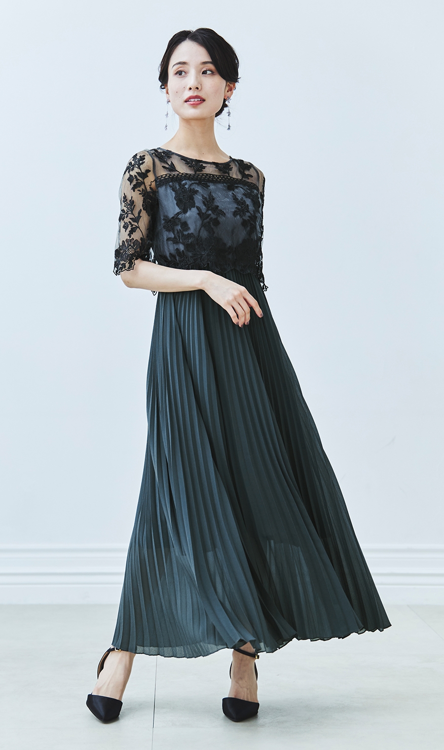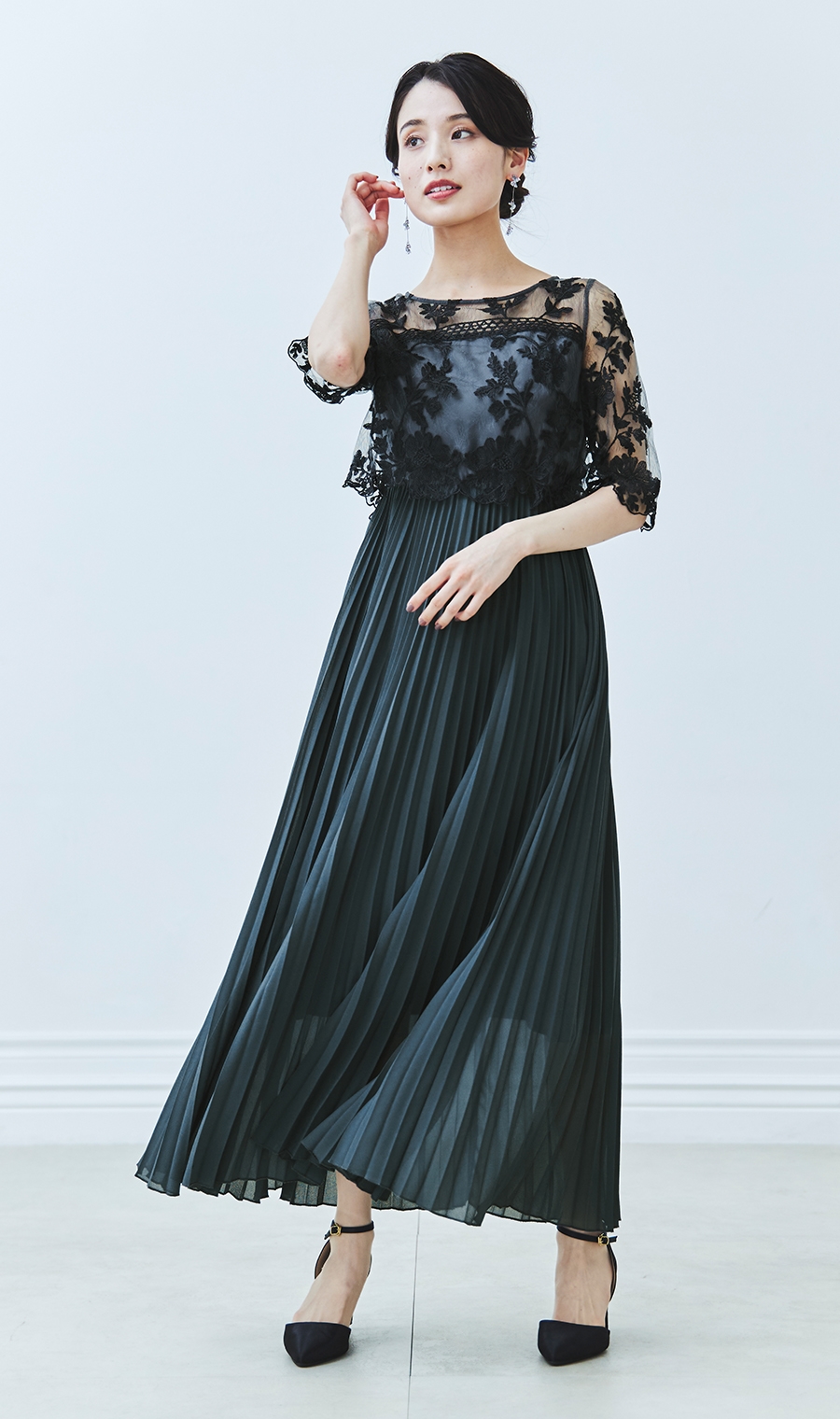 【刺繍レース切替プリーツロングドレス】
