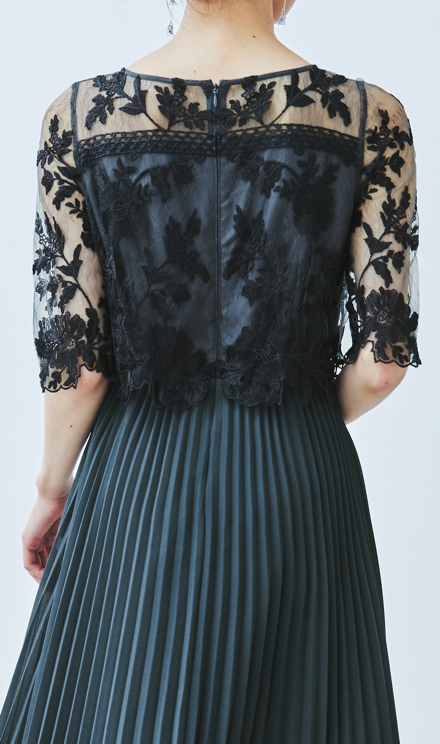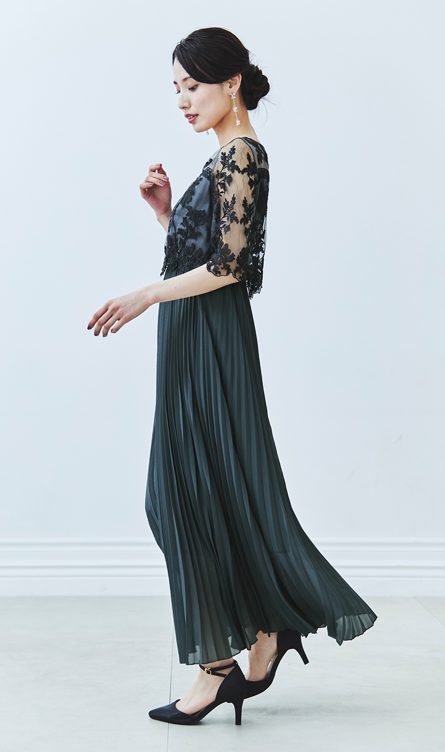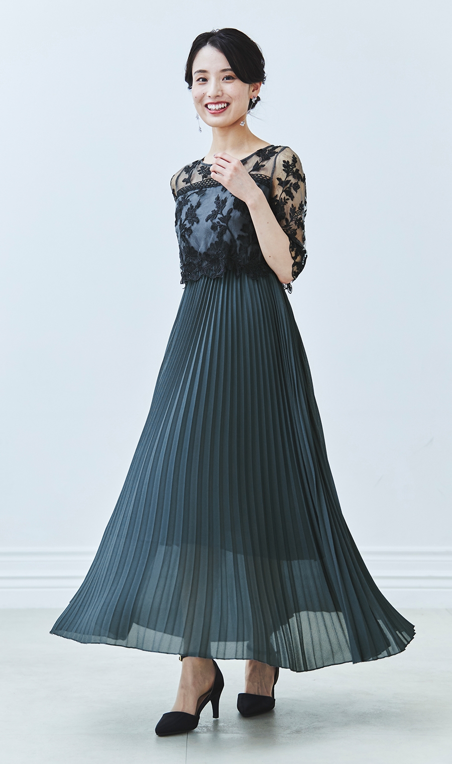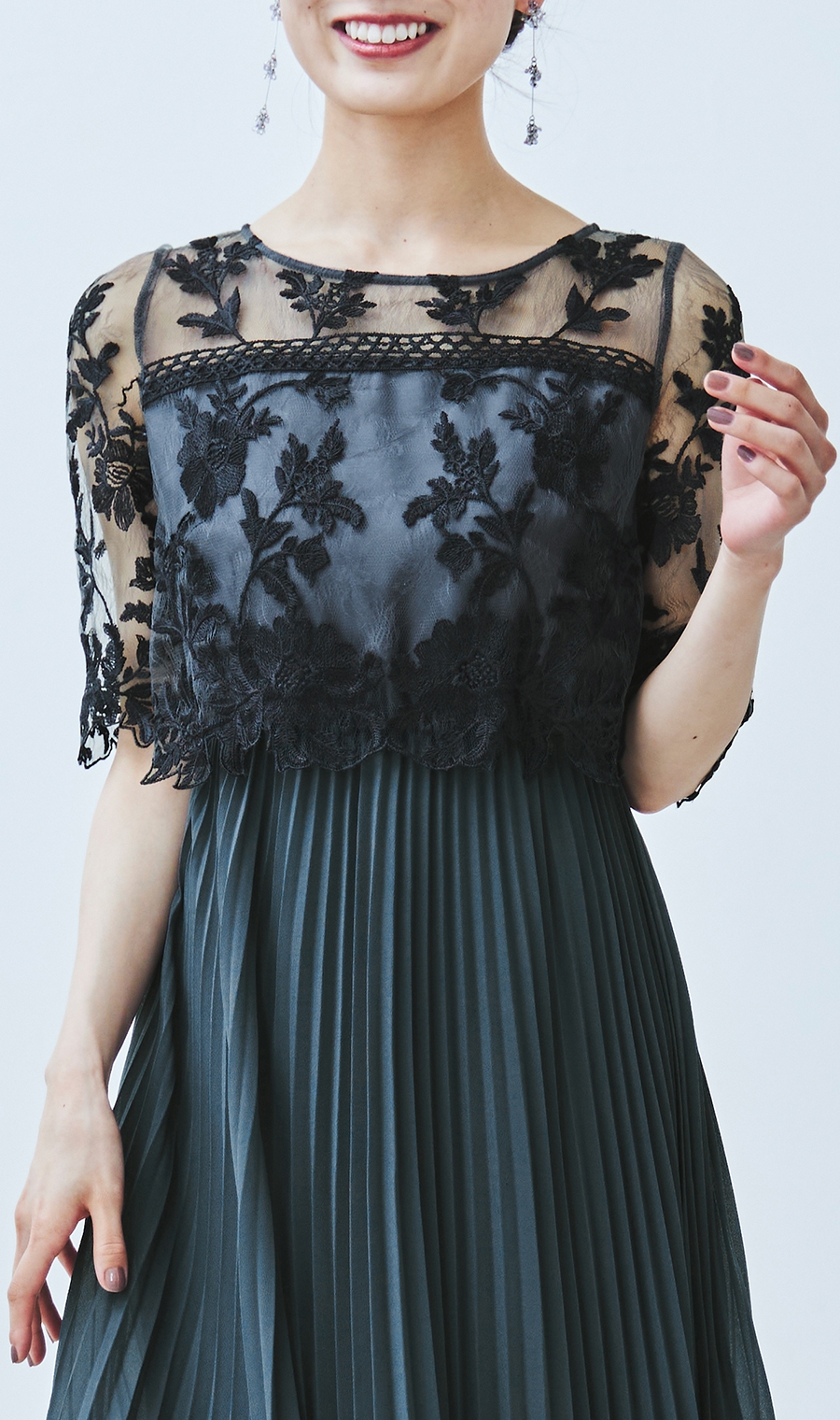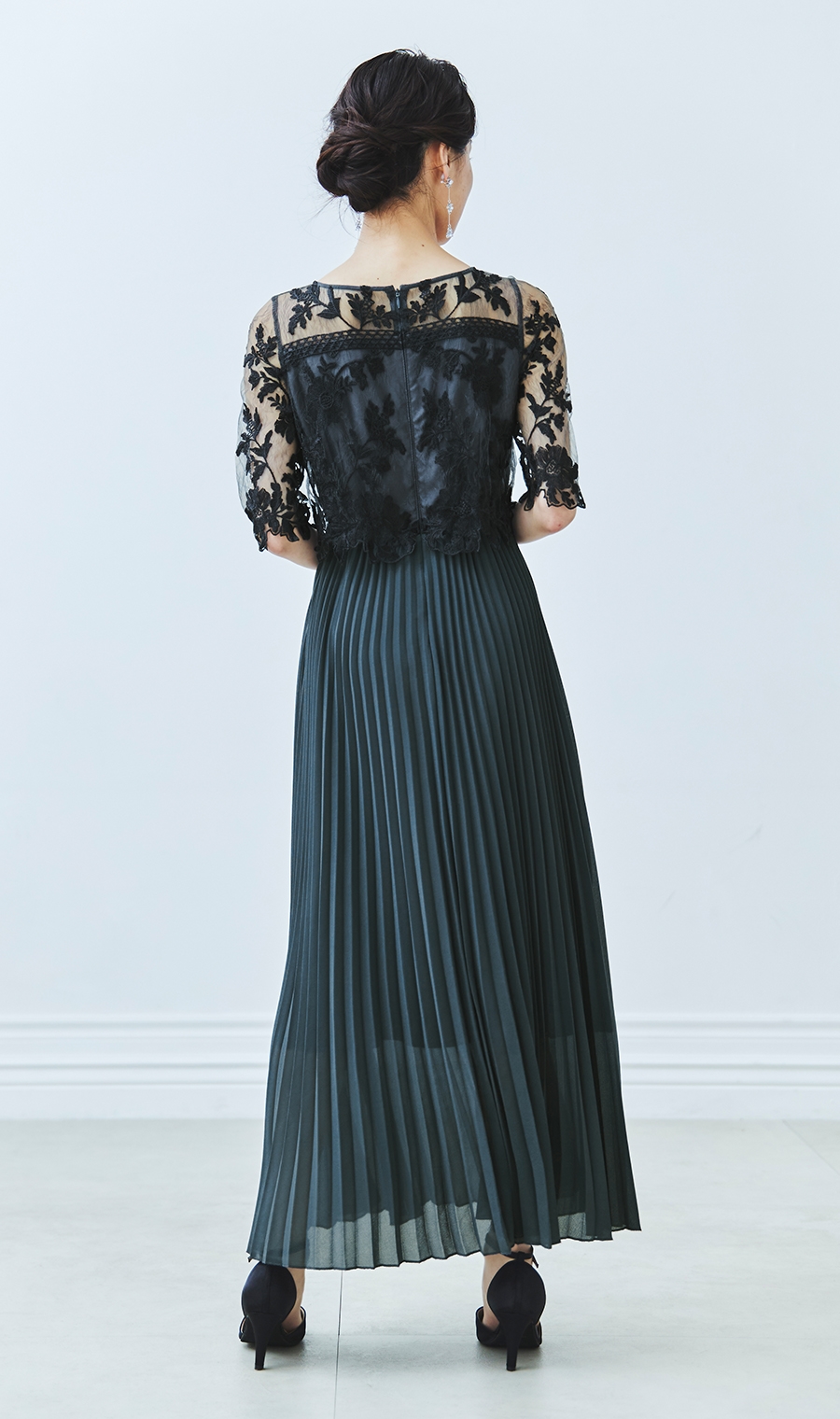 【刺繍レース切替プリーツロングドレス】