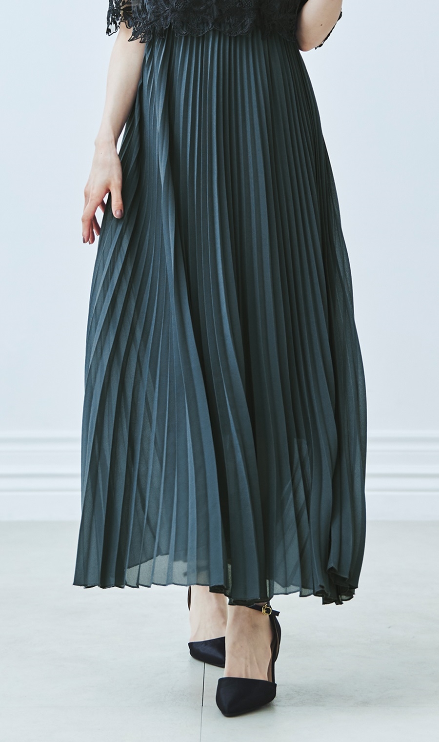 プリーツの動きもキレイ。レースの柄も落ち着いた印象で良いです。
