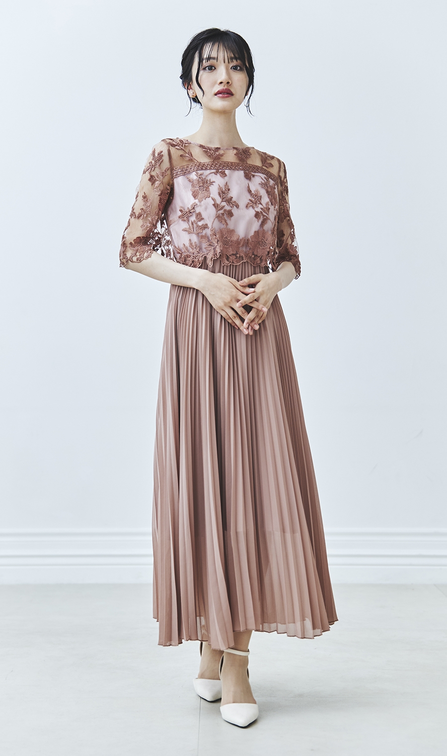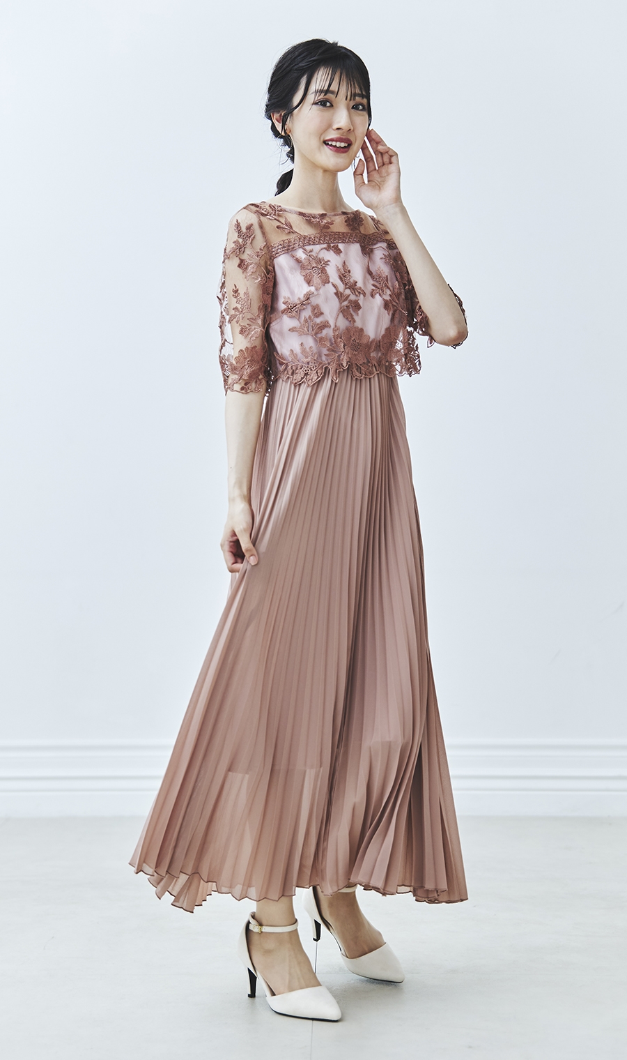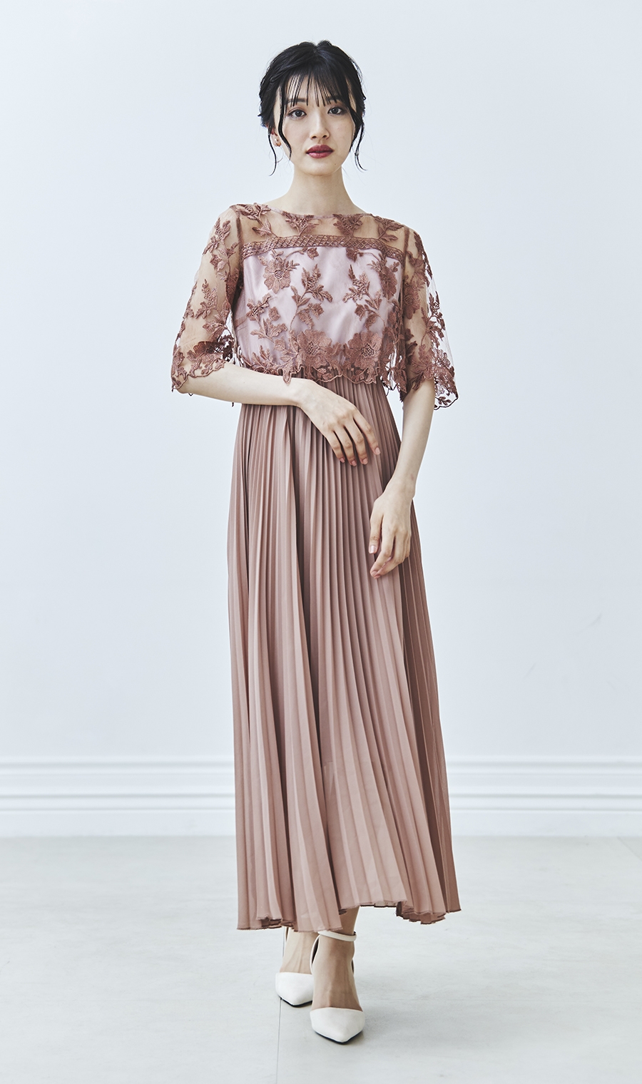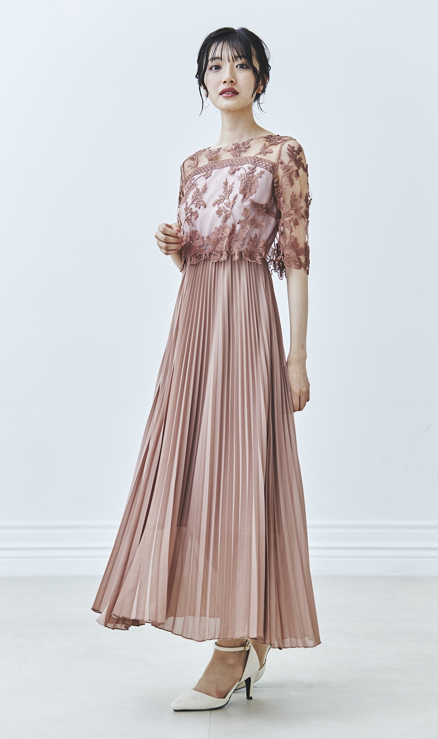 【刺繍レース切替プリーツロングドレス】