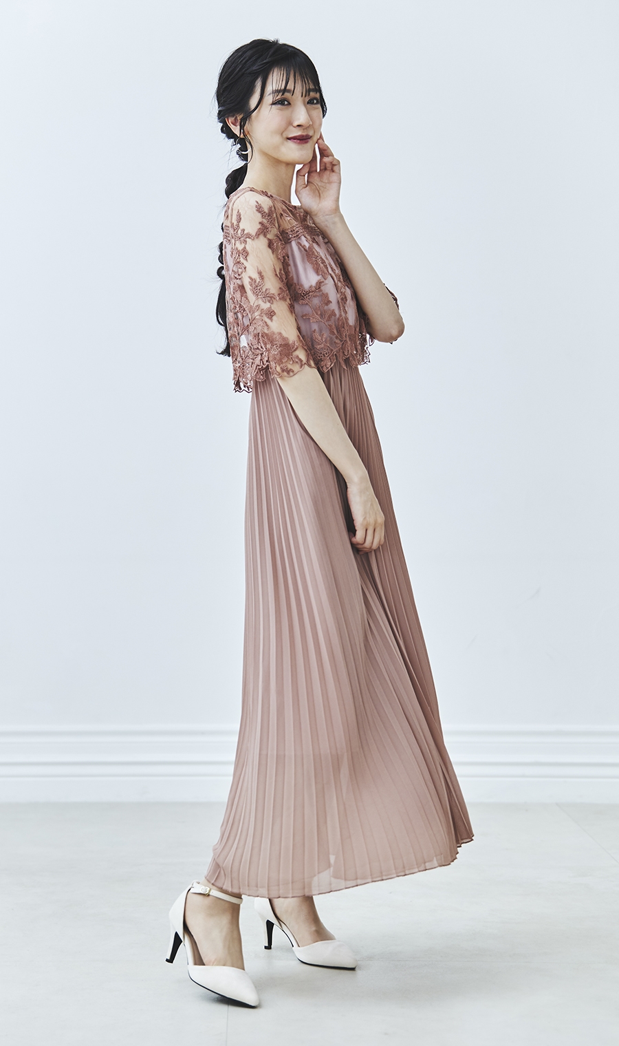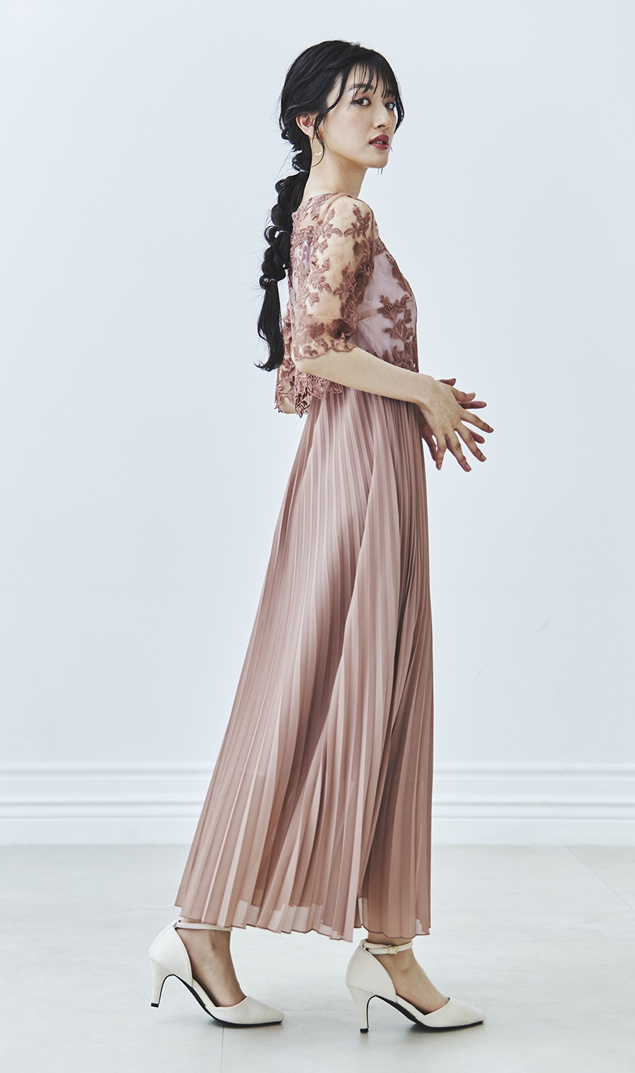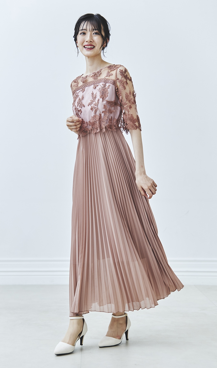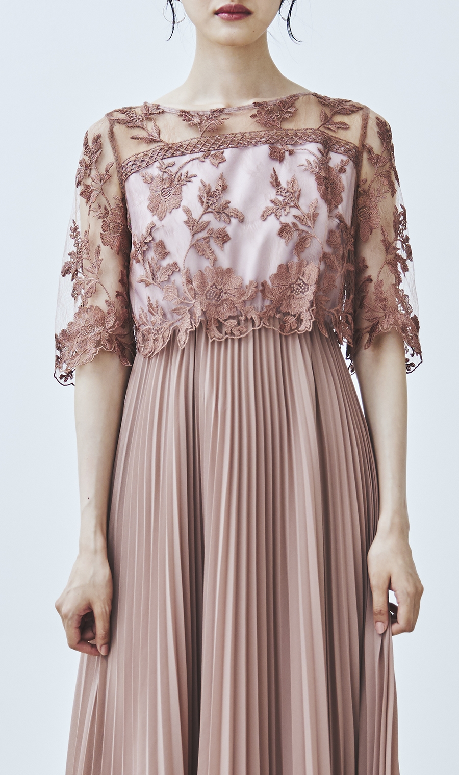 【刺繍レース切替プリーツロングドレス】