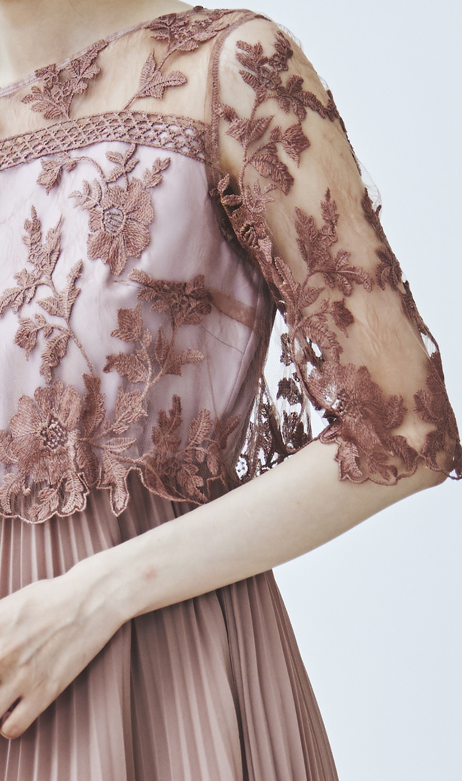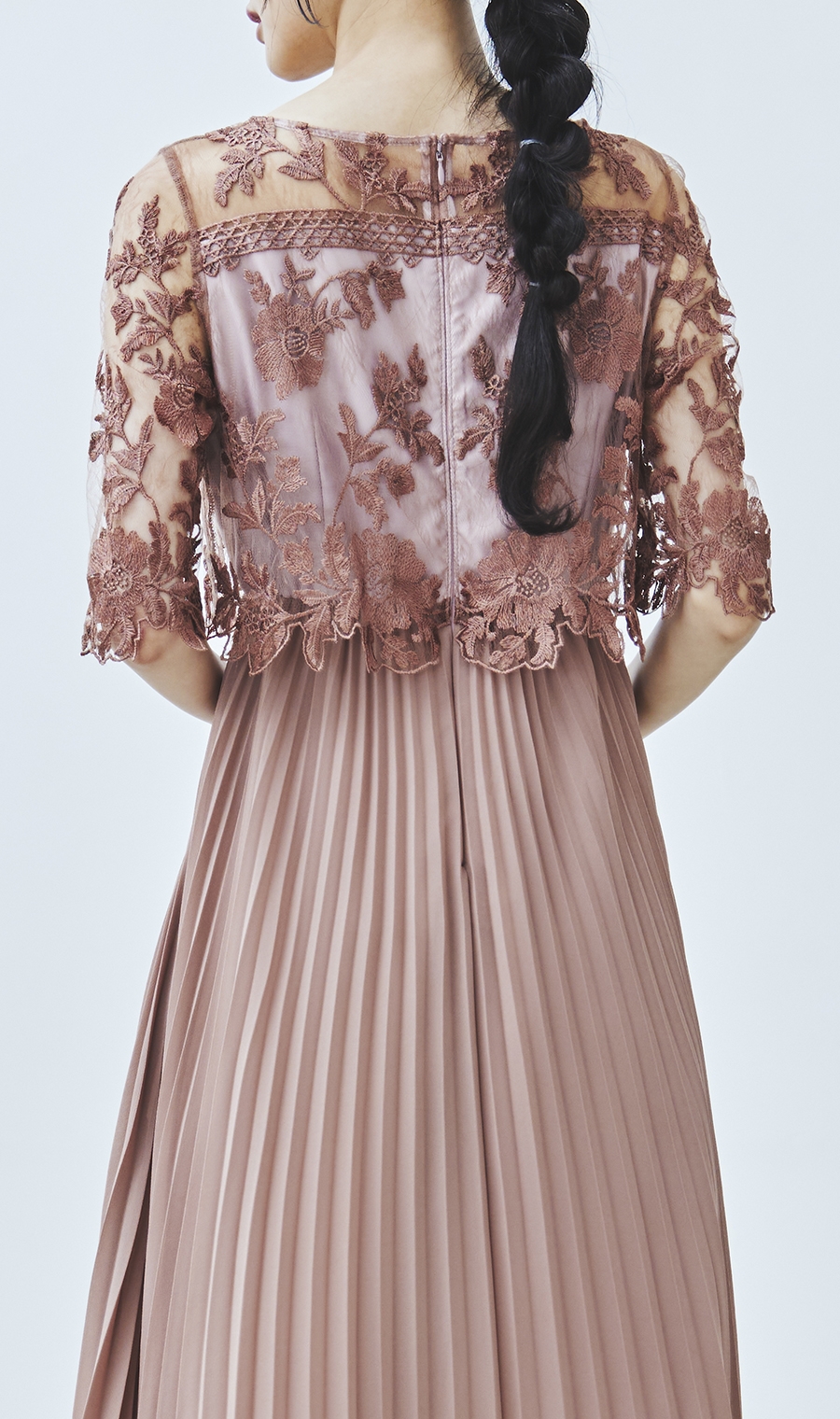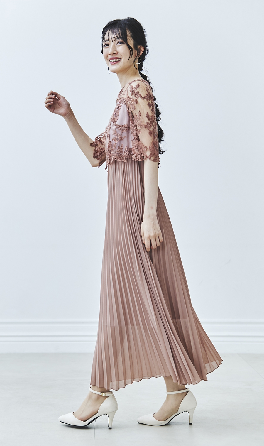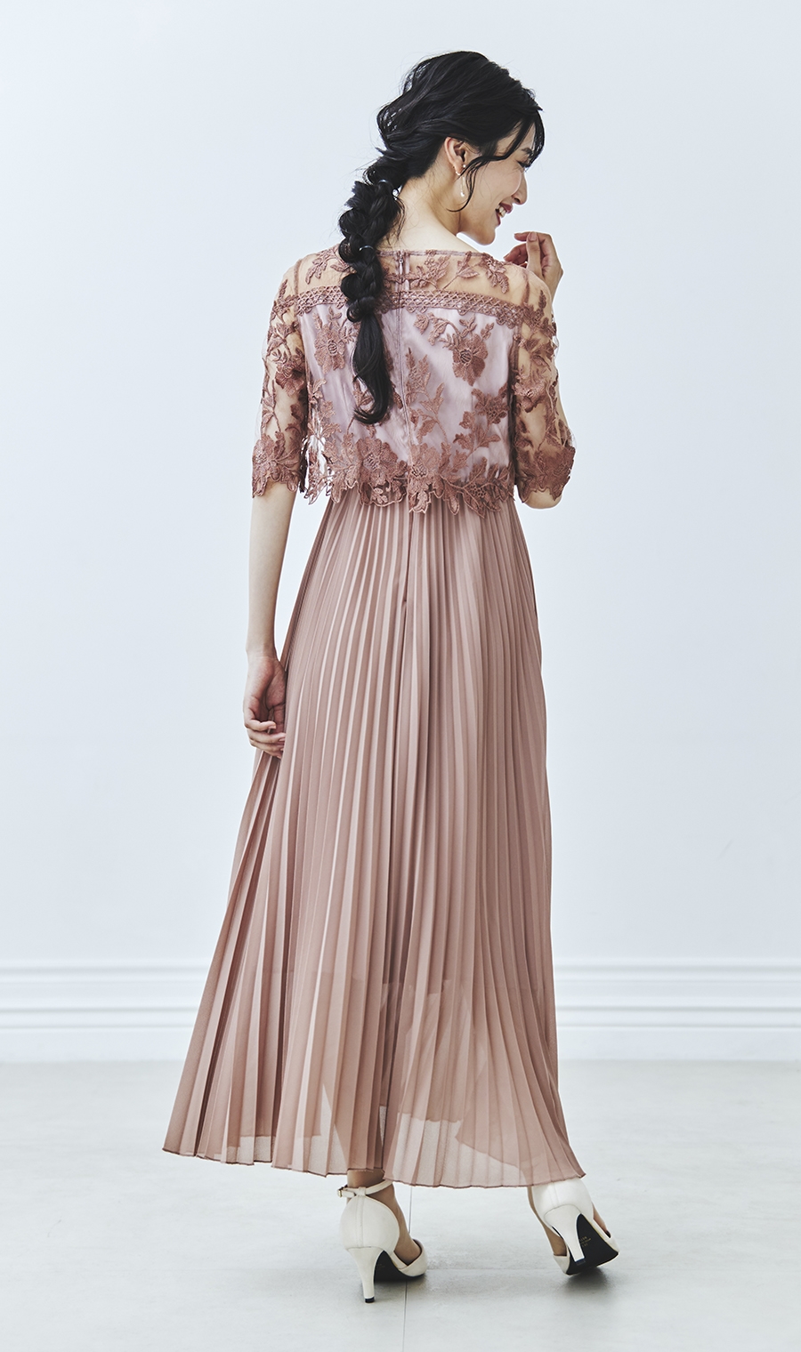 【刺繍レース切替プリーツロングドレス】