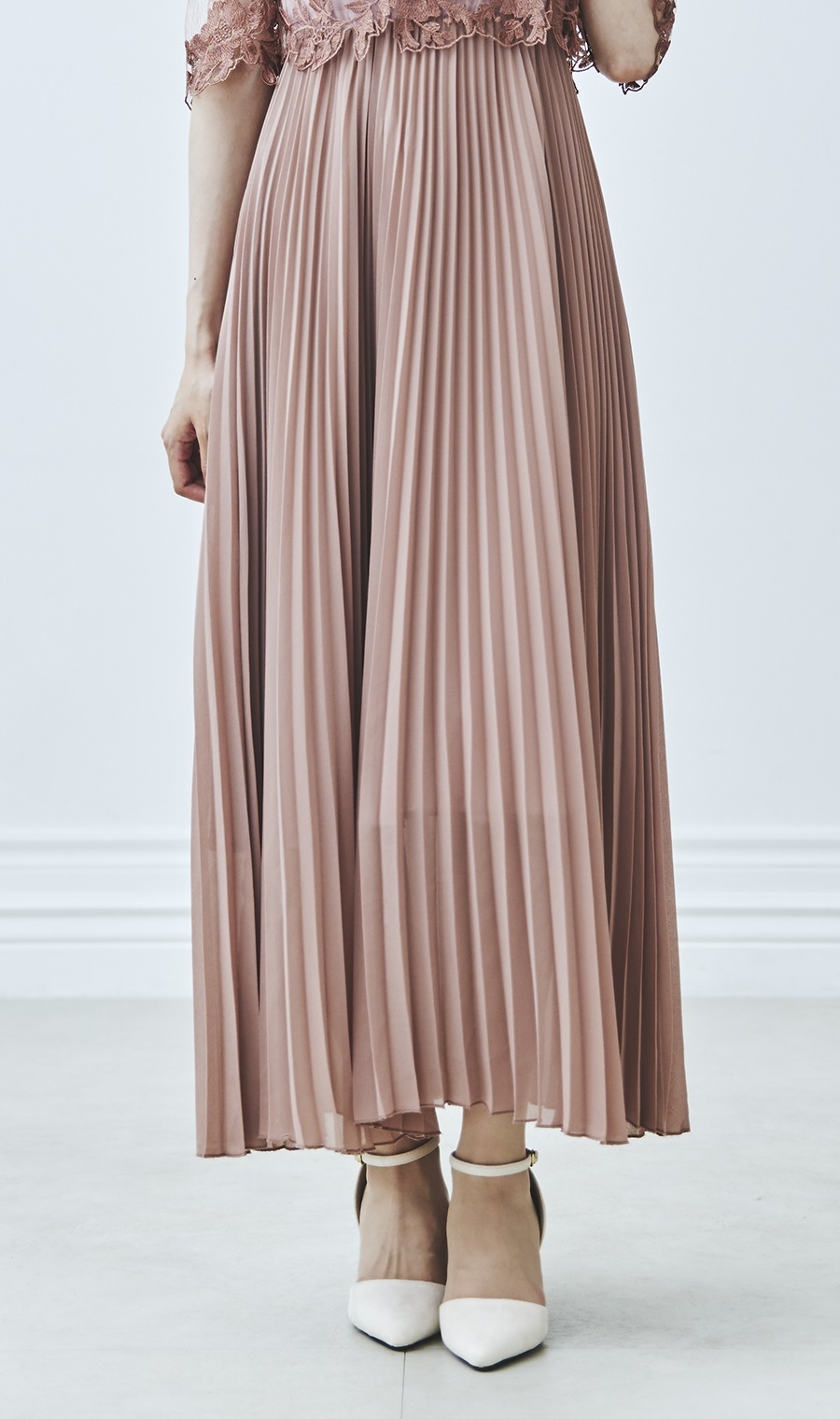 細やかなプリーツスカートを組み合わせたロングドレス。