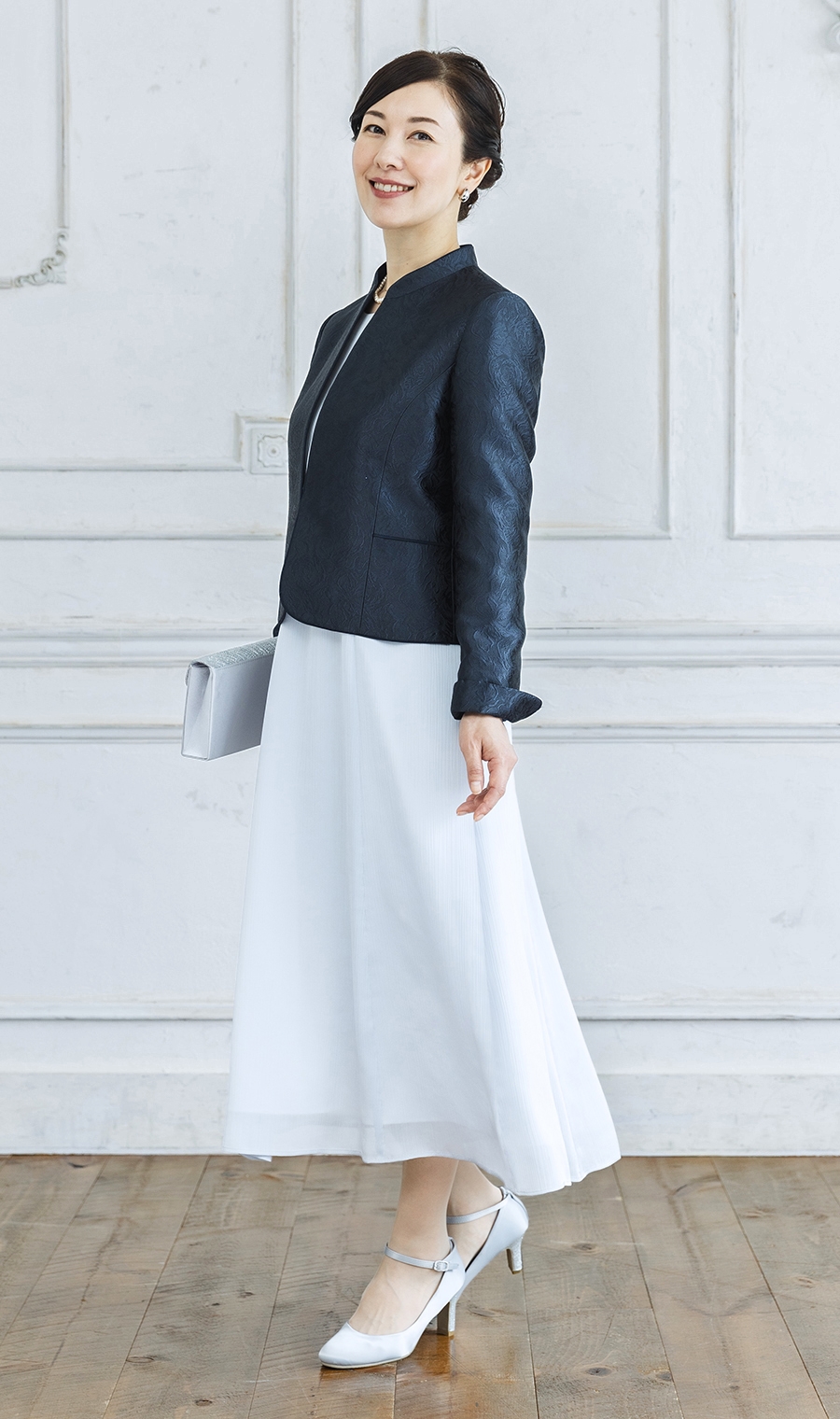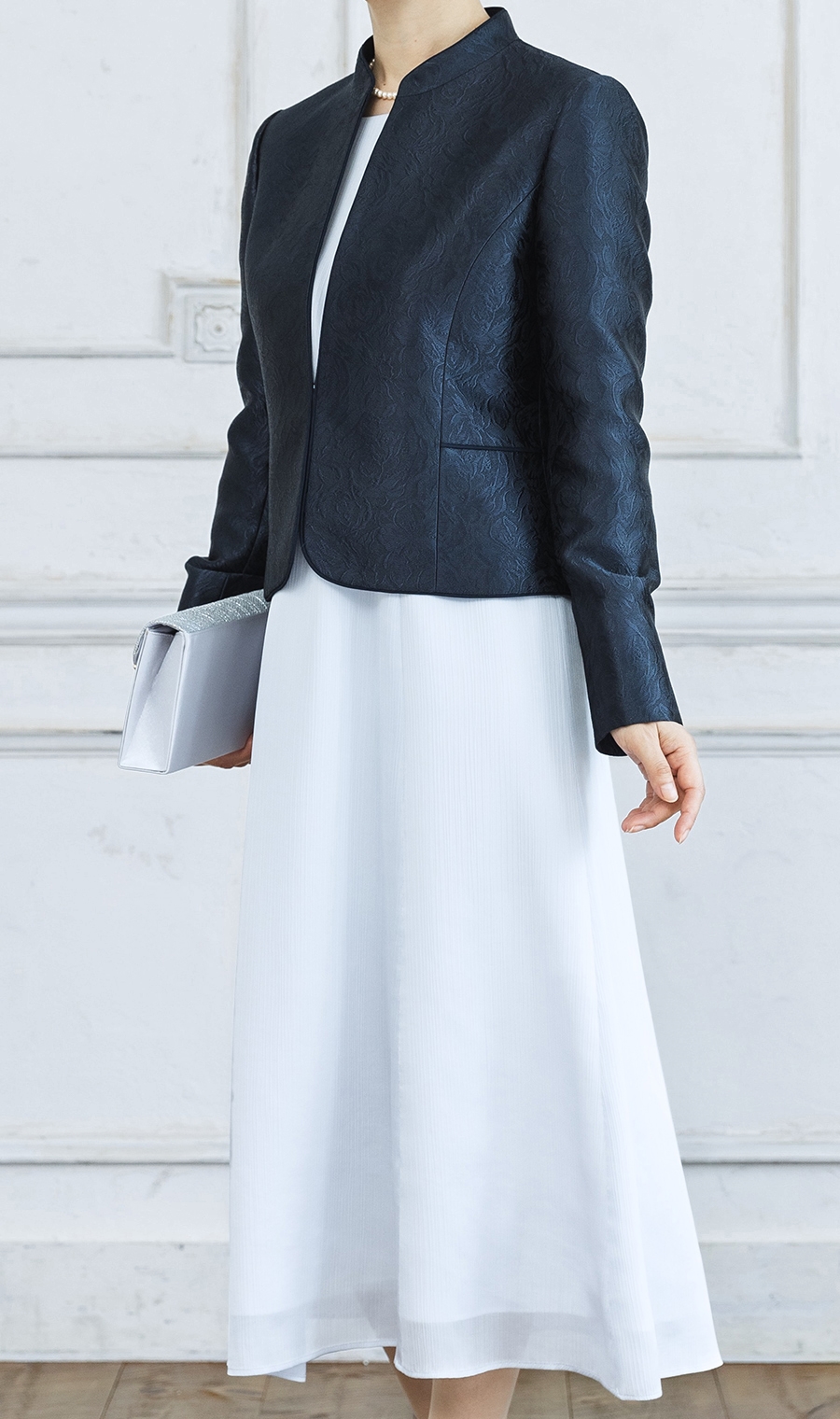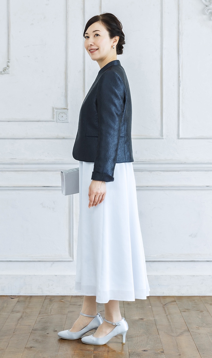 高級感のあるフクレジャカードのジャケットとブラウスとスカートを着たように見えるトリックワンピースの組み合わせ。