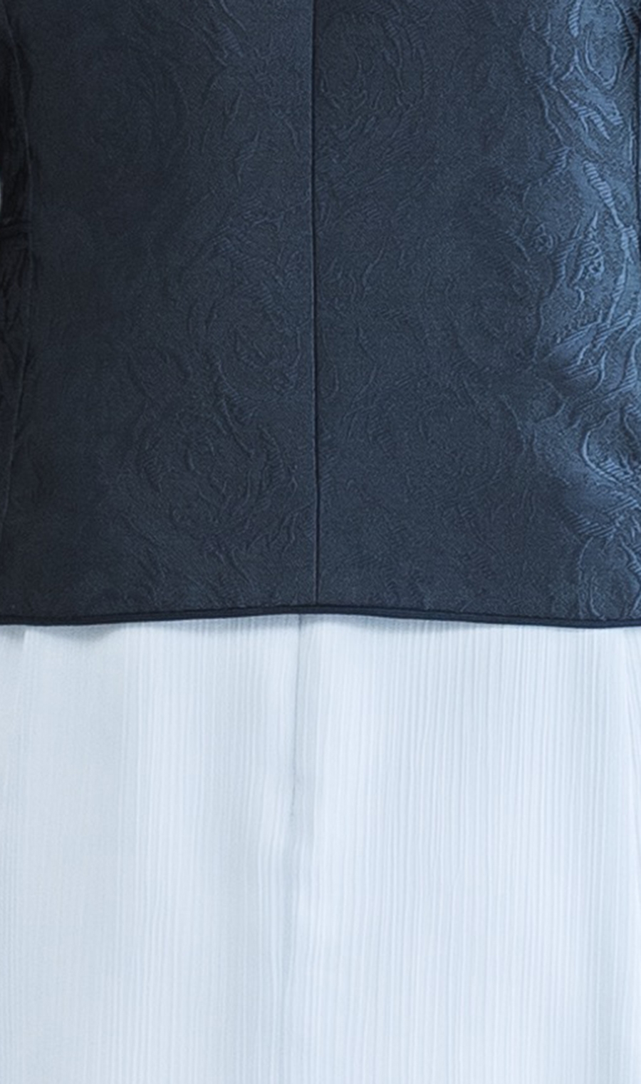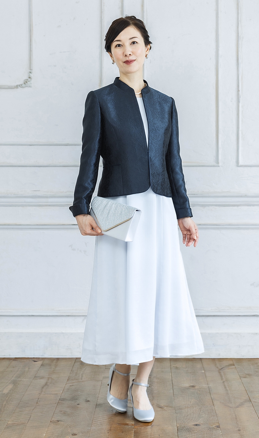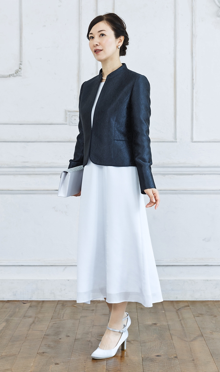 高級感のあるフクレジャカードのジャケットとブラウスとスカートを着たように見えるトリックワンピースの組み合わせ。