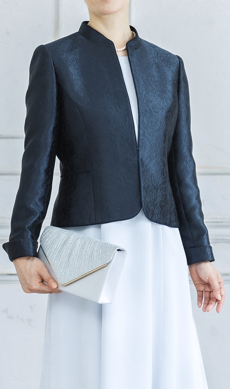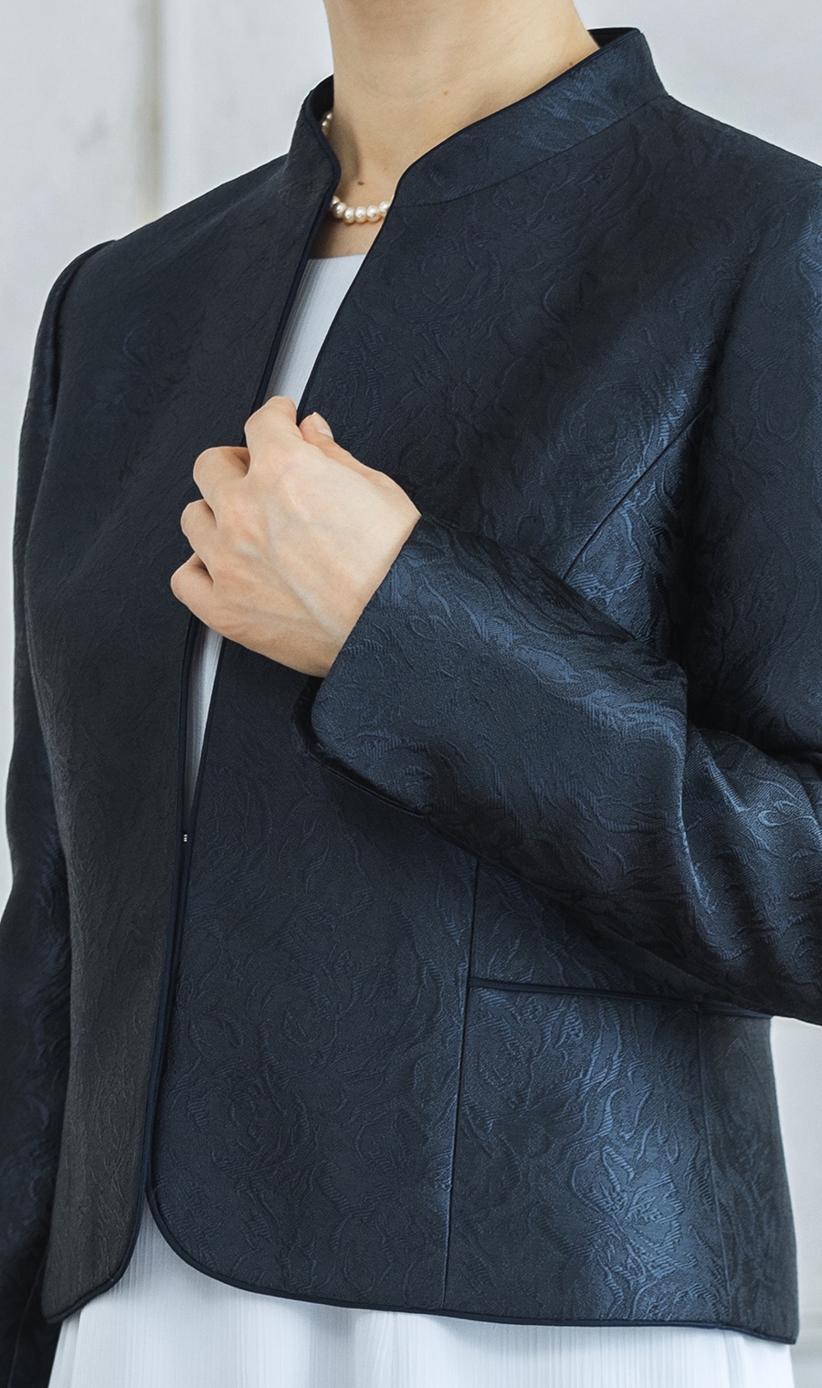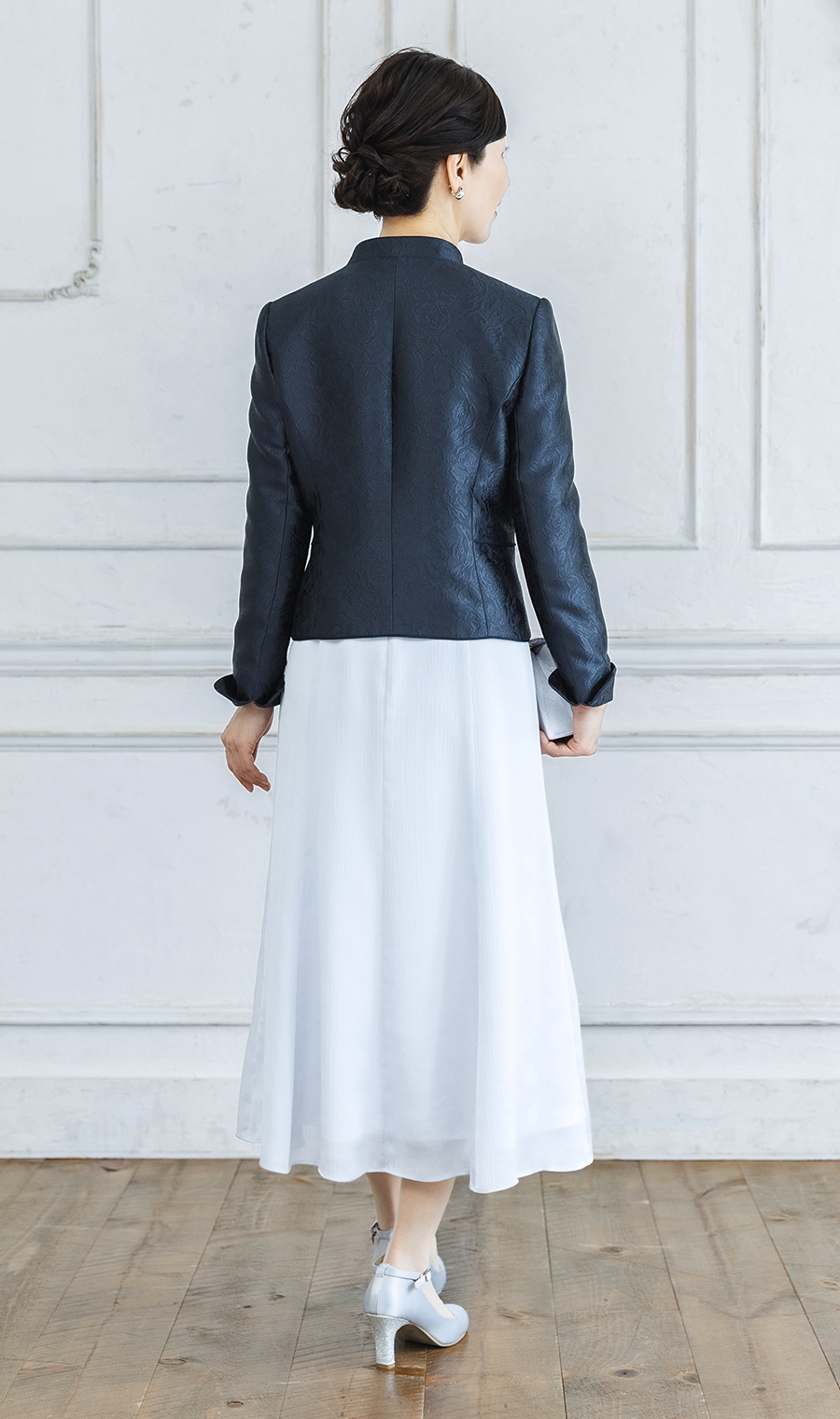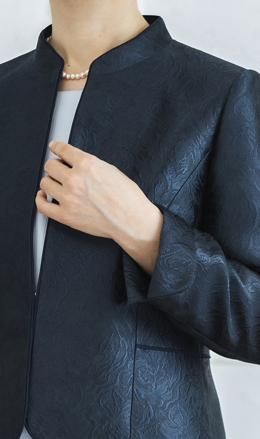 低めのスタンドカラーで上品な印象に見せつつ、首元をカバーして肌を見せすぎないフォーマルシーンに配慮したデザインです。