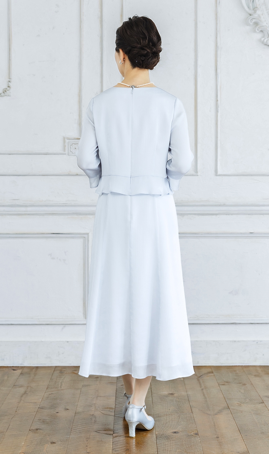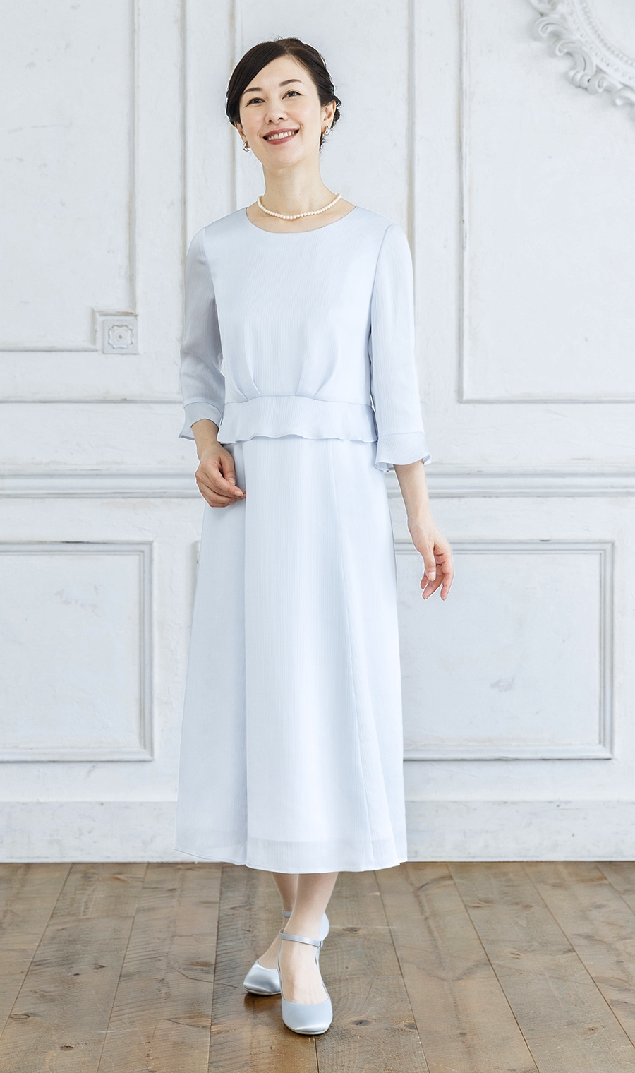 ワンピースはシボ感のある楊柳ですが、カジュアルな印象にならない美しい光沢感と楚々としたほのかな凹凸で、品よくまとめています。