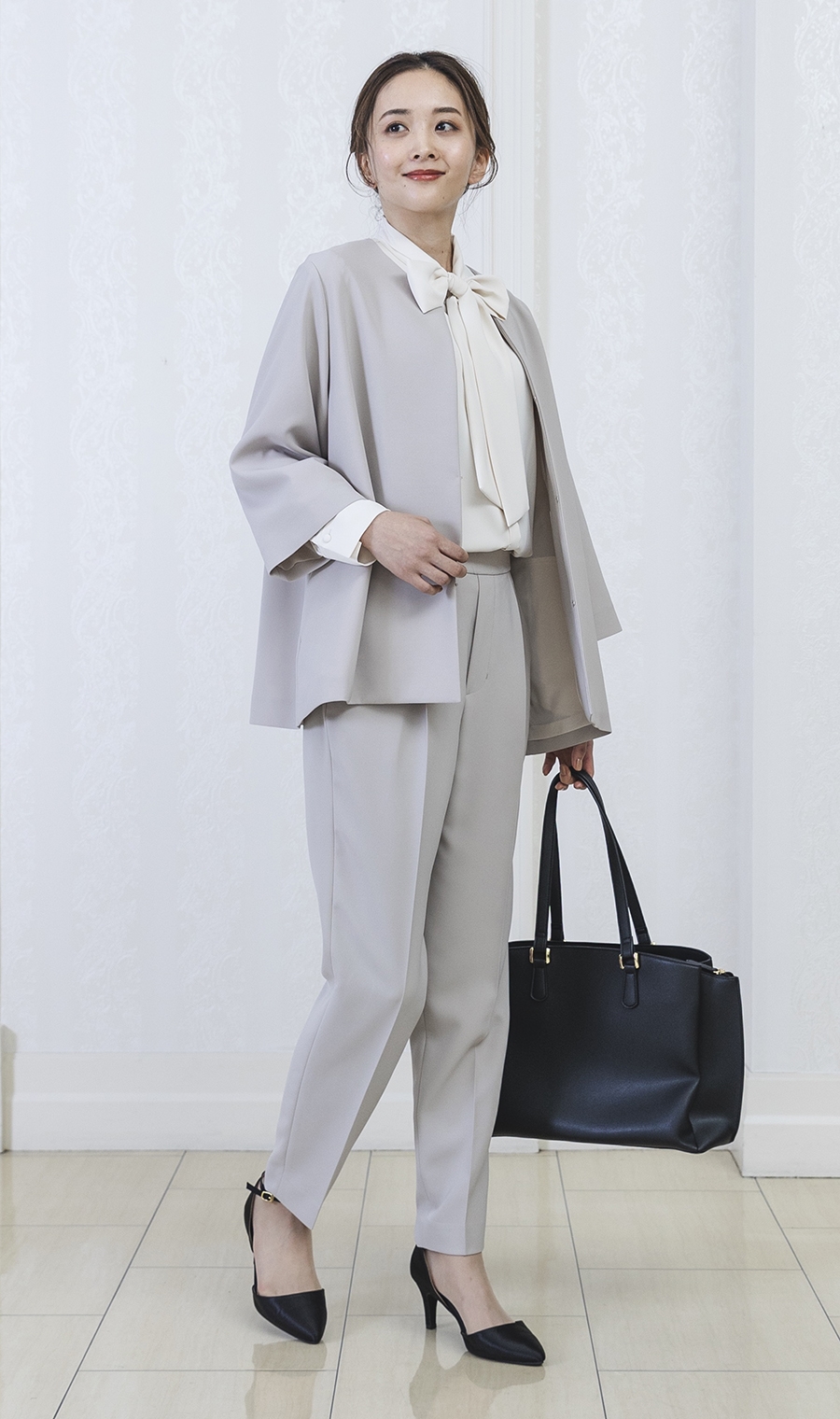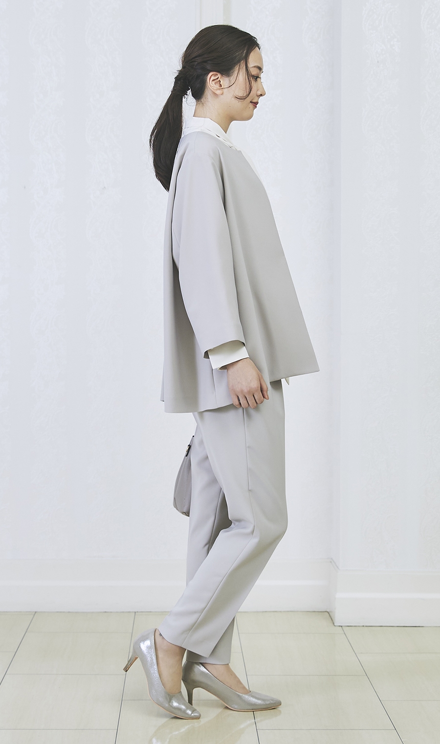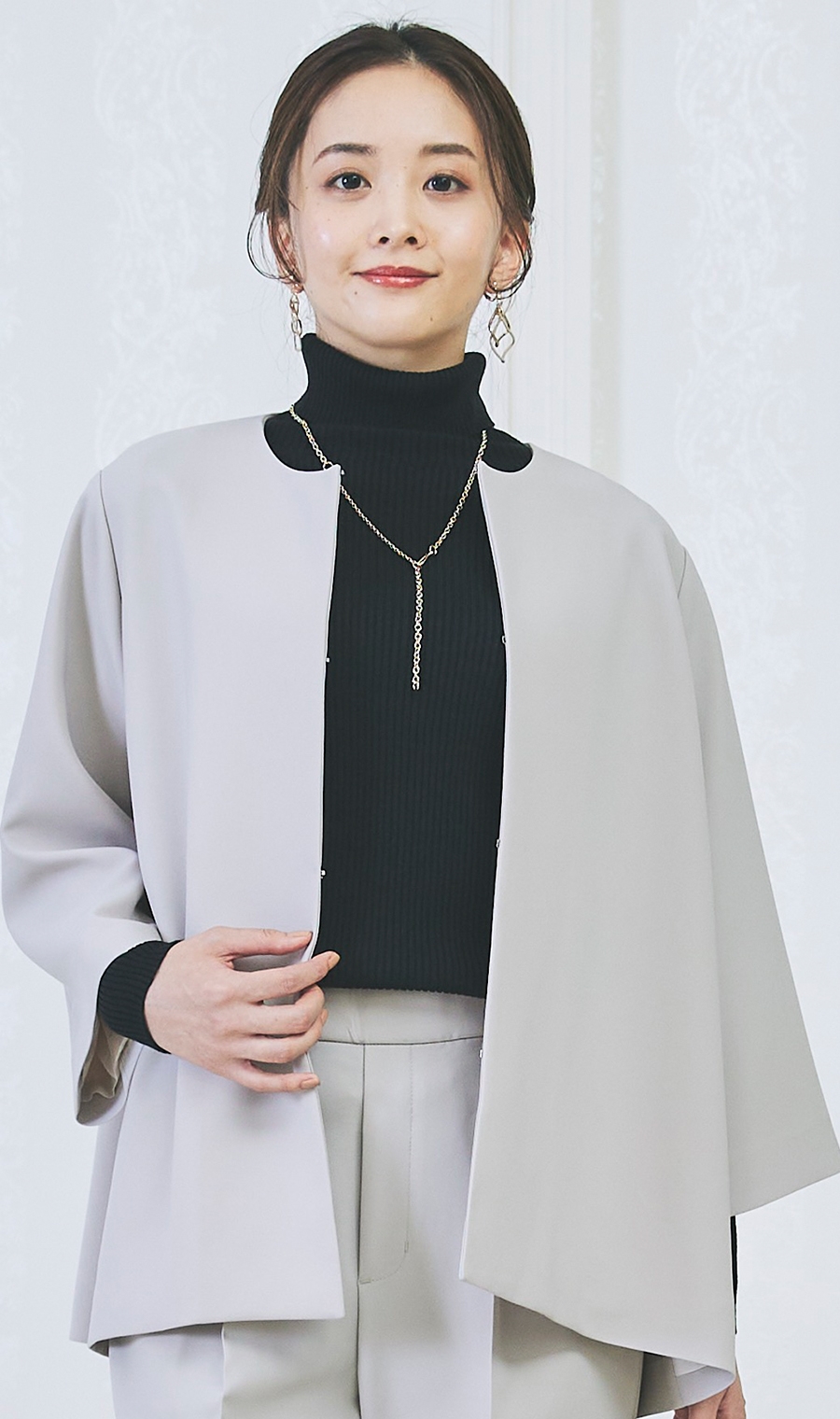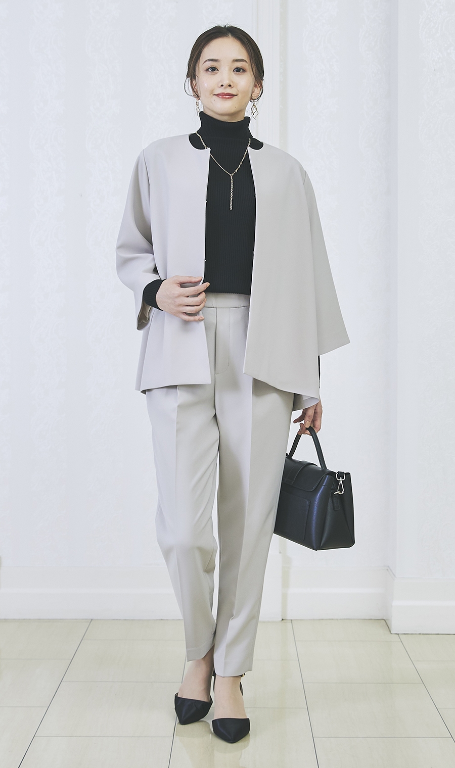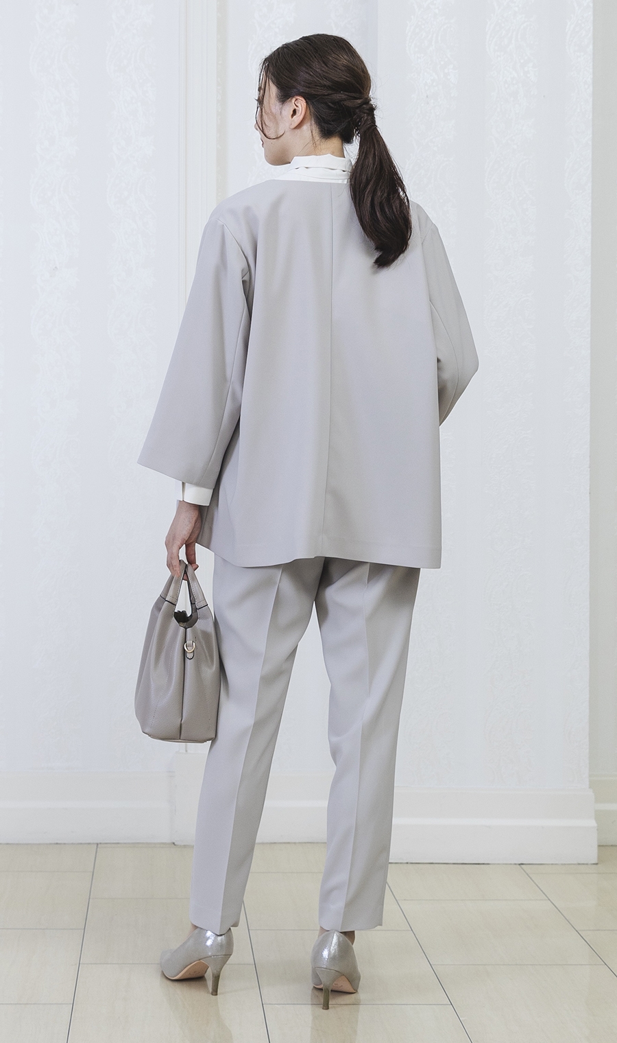 Aラインシルエットが特徴的なノーカラージャケットとテーパードパンツの