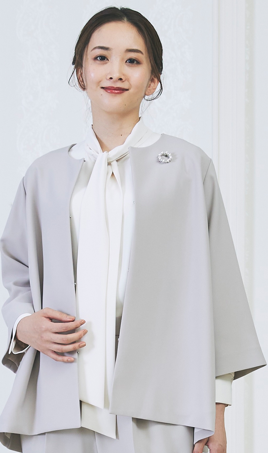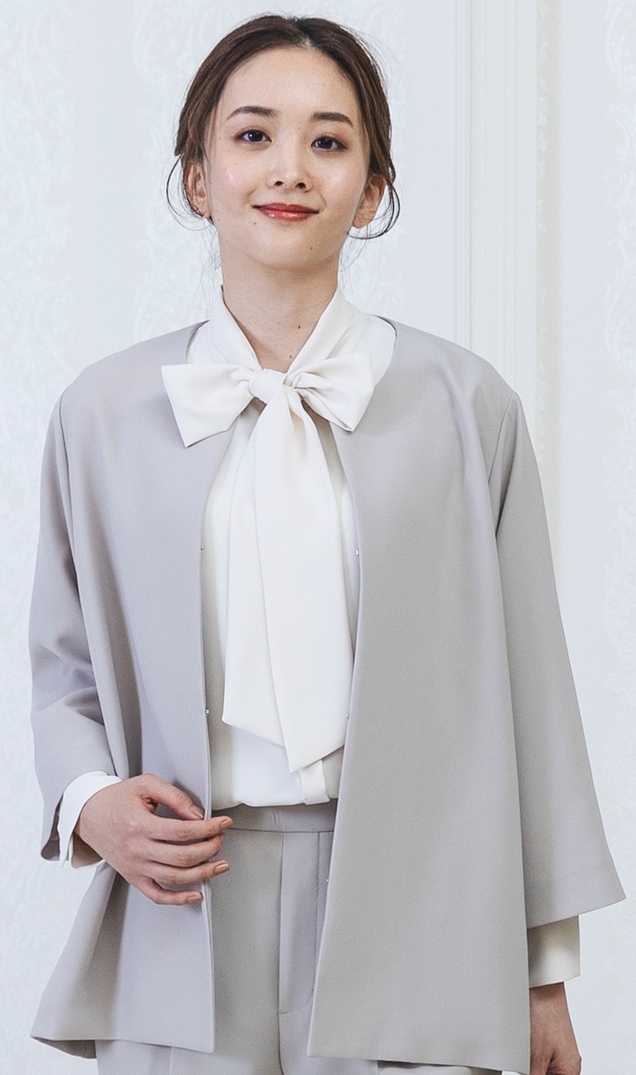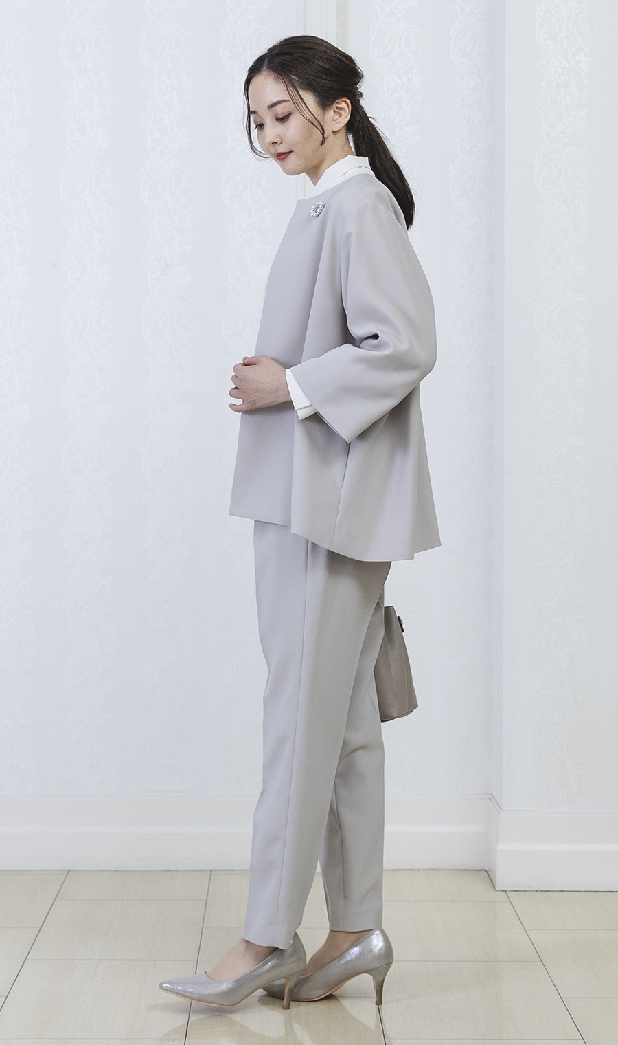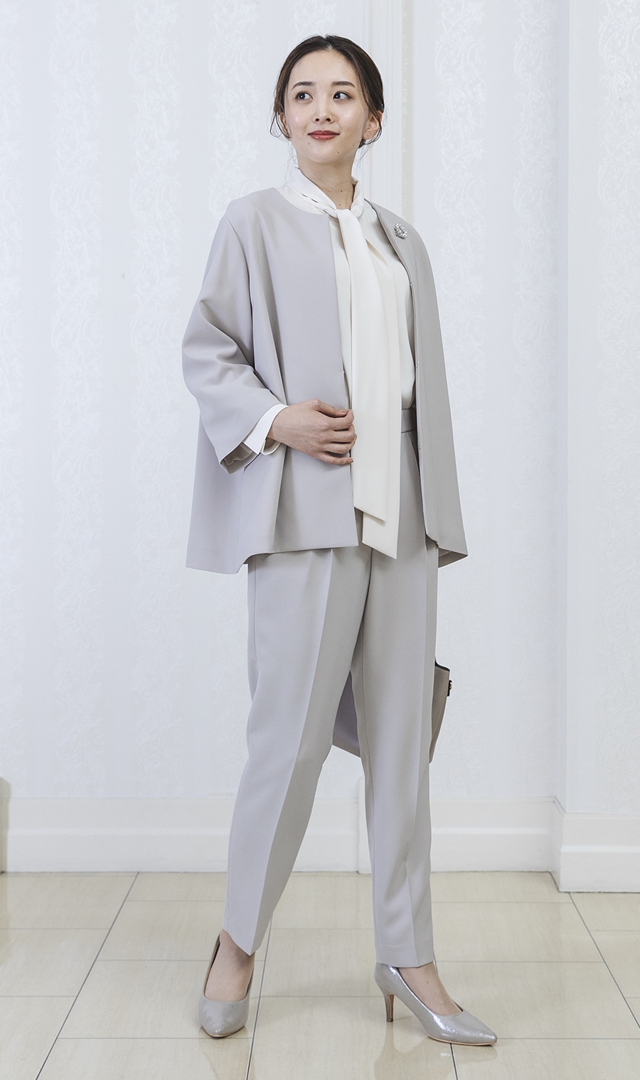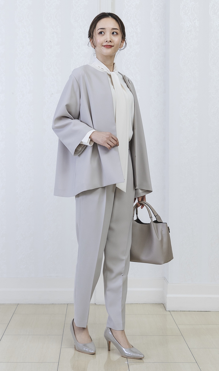 Aラインシルエットが特徴的なノーカラージャケットとテーパードパンツの