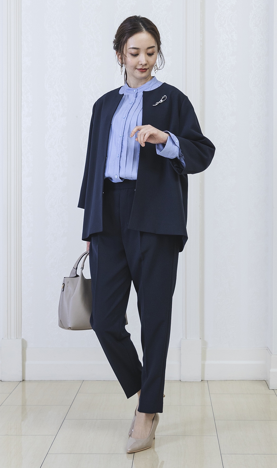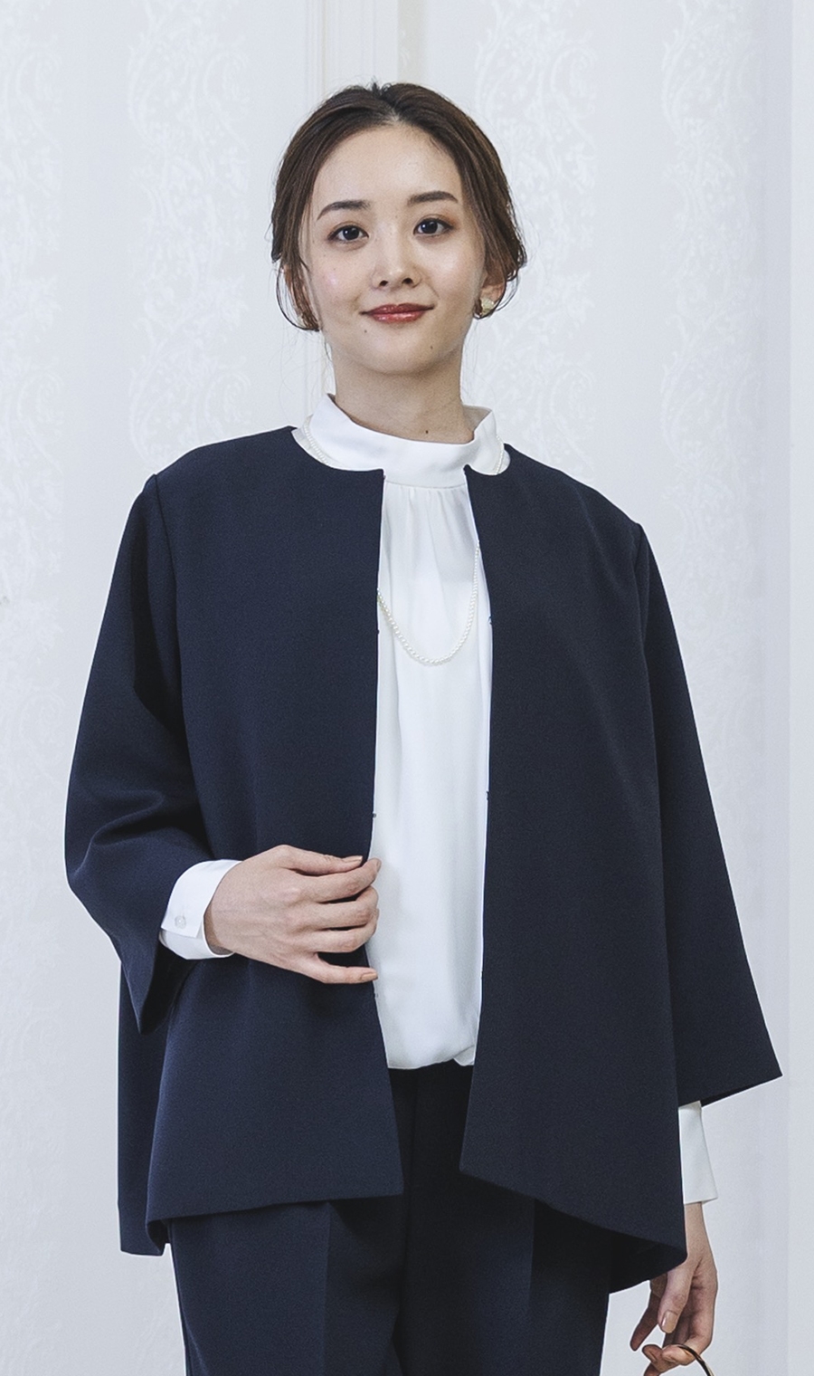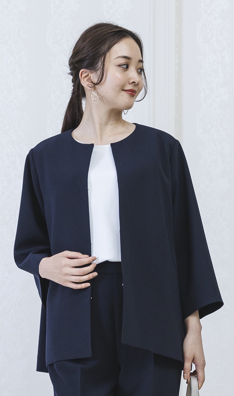 Aラインシルエットが特徴的なノーカラージャケットとテーパードパンツの